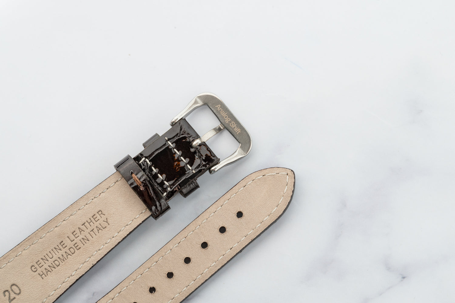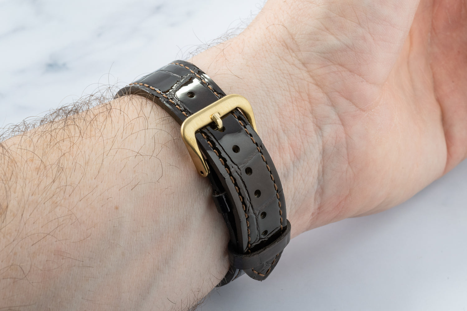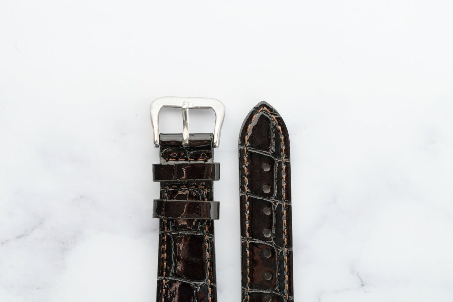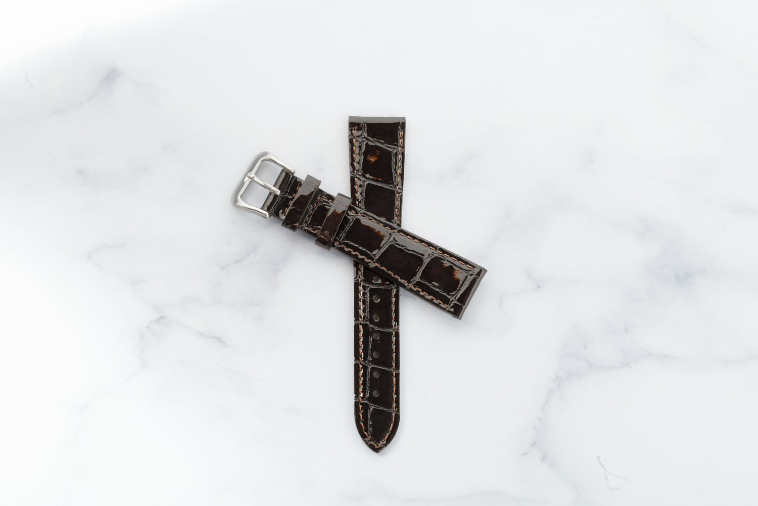 The Hayworth Brown Gloss Alligator-Pattern strap is produced in a rich, dark chocolate brown tone with caramel stitching — an elegant staple accessory item for precious metal and steel cases alike!