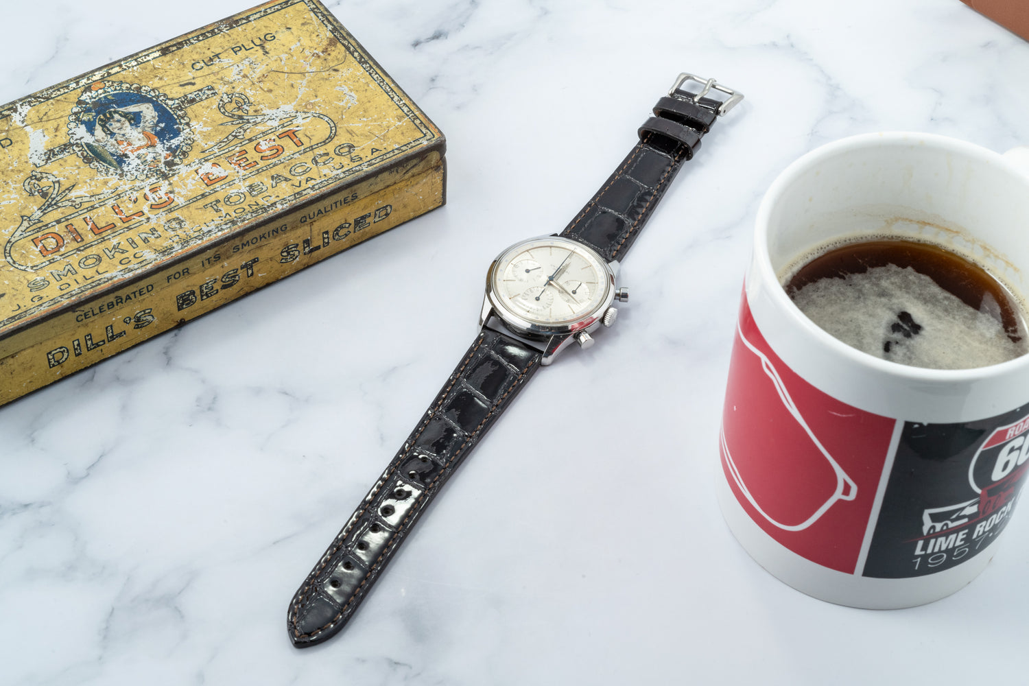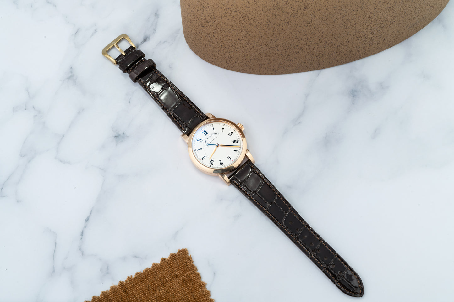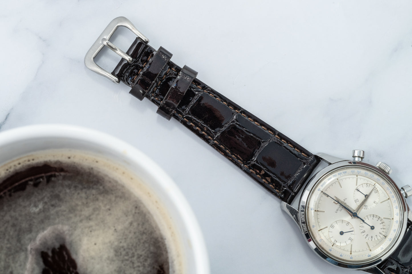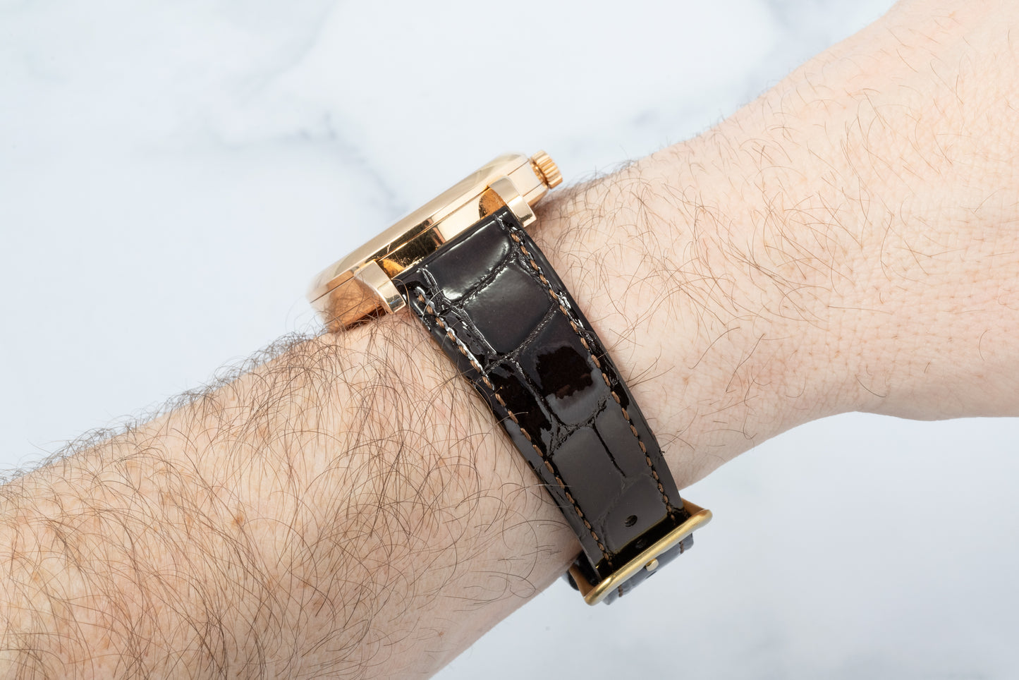 The Hayworth Brown Gloss Alligator-Pattern strap is produced in a rich, dark chocolate brown tone with caramel stitching — an elegant staple accessory item for precious metal and steel cases alike!