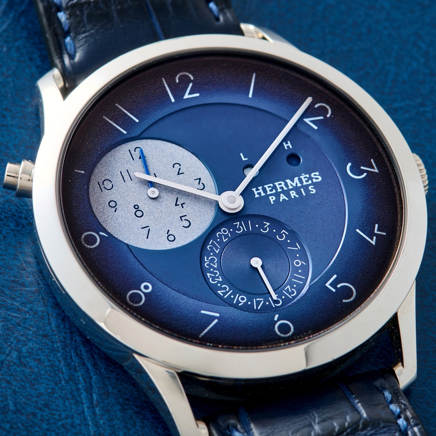 The strap, naturally, is where the maison flexes quietly. The Bleu Abyss alligator feels as luxurious as anything coming out of the Paris ateliers, and the color anchors the whole composition. There’s a completeness to this watch—dial, case, typeface, complication, strap—that feels almost architectural. Every element seems pulled taut, reduced, intentional.