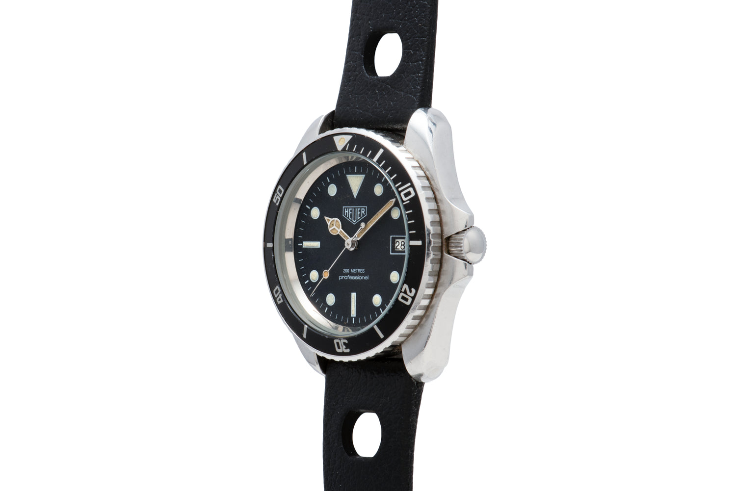 This watch, a Reference 844-1, was amongst the very first Heuer dive watches introduced in 1979. Featuring a contracted 42mm 'Monnin' case equipped with a rotating dive bezel and an unsigned crown nestled between a set of crown guards, this piece houses a matte black tritium dial with evenly patinated markers and a ‘cathedral’ handset with an even richer patinated tone, a date indicator at 3 o'clock, as well as the "Professionel" text denoting its French-made origin.