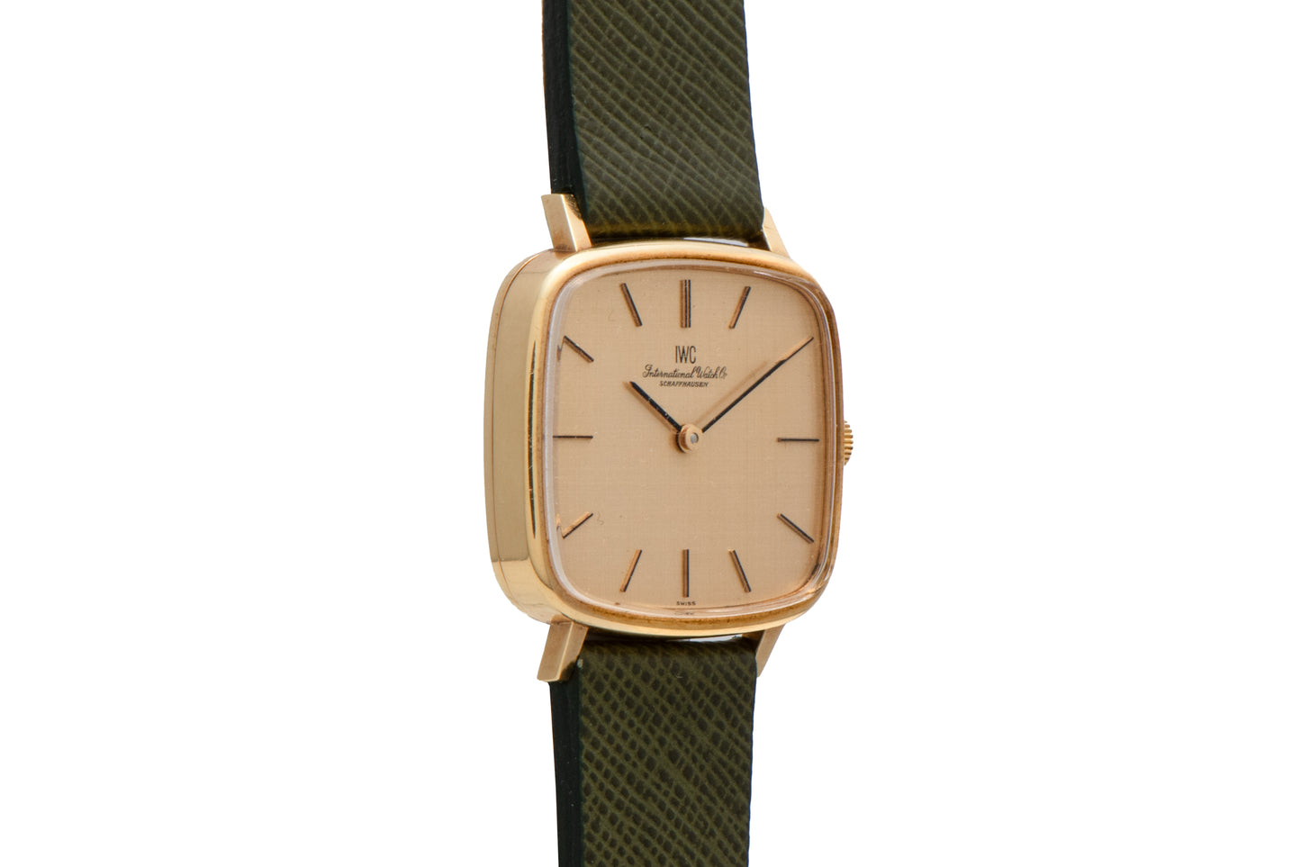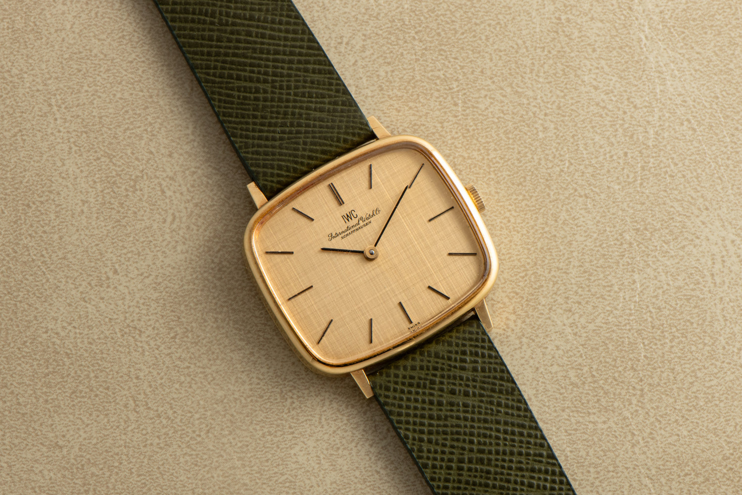 Its gold ‘linen’ dial is a canvas for a matching black pencil handset, applied markers, and the svelter ‘IWC’ logo towards the top of the dial followed by its full namesake, International Watch Co., written out in an elegant cursive typeface below it.