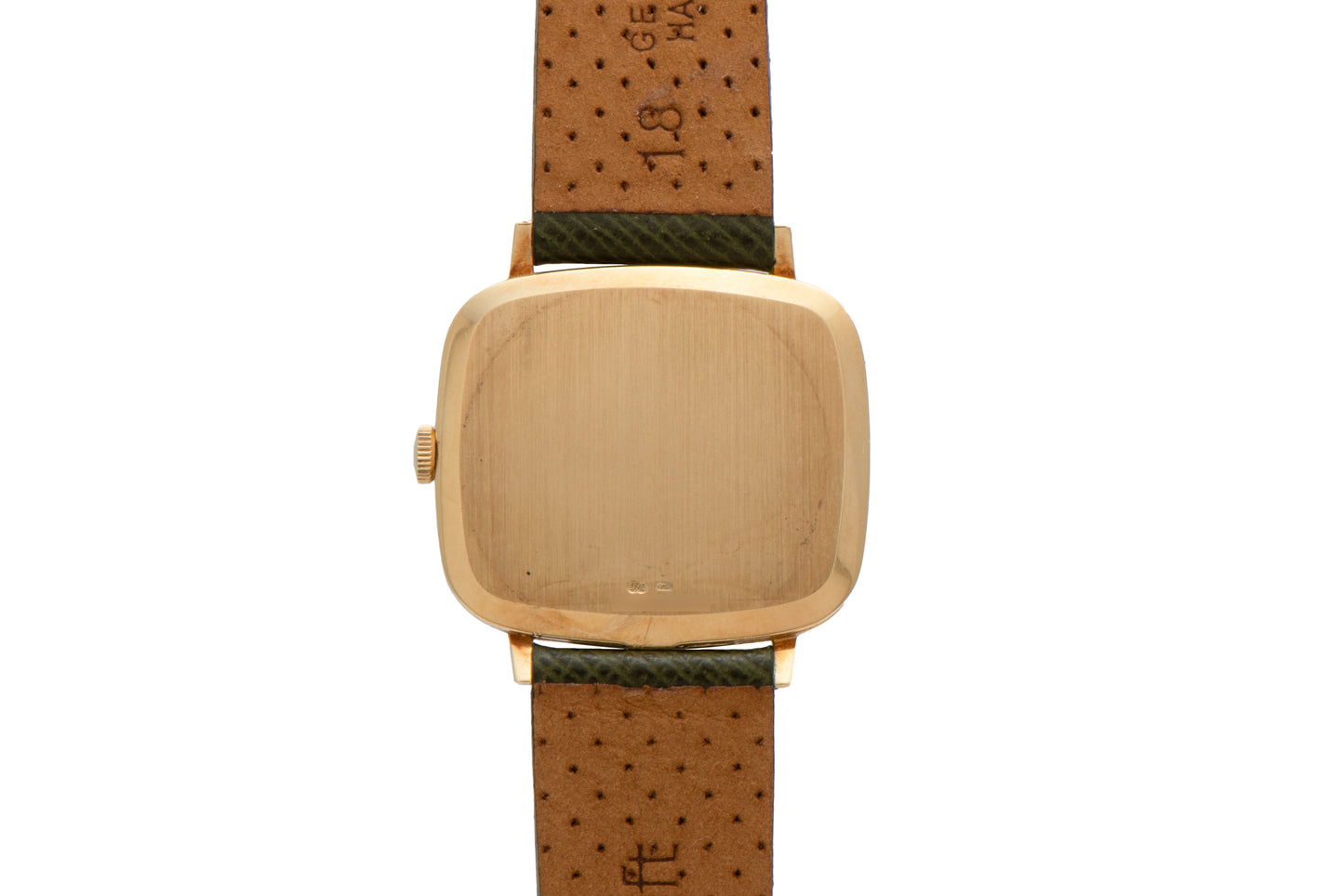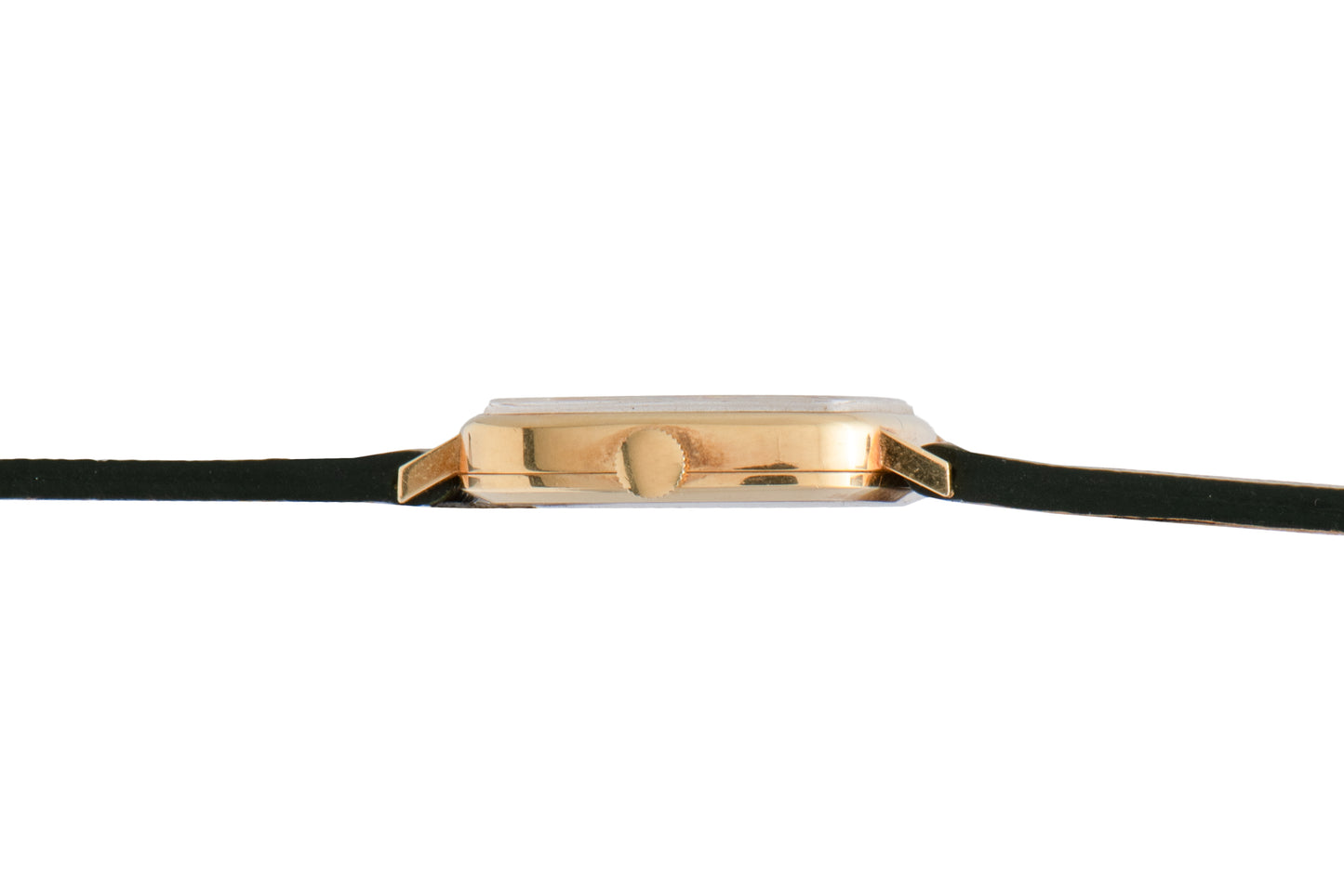 Hailing from the late 1960s, early 1970s, this piece features a 33mm 18K yellow gold ‘TV’ case with straight lugs, an acrylic crystal, an unsigned crown, and a solid caseback that still bears the remnants of its original factory caseback sticker, as well as deep hallmark engravings.