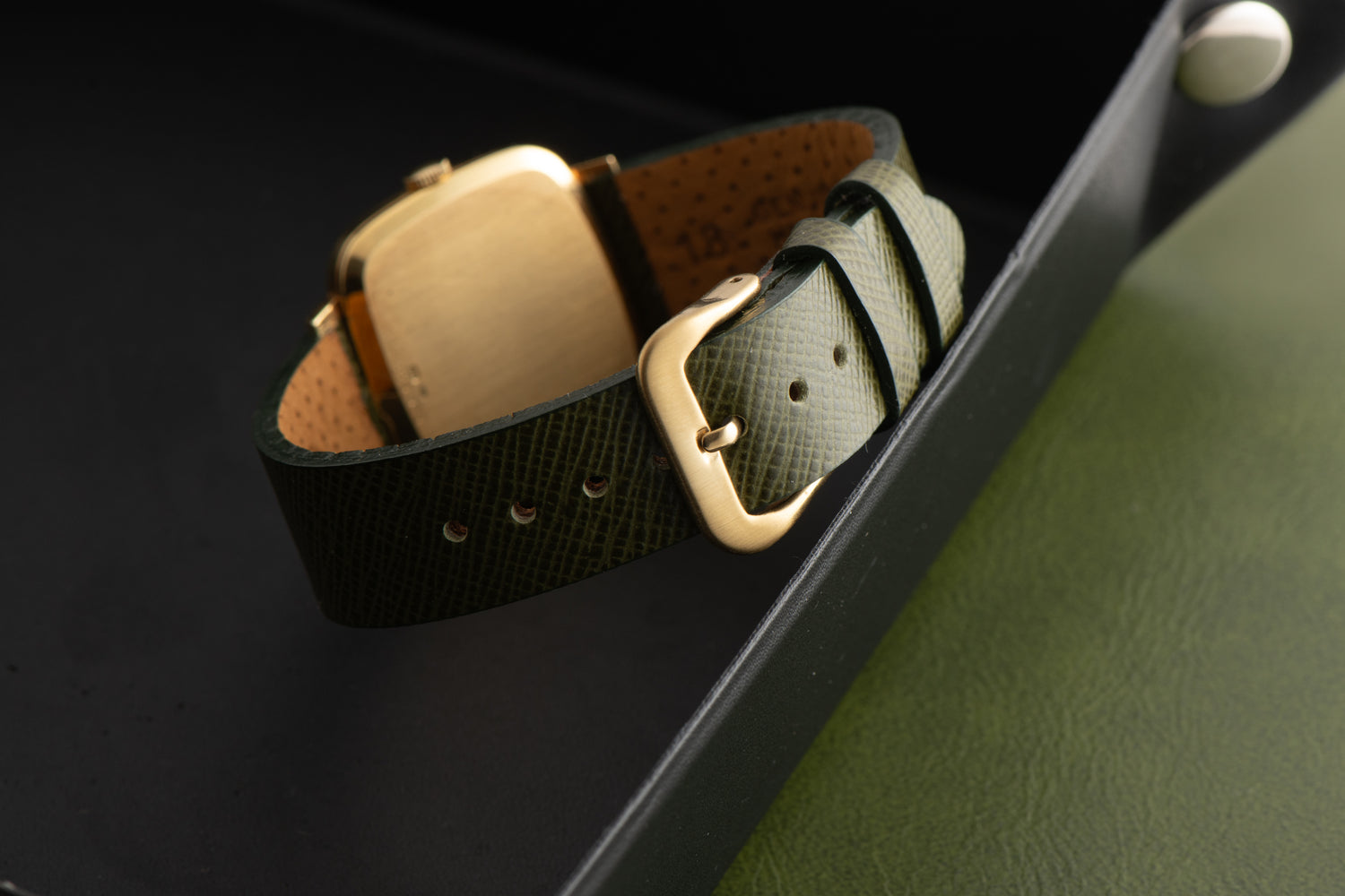 Powered by a manual-winding movement, we’ve elected to throw this piece on an Analog:Shift Sargasso Green Saffiano leather strap with a matching gold-tone buckle — green and gold is a winning combination if you ask us!
