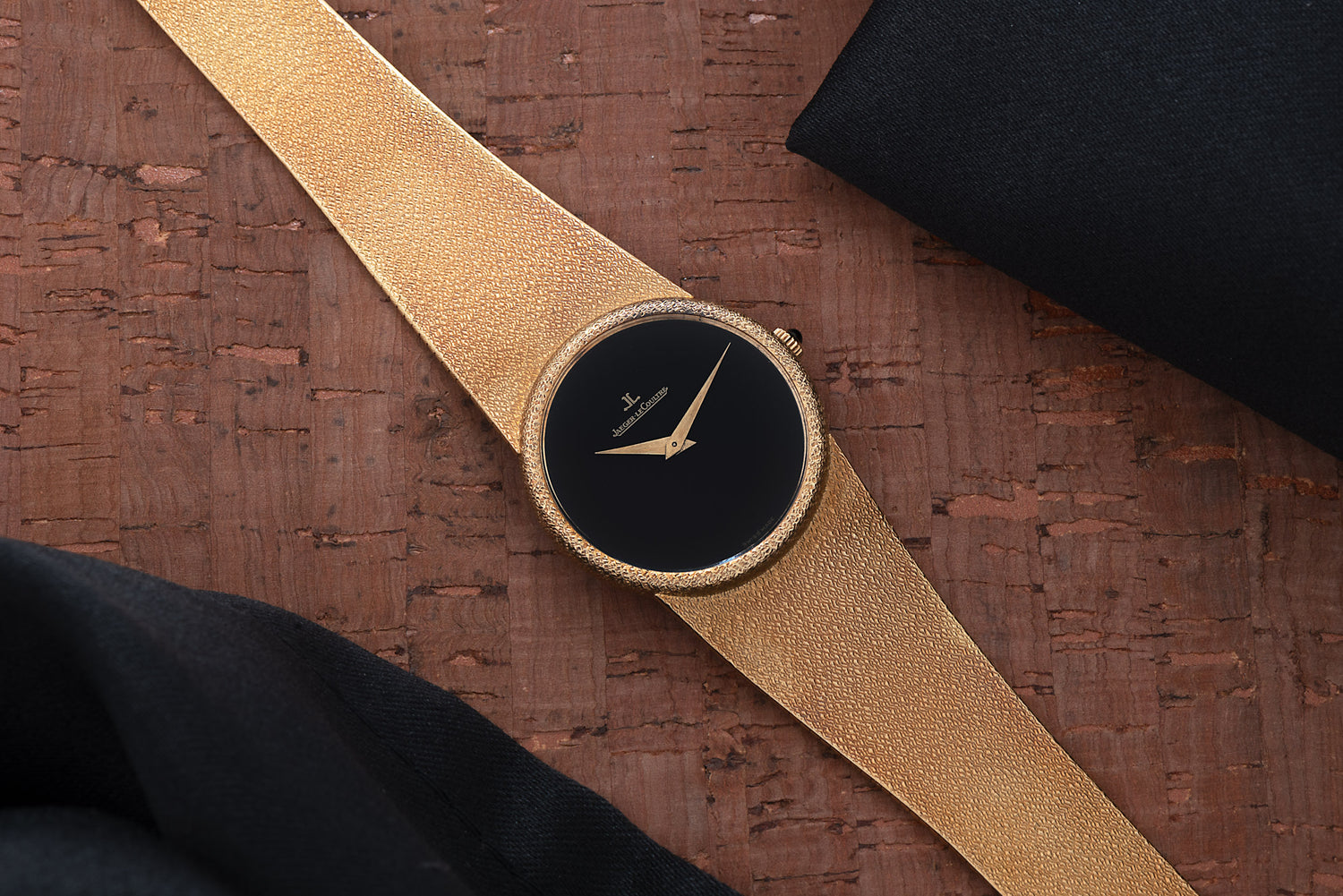The particular Jaeger-LeCoultre dress watch we have here couldn't be cooler. It features an absolutely beautiful, 31mm solid 18k yellow gold case with a textured finishing and integrated woven bracelet with matching finishing, an onyx cabochon crown, a deep, glossy black lacquer dial with a yellow gold 'dauphine' handset, and a manual winding movement within.