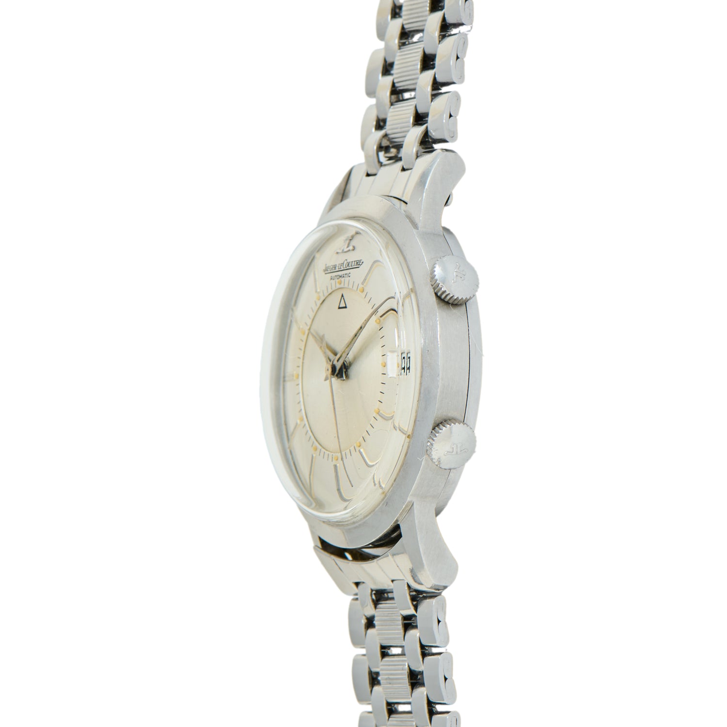 JLC offered the Memovox in many expressions, some of which were sold in the European market, and some of which were sold in the American market. This Reference E855 is of the former variety and is notable for its oversized 37mm stainless steel case and its stunning Gay Frères bracelet. Boasting dual signed crowns, downward-sloping lugs, and an acrylic crystal, it features a handsome, two-tone silver dial with applied 'stick' indices; an inner alarm dial with luminous five-minute 'dot' indices; a luminous 'dauphine' handset; and a date window at 3 o'clock.