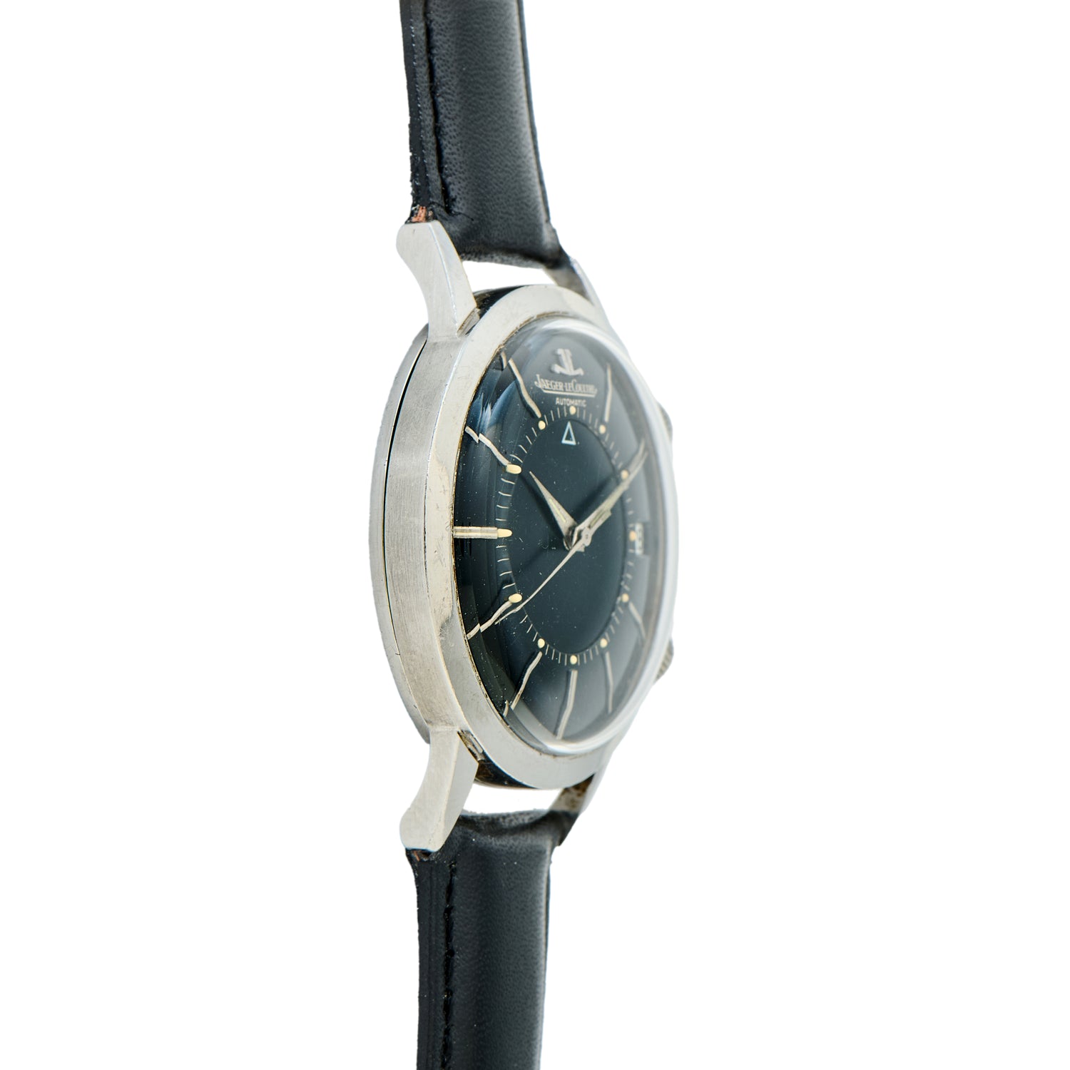 JLC offered the Memovox in many expressions, some of which were sold in the European market, and some of which were sold in the American market. This Reference E855 is of the former variety and is notable for its oversized 37mm stainless steel case and rare black colorway. Boasting dual signed crowns, downward-sloping lugs, and an acrylic crystal, it features a handsome black dial with applied 'stick' indices; an inner alarm dial with luminous five-minute 'dot' indices; a luminous 'dauphine' handset; and a date window at 3 o'clock.
