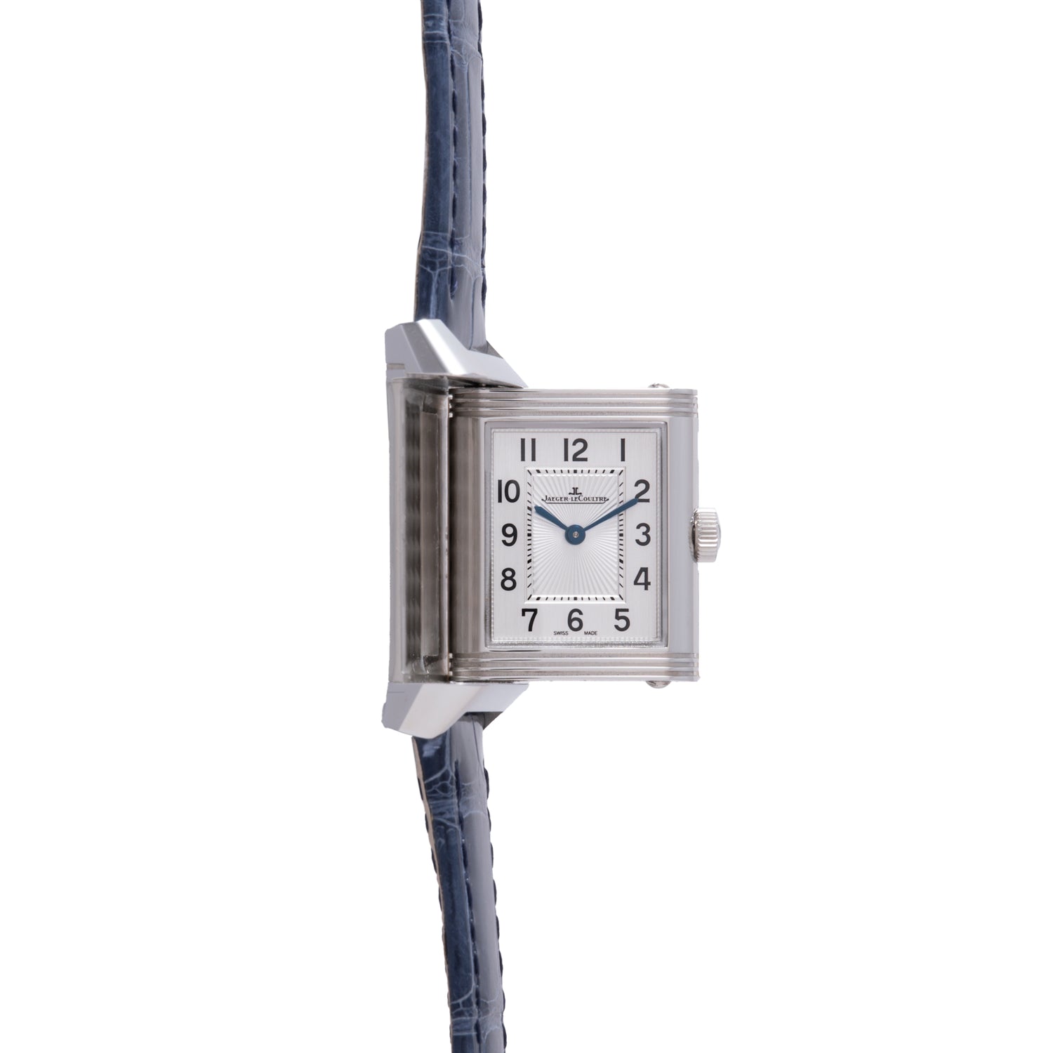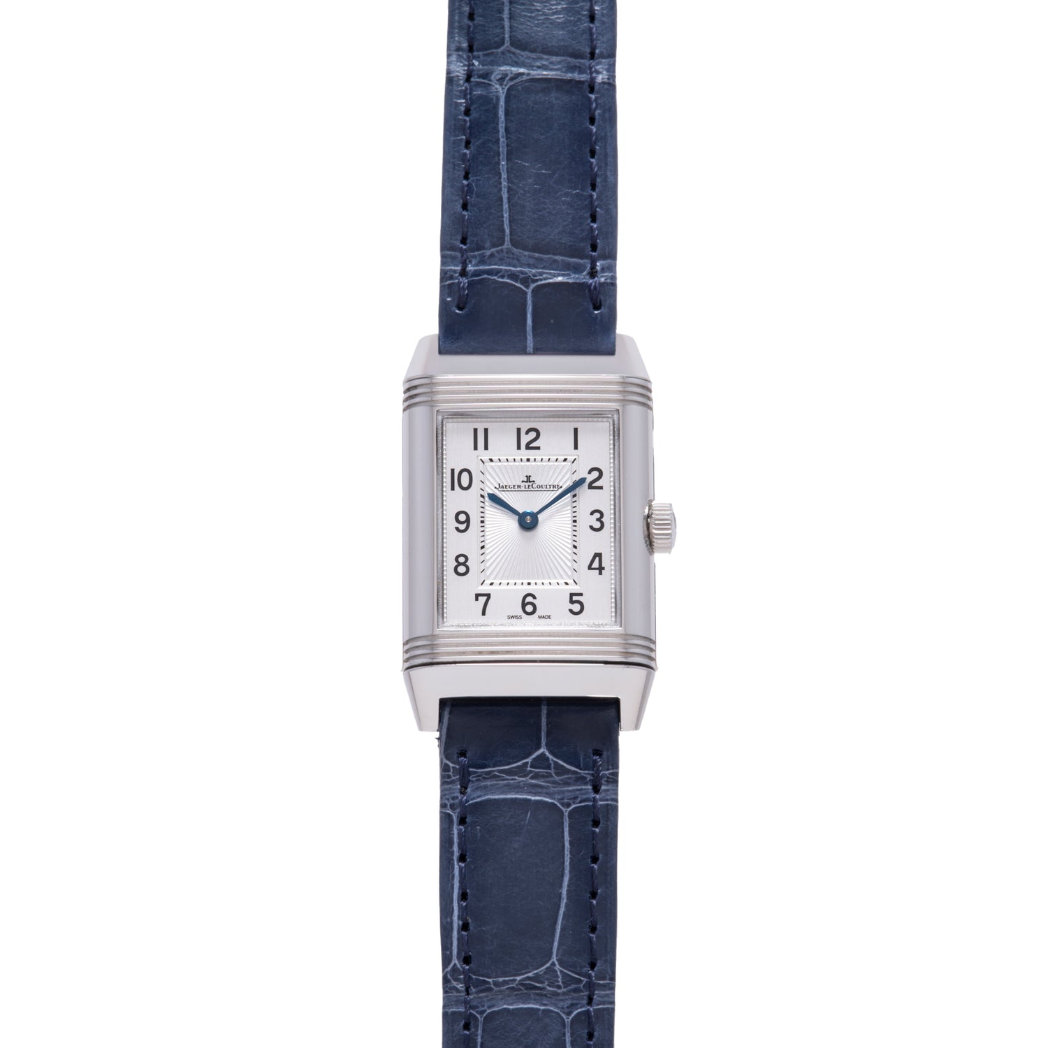 This example, a Reference Q2668432, features a small sized stainless steel 21mm x 34mm reversible case, sapphire crystal, signed crown, and a silver tone dial with printed 'Arabic' indices with a rectangular central minutes track framing a guilloche dial center and blued-steel 'sword' handset. The reverse displays a secondary time display with diamonds at the top and bottom. Powered by a Jaeger-LeCoultre Calibre 844 manual movement, is truly one of the most classic layouts available. This example also comes complete with its factory goodies.