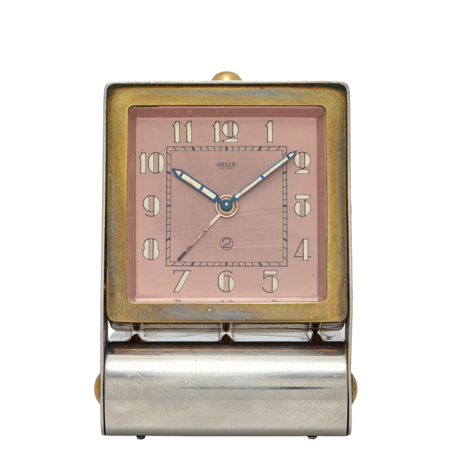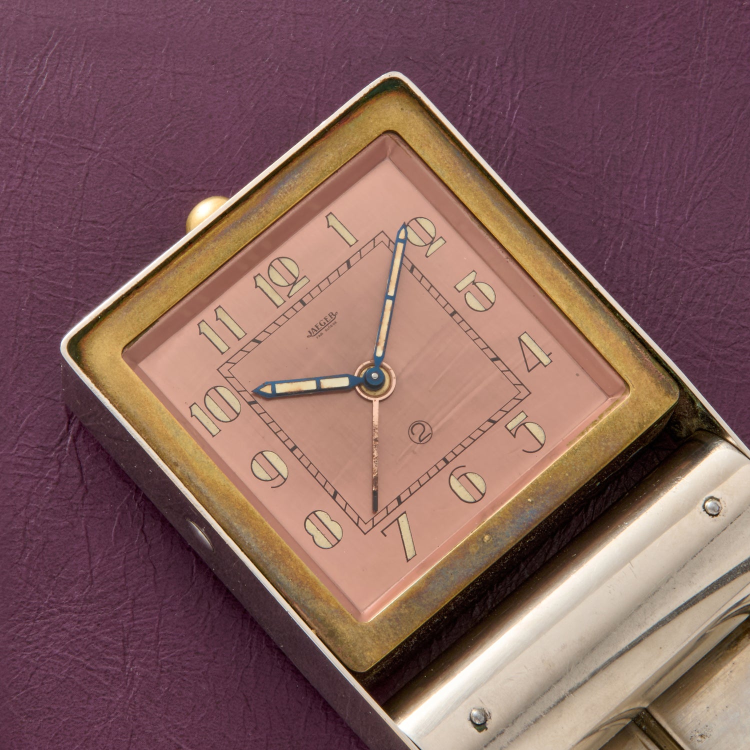 This particular timepiece is from “La Grande Maison” itself, Jaeger-LeCoultre. A 1930s travel clock, it’s housed in a 55mm square brass case with an outer chromed housing, an acrylic crystal, dual alarm and time-setting crowns on the back, and a beautiful salmon-colored dial with stylized, luminous 'Arabic' indices, an inner 'railroad' minute track, and a luminous, bifurcated 'sword' handset. Signed "LeCoultre," it was made by JLC for the American market and proudly advertises its two-day movement with a circled "2."