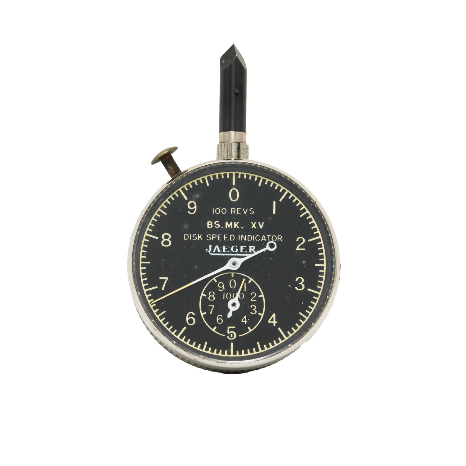 The mechanism remains fully operational: press the button, and the movement engages; spin the black shaft, and the needle rises, sampling RPM before settling to a reading. It’s both a technical artifact and a piece of lived wartime engineering — built to work, and remarkably, still does.