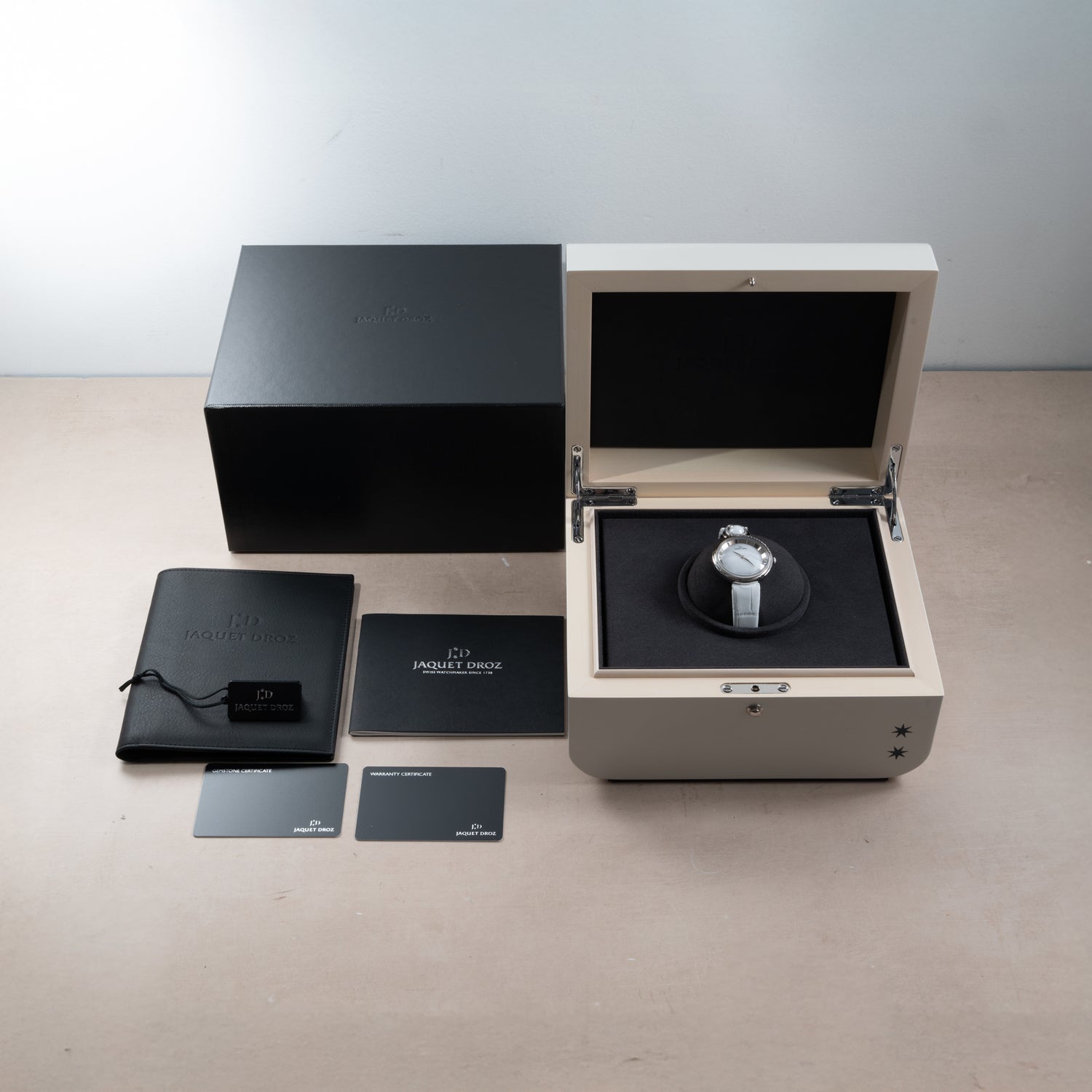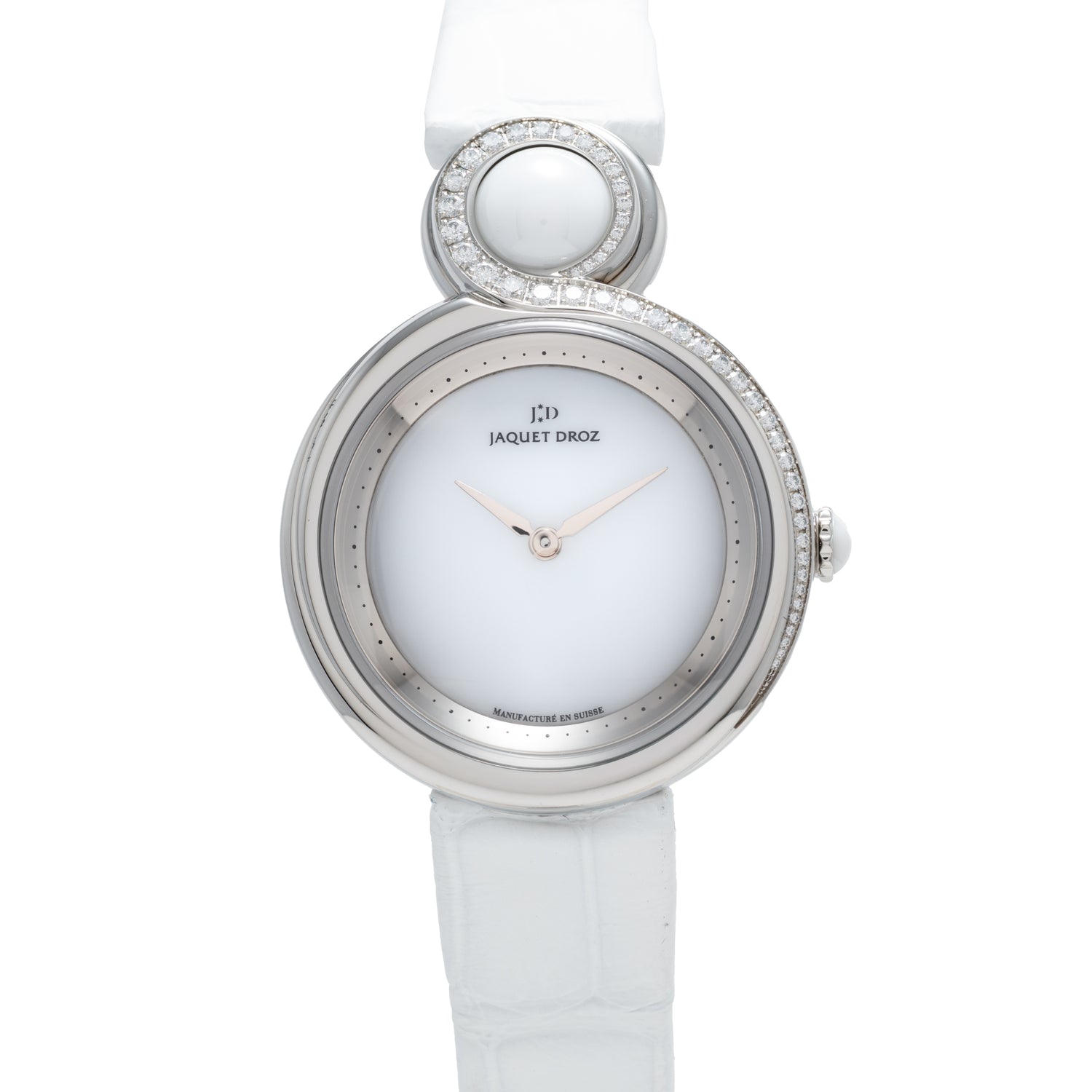 At its heart lies the automatic Jaquet Droz calibre 1153, with a generous 68-hour power reserve, visible through a sapphire caseback. The white zircon dial glows with understated drama, its 'alpha' hands sweeping with refined precision. Paired with a supple white alligator strap and steel deployant clasp, the Lady 8 transitions effortlessly from candlelit dinners to glittering cocktail hours—and everywhere in between.