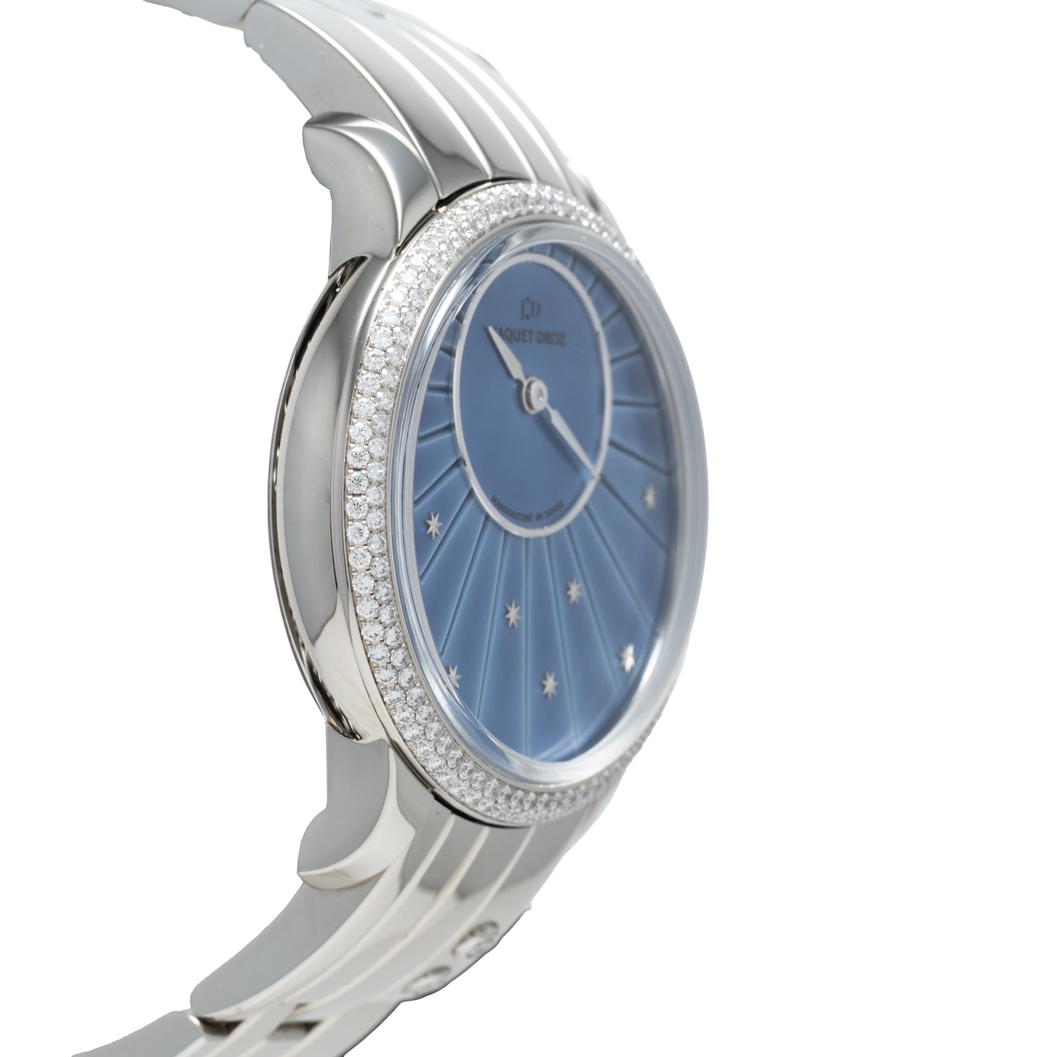 Jaquet Droz, a historic maison now part of the Swatch Group, continues to honor those origins by weaving pocket watch influence into modern design. The Petite Heure Minute is a striking example, encased in 35mm stainless steel with a diamond-set bezel, scratch-resistant sapphire crystal, and an onion crown featuring a push-button corrector. Its iridescent blue mother-of-pearl dial shimmers with eight white gold stars, balanced by an off-center subdial at 12 o’clock where polished steel hands track the hours and minutes.