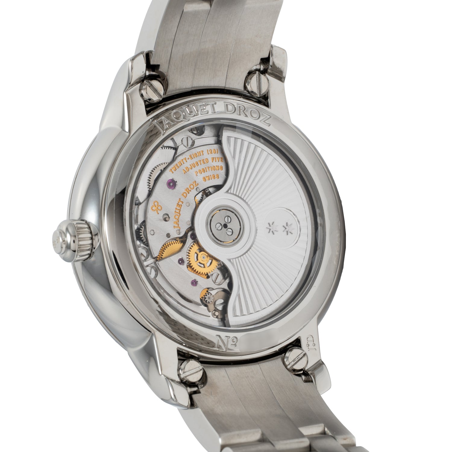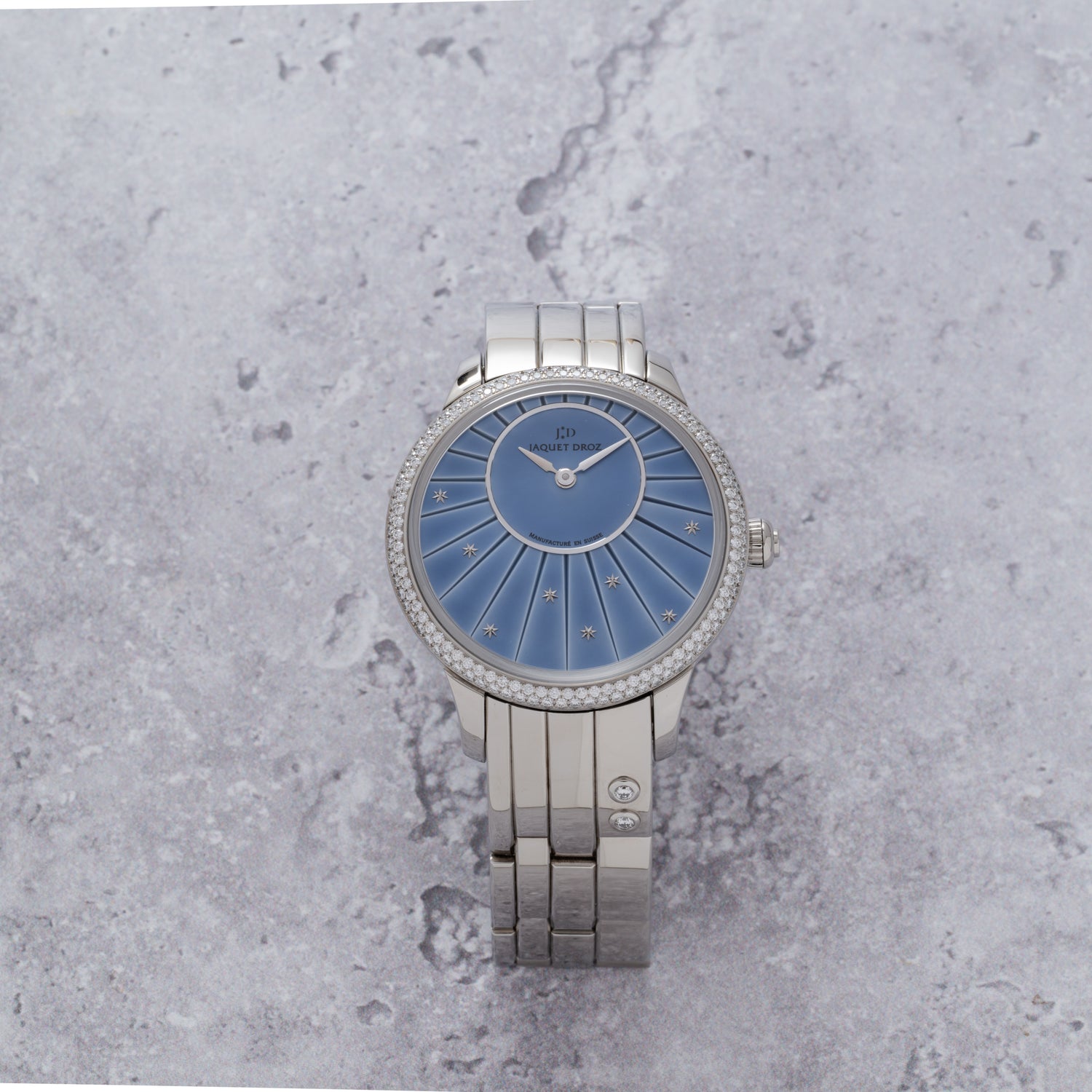 Inside, the automatic Jaquet Droz calibre 2653P offers a 68-hour power reserve, ensuring precision and reliability. Adorned with more than 160 diamonds, the watch is fitted to a stainless steel bracelet accented with two additional diamonds—a tribute to the brand’s iconic twin stars. Delivered with its complete factory set, this Petite Heure Minute stands as both a mechanical achievement and a radiant companion for life’s most celebrated occasions.