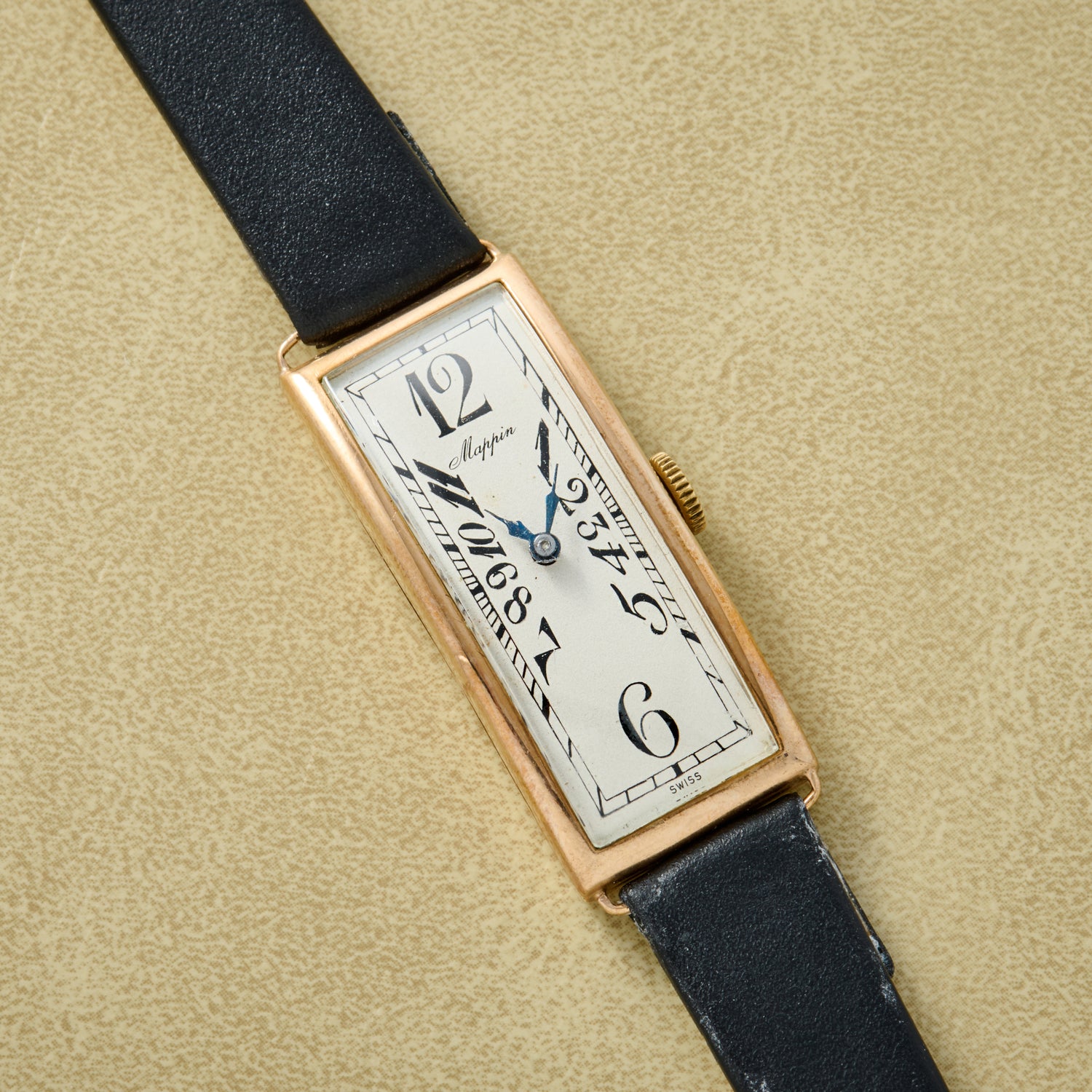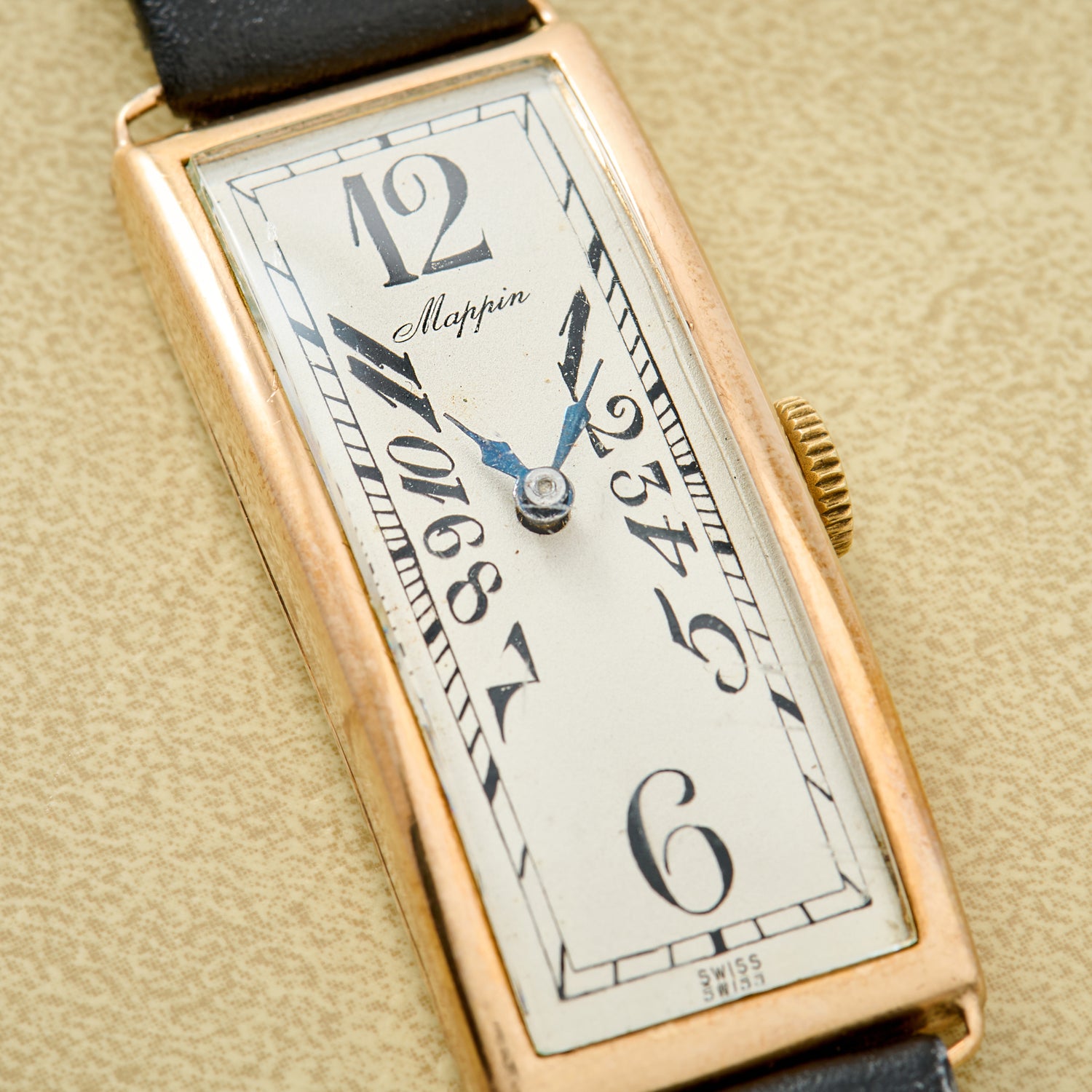 Housed in an elongated, rectangular 9K gold case with an unsigned crown, a smooth bezel, and thin wire lugs, it features a handsome silvered dial with a 'railroad' minute track in black, exploded 'Arabic' numerals, and a blued steel 'spade' handset. Signed 'Mappin' and featuring deep hallmarks on its caseback, it's powered by a hand-wound 15-jewel movement with two fine adjustments that fits snugly behind its curved dial.