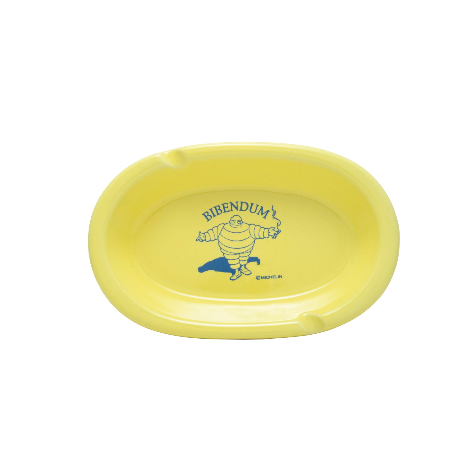 Offered here is a fabulous vintage Michelin ashtray, executed in yellow ceramic with a blue printed Bibendum Michelin Man motif at its center.