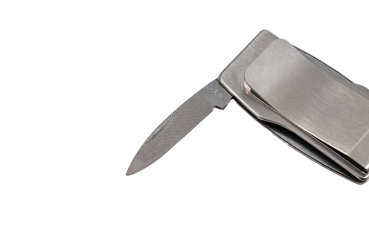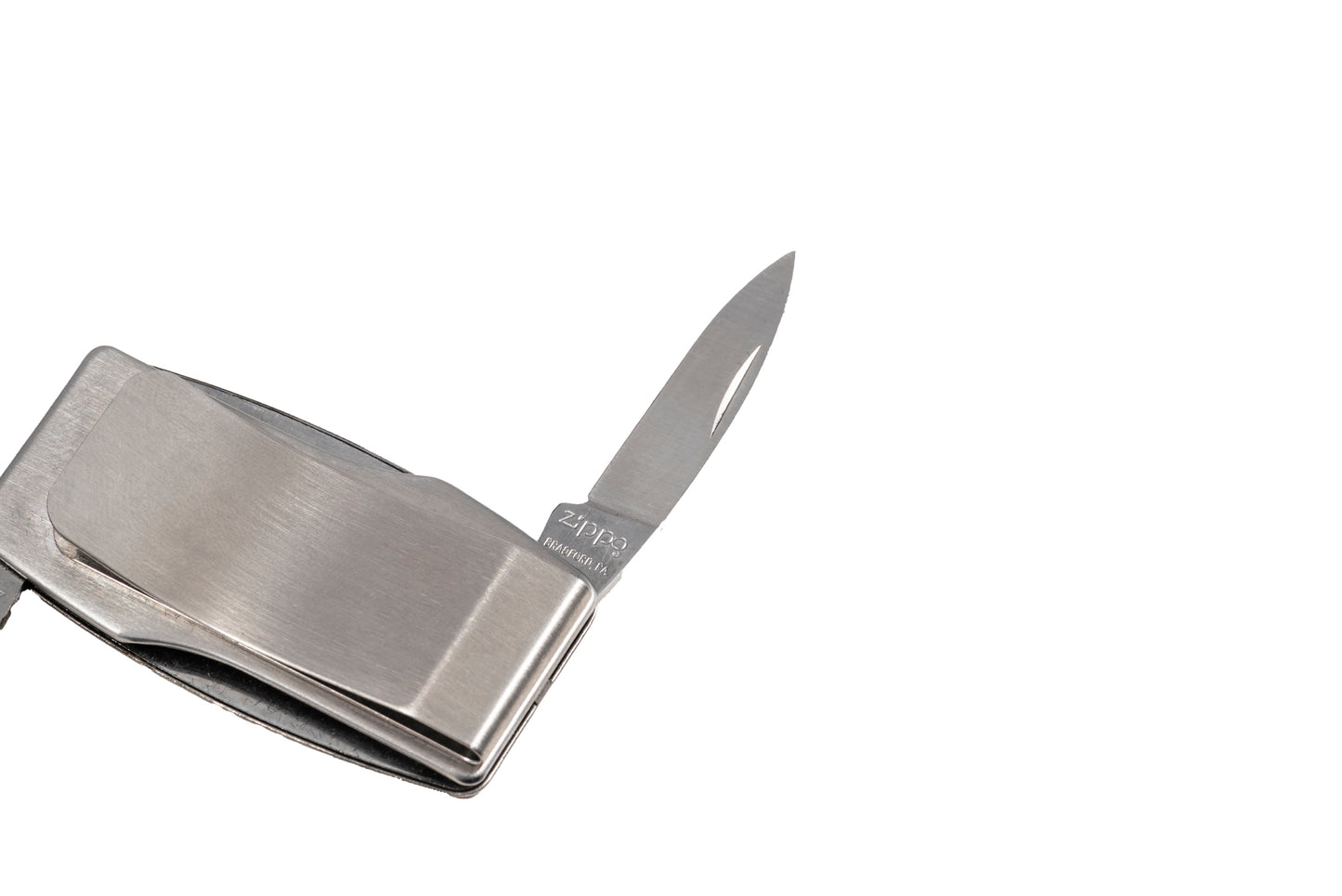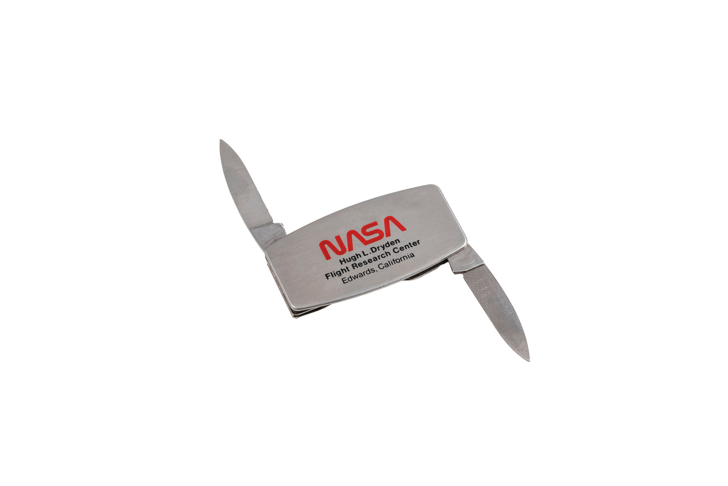 This particular piece is a Zippo money clip commissioned for NASA. Its 2” x 1” stainless steel body features the classic NASA 'worm' logo followed by ‘Hugh L Dryden Flight Research Center’ on the front side and a sturdy metal clip on the back. Looking closely, you'll see that this money clip also houses two mini knife blades that nestle right into the clip body.