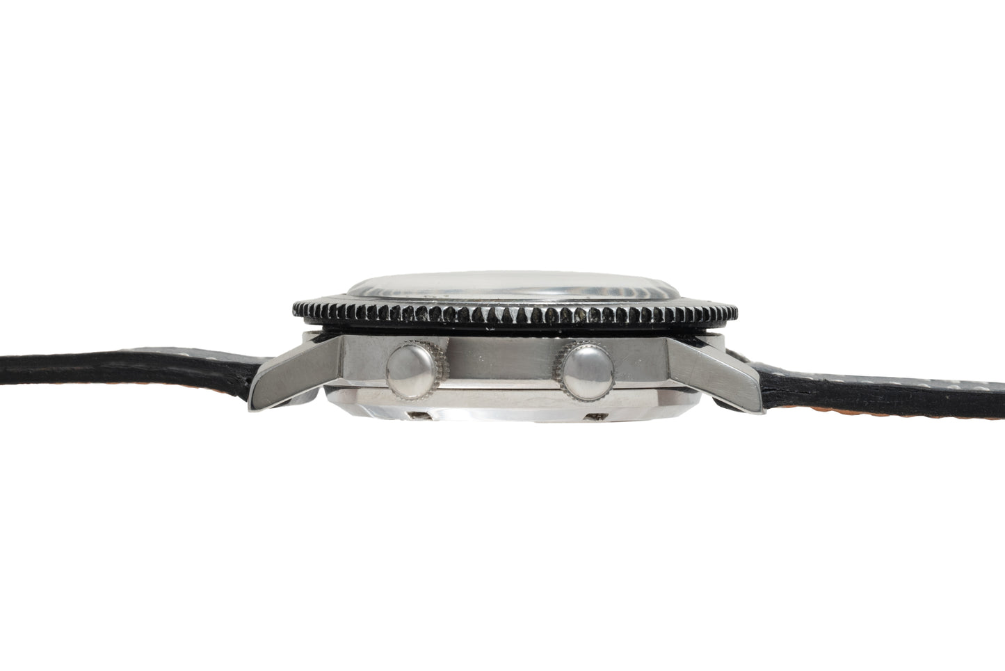1963 saw the launch of the Chronomaster, a chronograph christened on its dial with three words: “Chronomaster (or, sometimes “Chronograph”),” “Aviator,” and “Sea Diver.” This unique design was aimed squarely at the mid-20th century adventurer, and featured 200m of water resistance, plus a chronograph, a unique count-up dive bezel with additional 12-hour GMT scale, and a regatta countdown timer. (Certain versions also included a date window.)