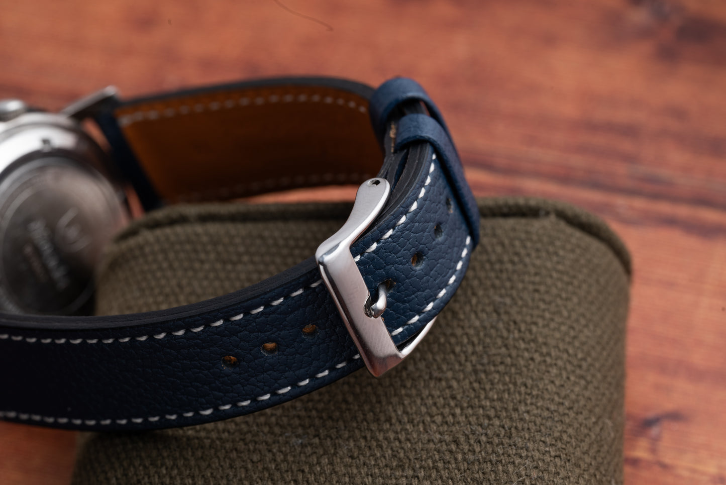 Complemented by a blue leather strap with white contrast stitching, this piece has all the makings of being a solid travel companion.