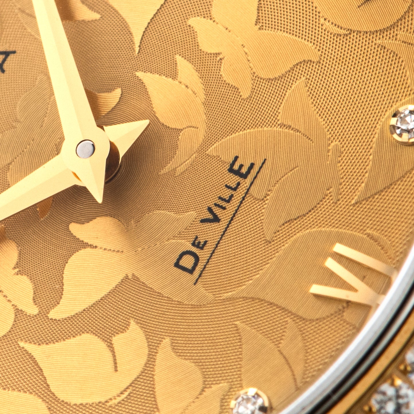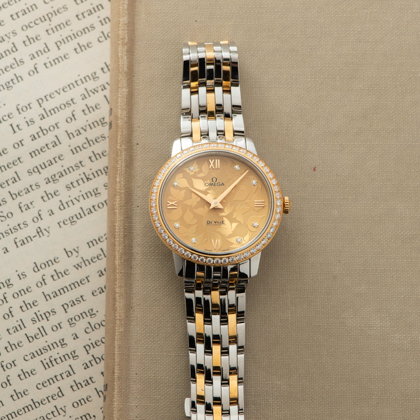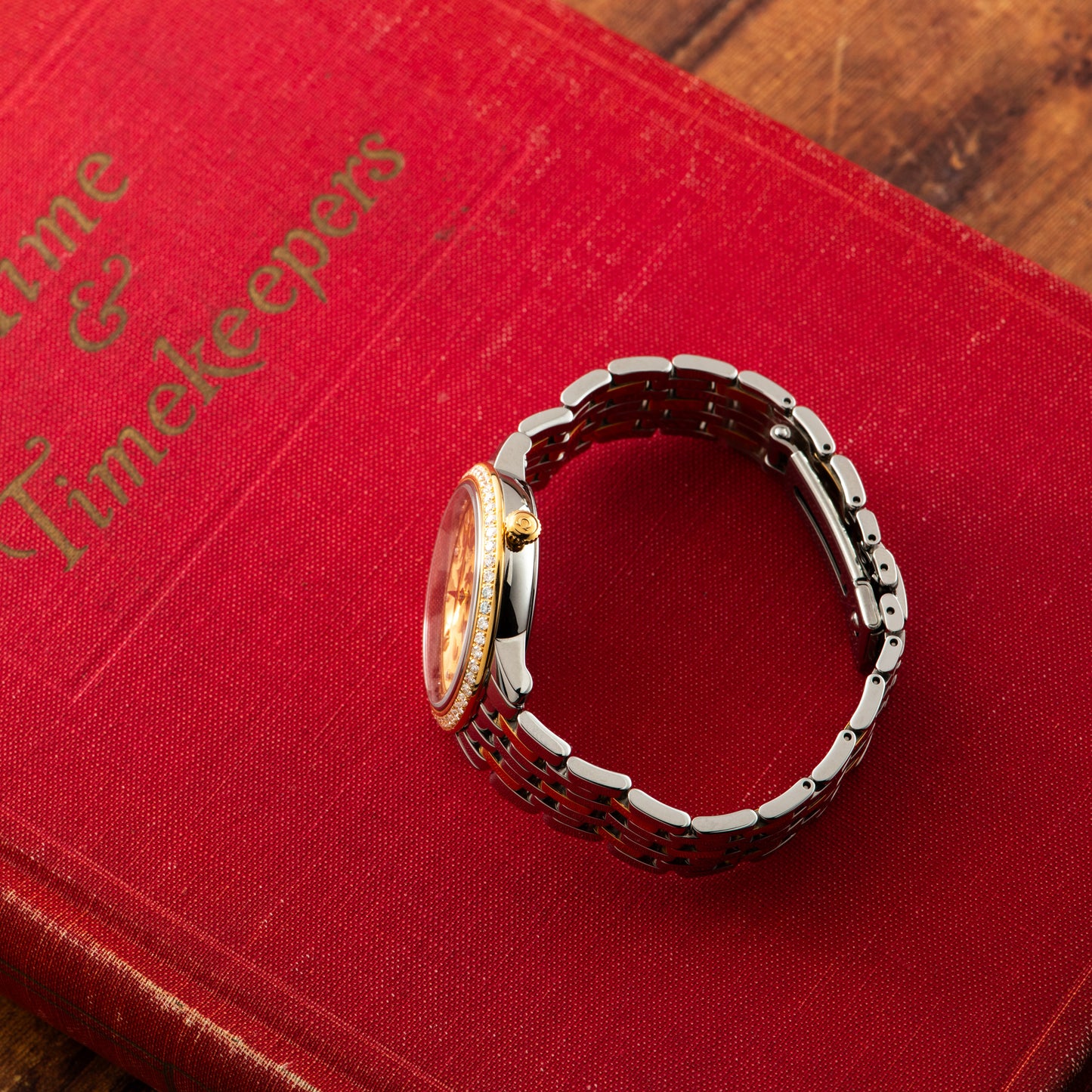 The particular De Ville we have here is a modern incarnation from the 2020s boasting a simple, elegant design that can truly be dressed up or down with ease. Housed in a 33mm two tone case in yellow gold and stainless steel, this piece is fitted with a sapphire crystal, a signed crown, and a diamond-set bezel, it features a butterfly motif champagne dial with applied Roman and diamond indices, a ‘dauphine’ handset, and a date window at 3 o’clock.