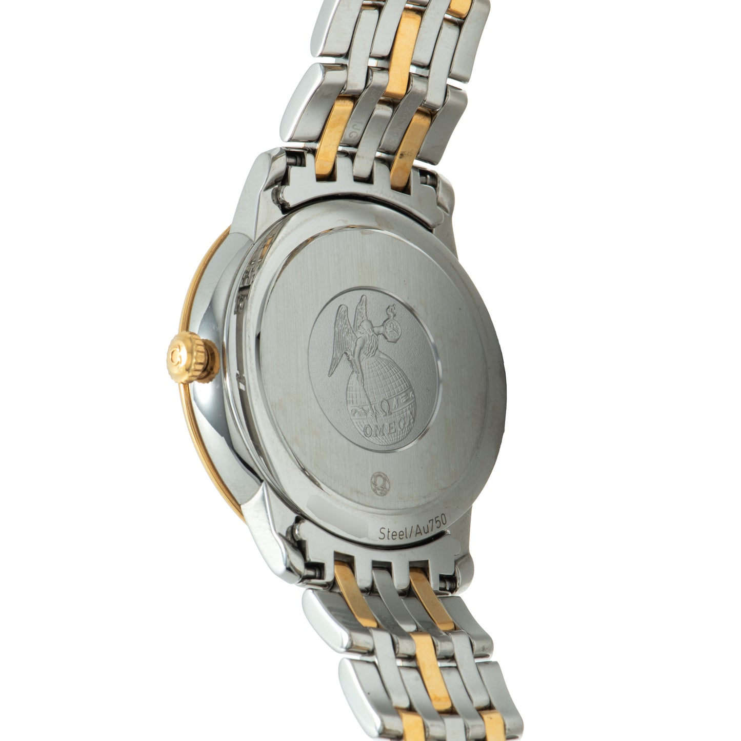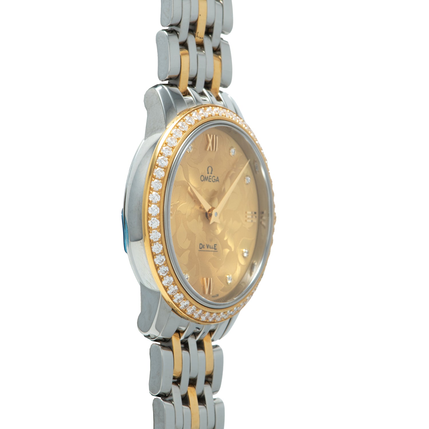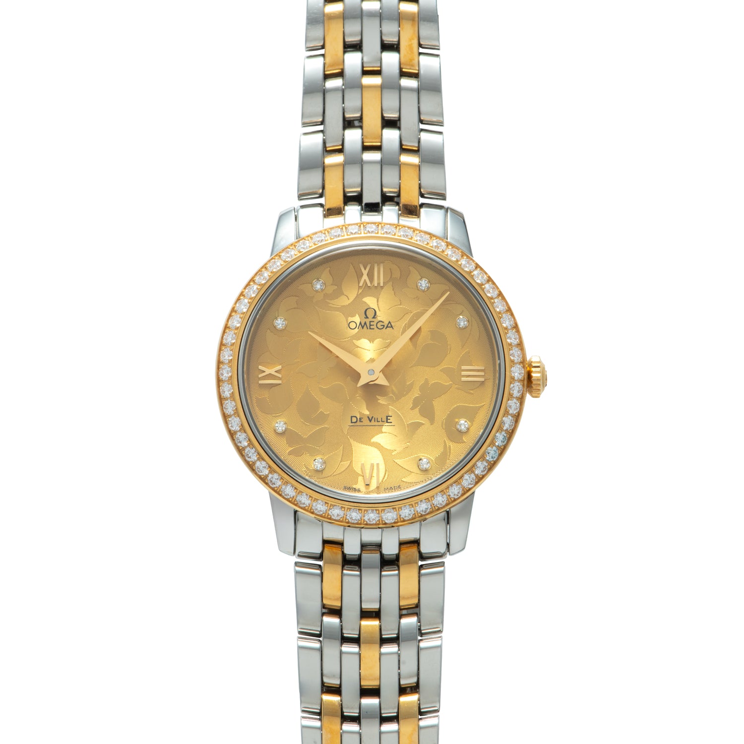 The particular De Ville we have here is a modern incarnation from the 2020s boasting a simple, elegant design that can truly be dressed up or down with ease. Housed in a 33mm two tone case in yellow gold and stainless steel, this piece is fitted with a sapphire crystal, a signed crown, and a diamond-set bezel, it features a butterfly motif champagne dial with applied Roman and diamond indices, a ‘dauphine’ handset, and a date window at 3 o’clock.