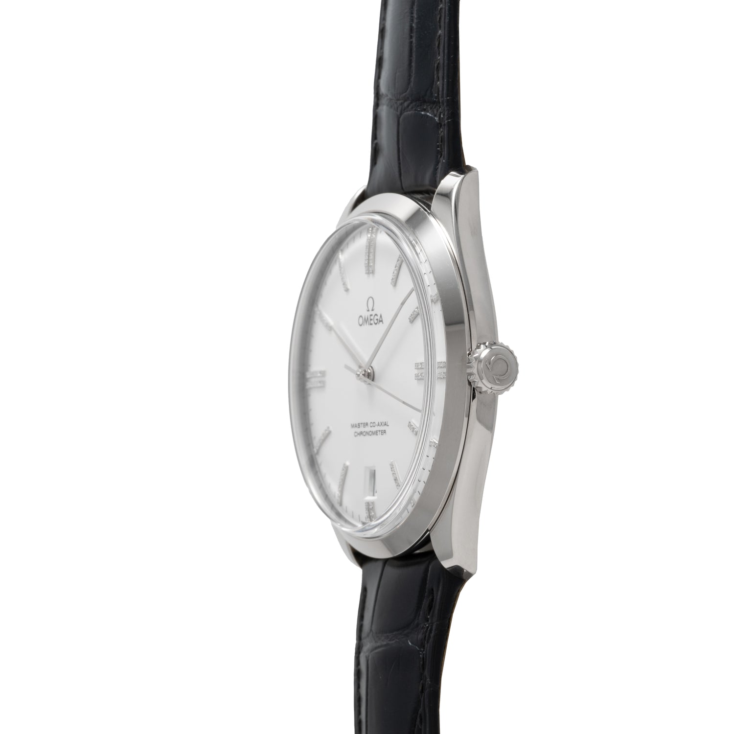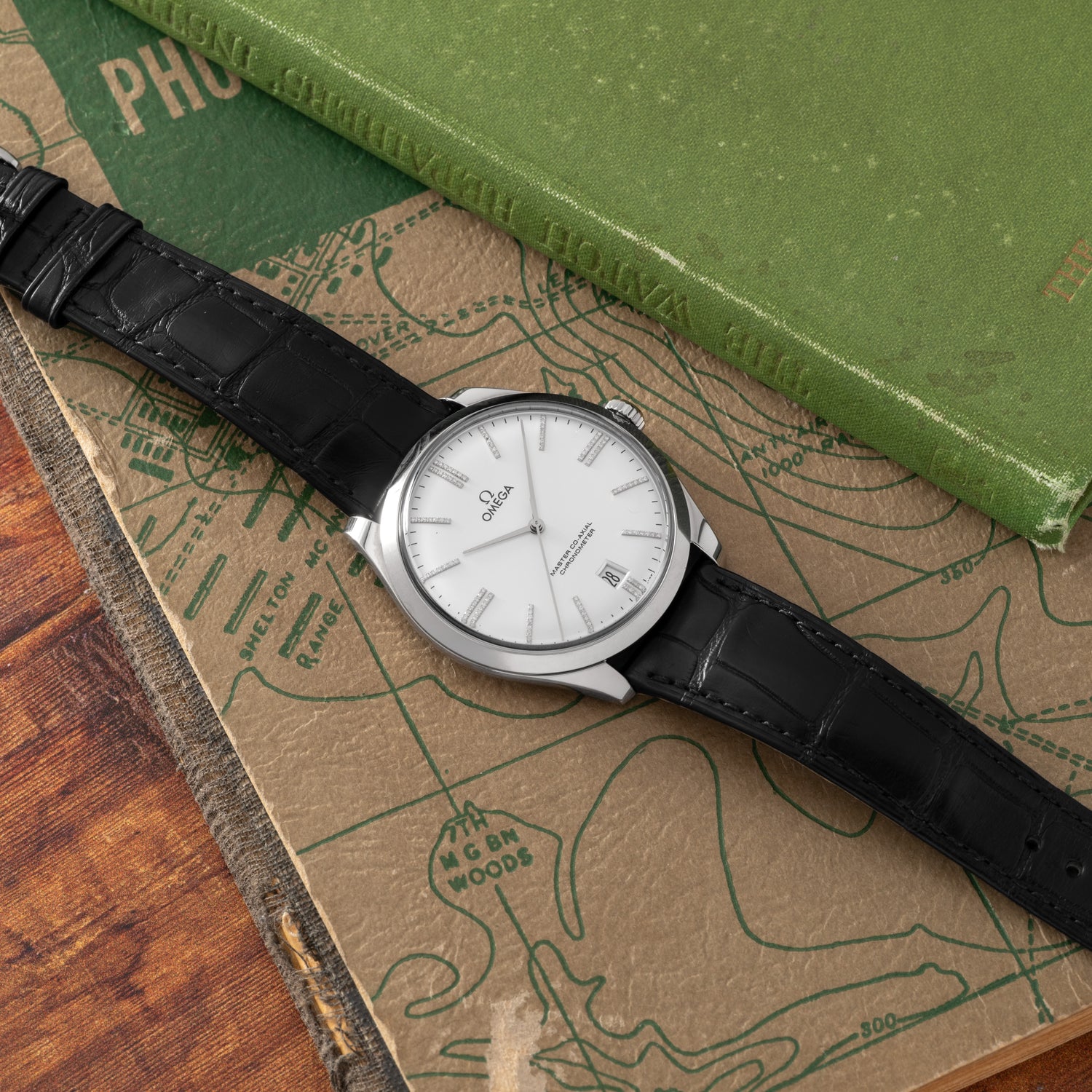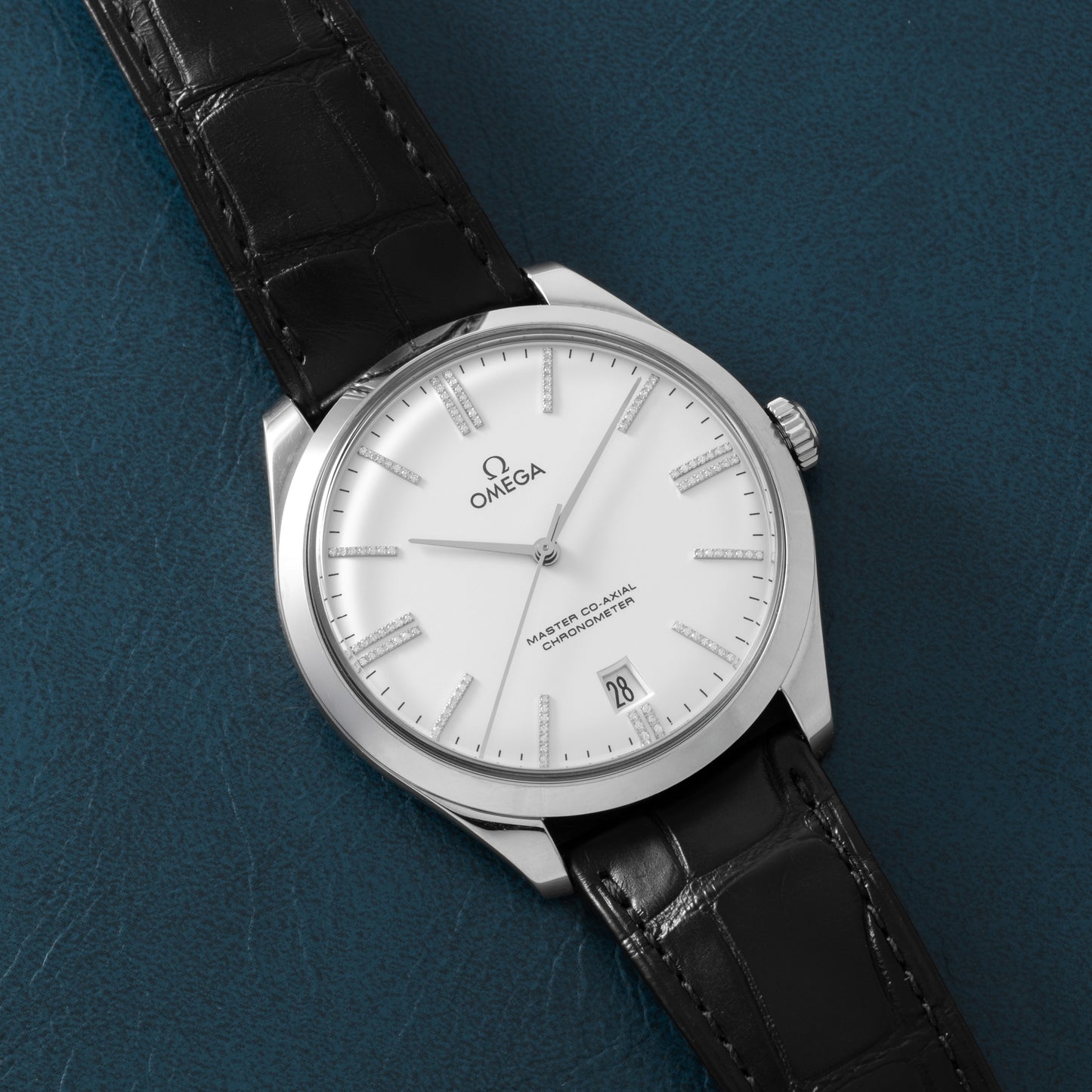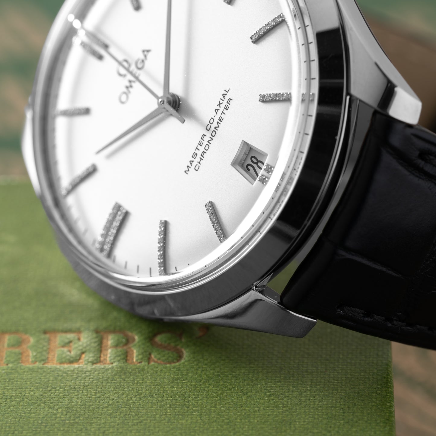 The particular De Ville we have here is a beautiful Trésor men's model. Housed in a 40mm 18K white gold case with a smooth bezel, a signed crown, and a sapphire crystal, it boasts a domed silver opaline dial with 18K white gold diamond-set indices, a matching white gold handset, and a date window above 6 o'clock. Powered by Omega's hand-wound Master Co-Axial calibre 8511, it measures just 10.8mm tall — perfect for slipping under a cuff, especially with its elegant black leather strap with signed white gold pin buckle.