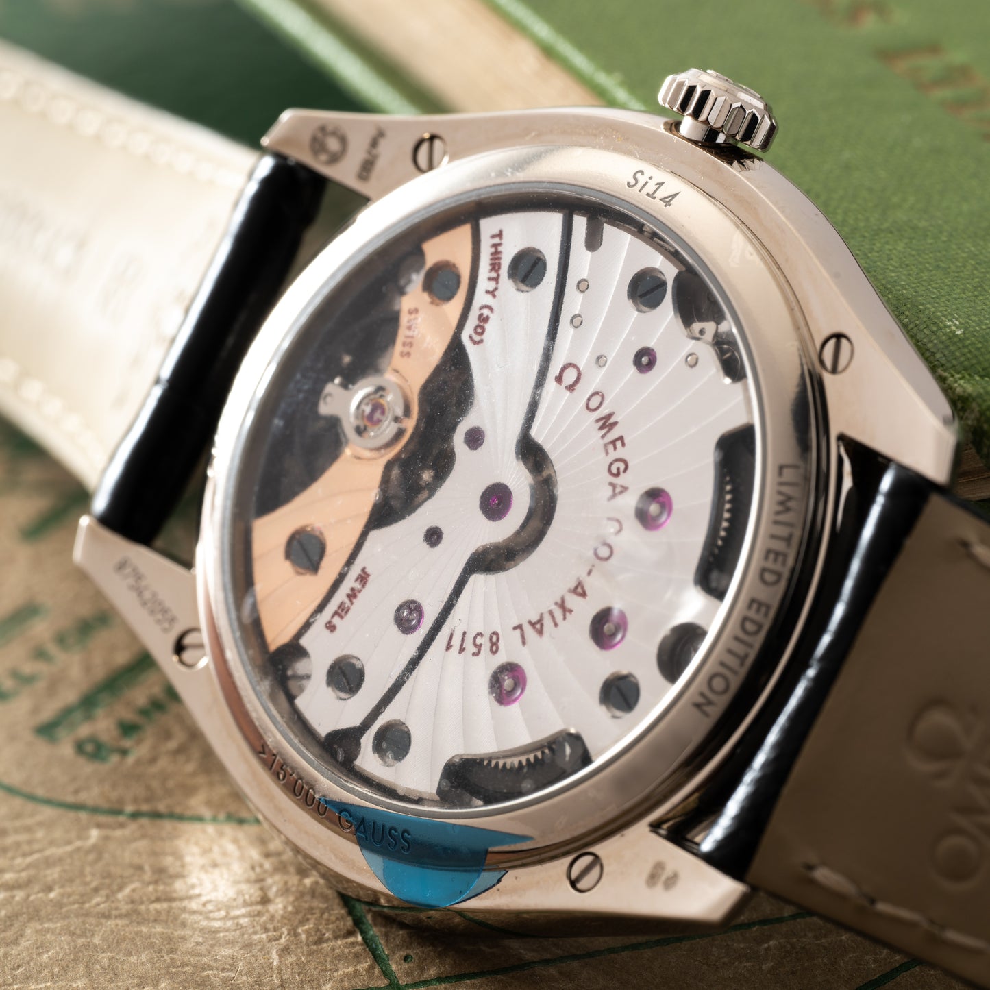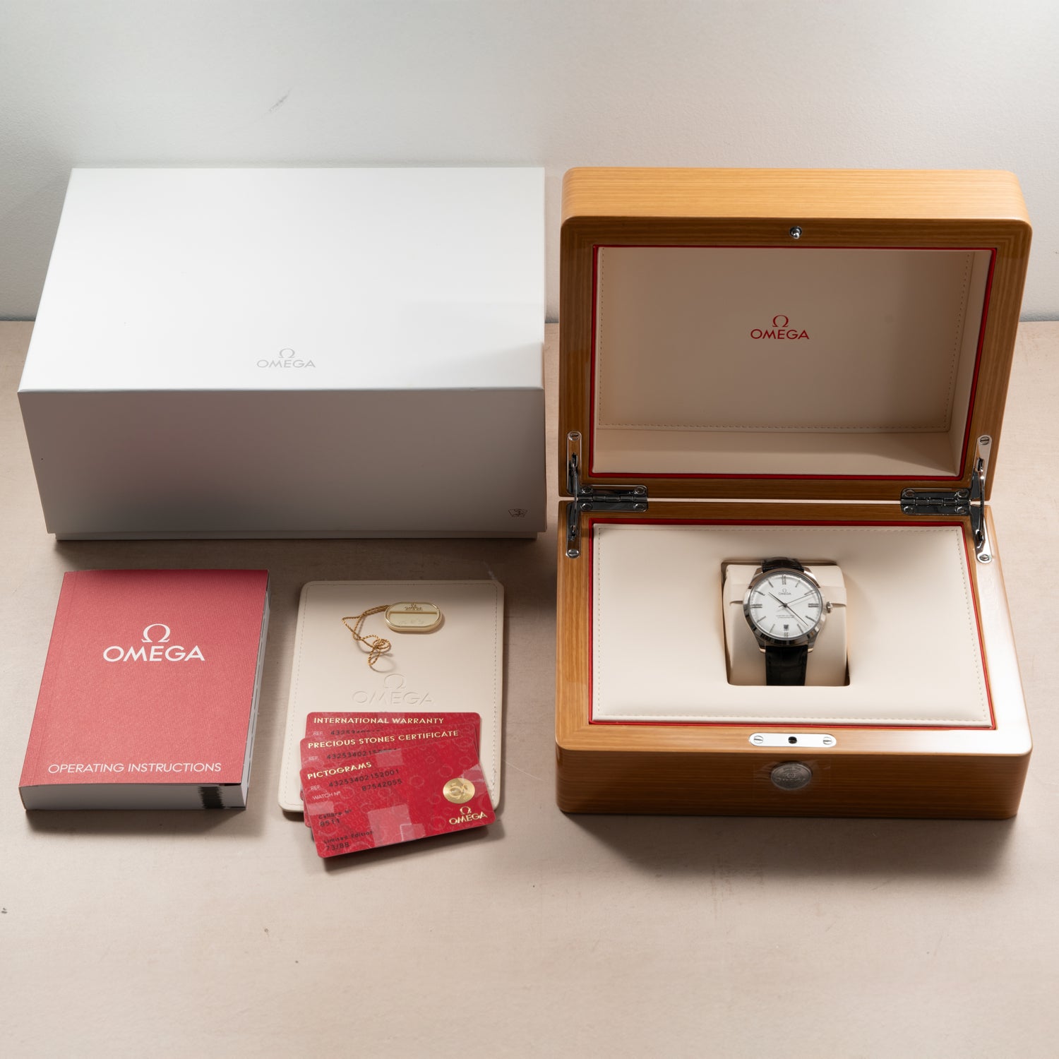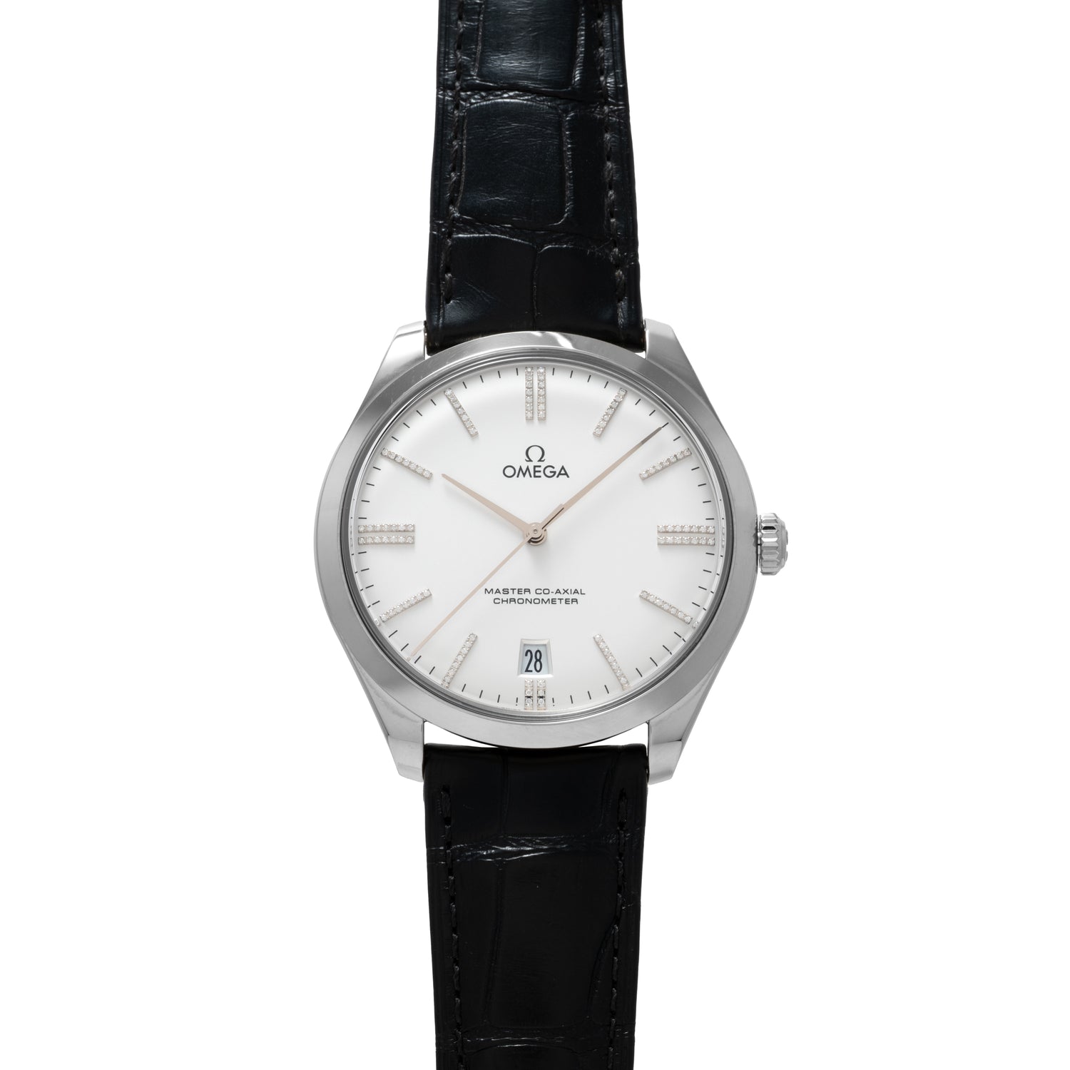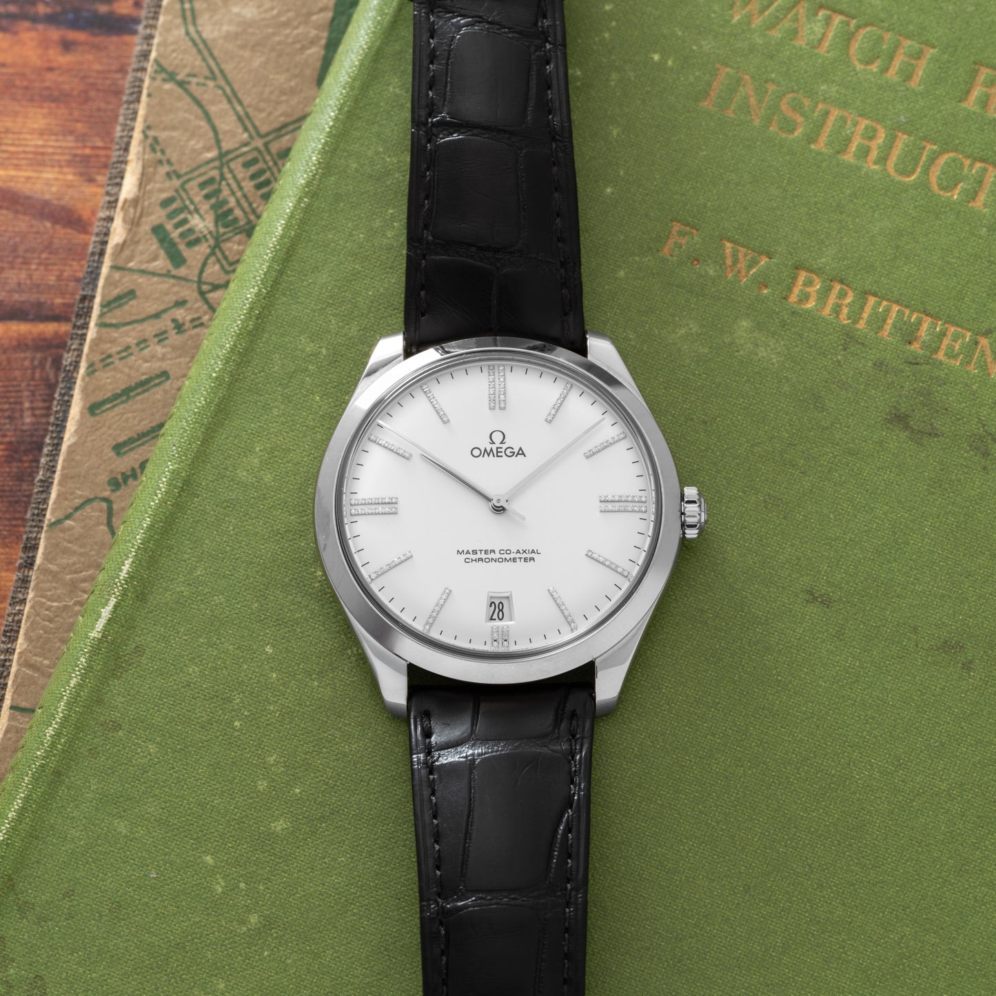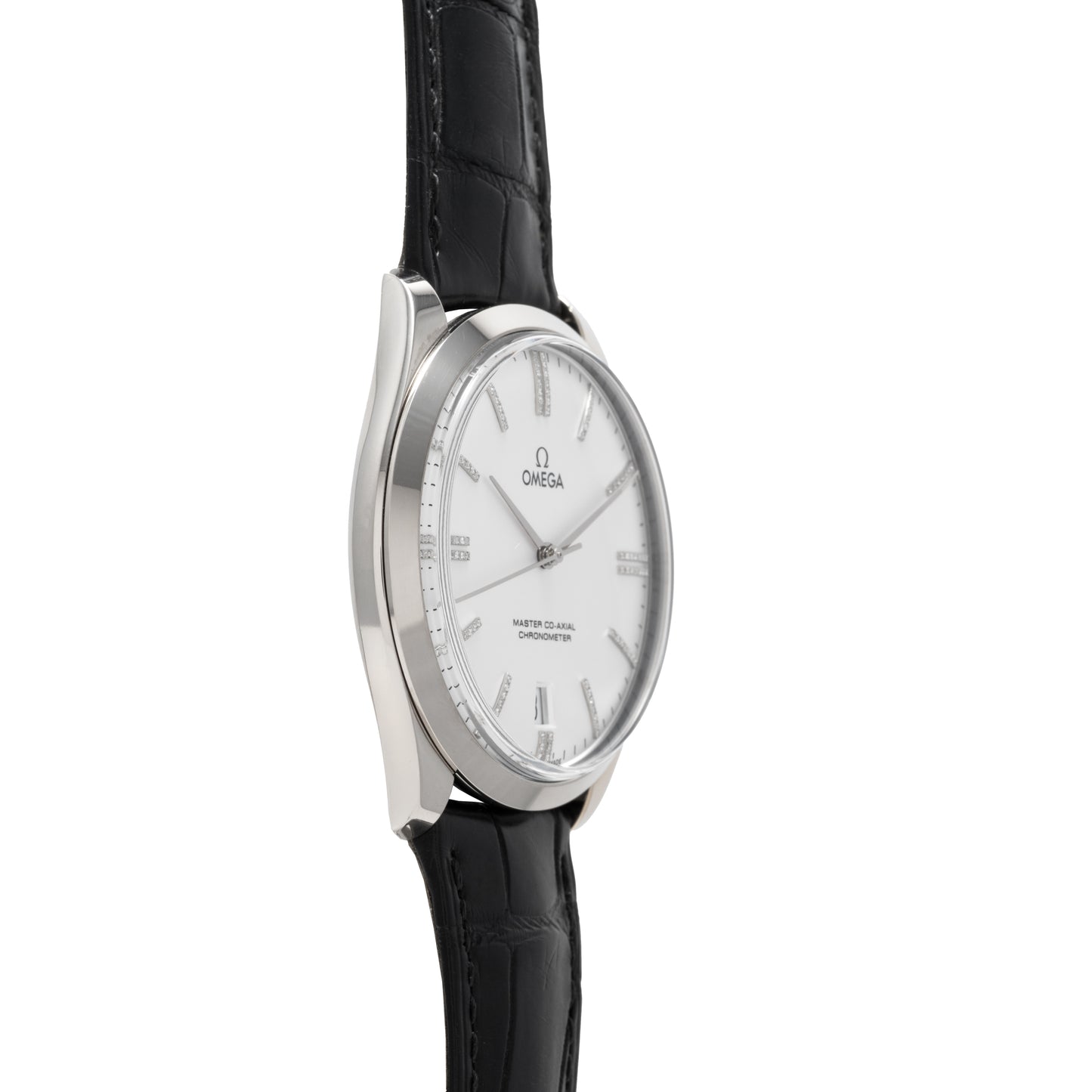 The particular De Ville we have here is a beautiful Trésor men's model. Housed in a 40mm 18K white gold case with a smooth bezel, a signed crown, and a sapphire crystal, it boasts a domed silver opaline dial with 18K white gold diamond-set indices, a matching white gold handset, and a date window above 6 o'clock. Powered by Omega's hand-wound Master Co-Axial calibre 8511, it measures just 10.8mm tall — perfect for slipping under a cuff, especially with its elegant black leather strap with signed white gold pin buckle.