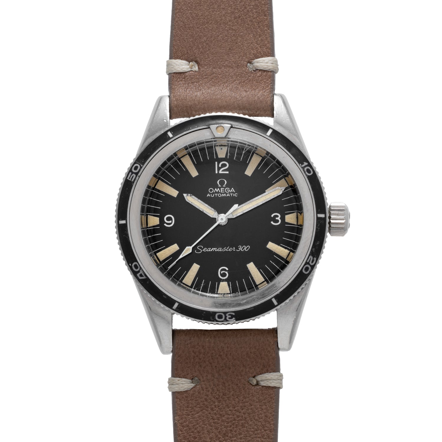 This particular Seamaster 300, a Reference 165.014-62, is a genuine masterpiece of industrial and horological design. Dating to the 60s, it features a 38mm stainless steel screw back case, matte black luminous dial and matching 'baton' handset, a rotating bezel, a signed crown, and lots of gorgeously patinaed lume. Powered by the Omega automatic Calibre 552 movement, this watch features a strong case paired to a beautiful dial.