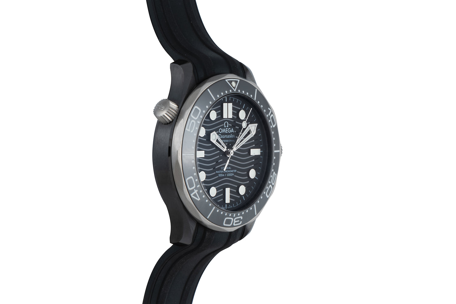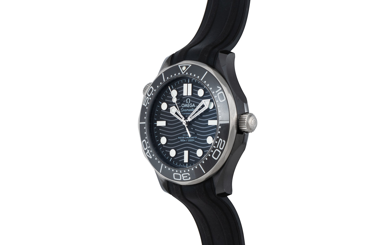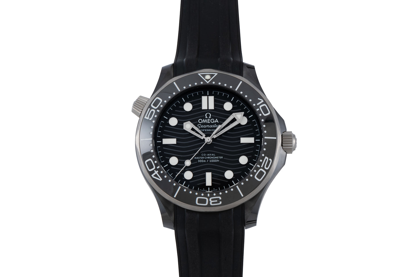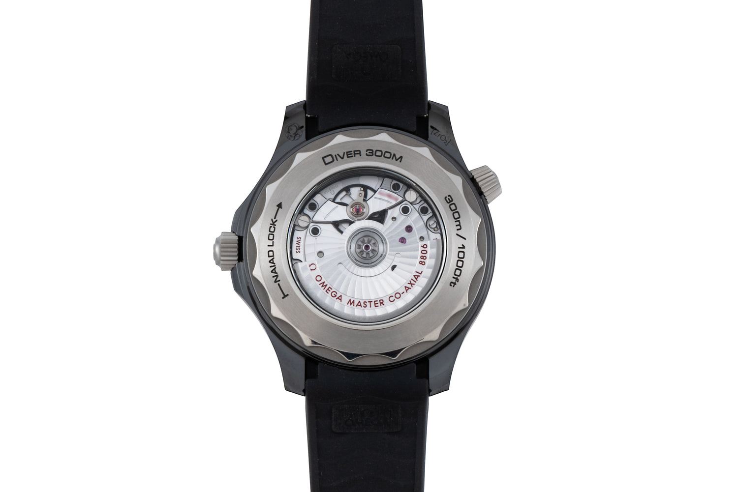 Fitted to an excellent signed black rubber strap with a signed, black ceramic pin buckle, this piece is powered by Omega's Calibre 8806 Master Chronometer automatic movement, which can be viewed through its sapphire caseback.