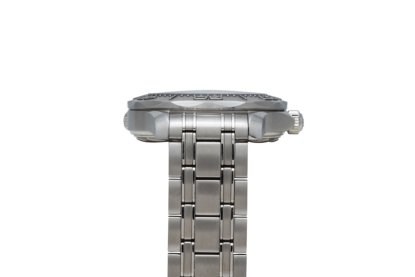 This example, a Seamaster 300M Nekton Edition Reference 210.30.42.20.01.002, was produced to celebrate Omega's collaboration with Nekton, a research foundation whose mission is to protect and conserve our oceans. It features the now-classic twisted-lug case design in 42mm with a helium escape valve at 10 o’clock, a Grade 5 titanium scalloped bezel with numerals and markers displayed in positive relief through a process called laser ablation, a signed crown, and a luminous black ceramic ‘wave’ dial with a matching 'skeletonized-sword' handset.