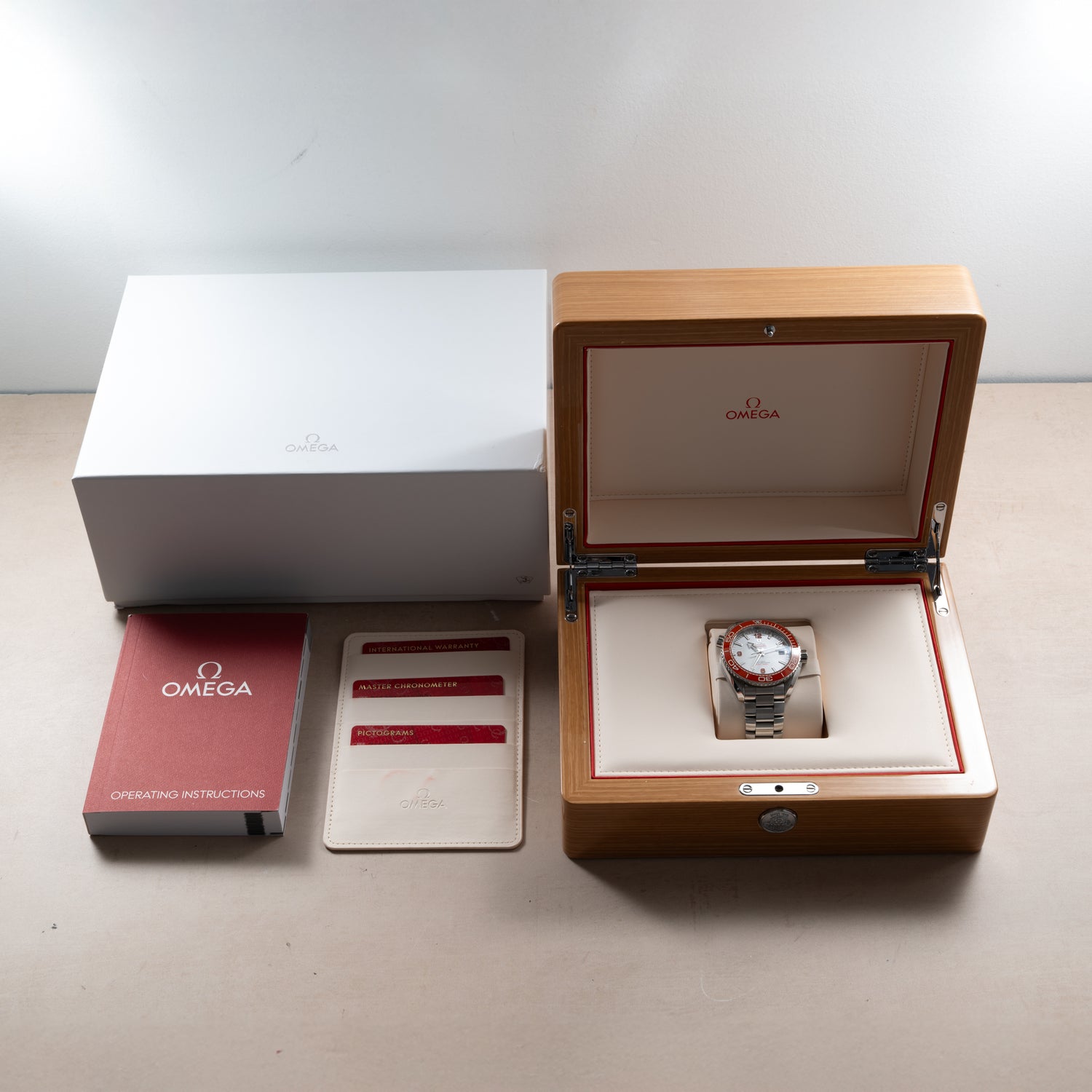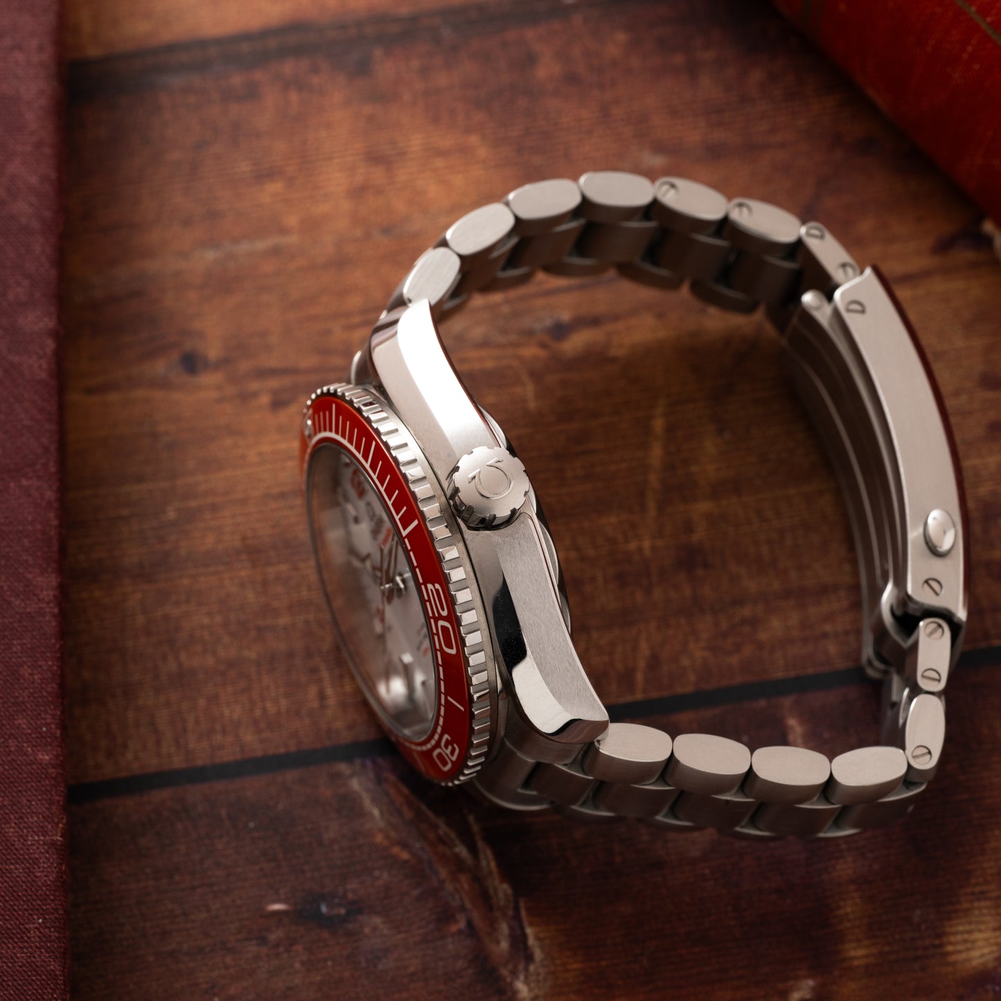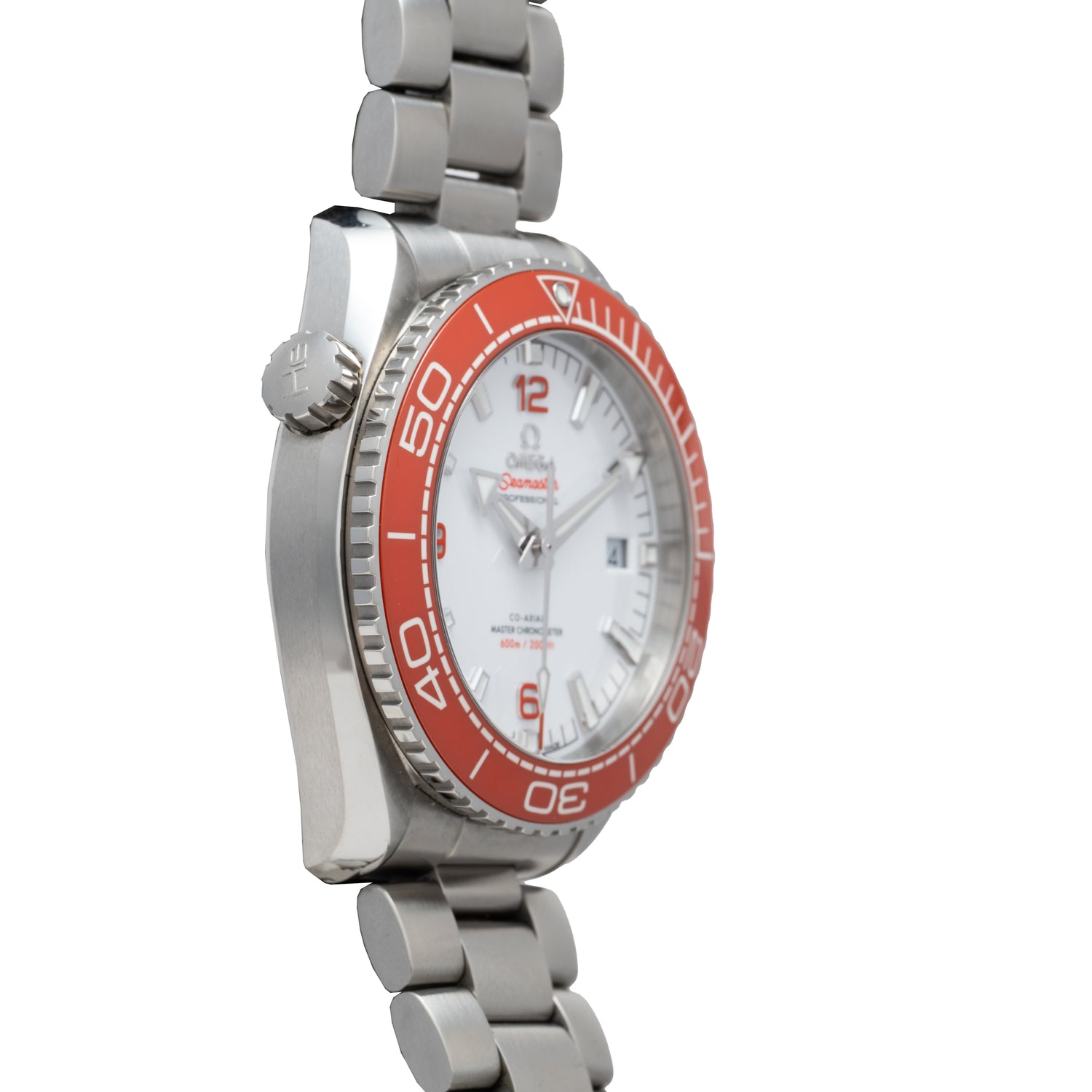This example, a Reference 215.30.44.21.04.001, features a 43.5mm twisted-lug case, sapphire crystal, a vibrant orange unidirectional ceramic timing bezel, gloss white dial with orange ‘Arabic’ indices and ‘broad arrow’ handset, a stainless steel multi-link bracelet with a signed adjustable locking clasp, and a helium escape valve at 10 o’clock. This Planet Ocean is perfect for someone who wants to go full-monte with the depth rating and technical features while having a bit more fun than your bog-standard black and steel diving watch aesthetic.
