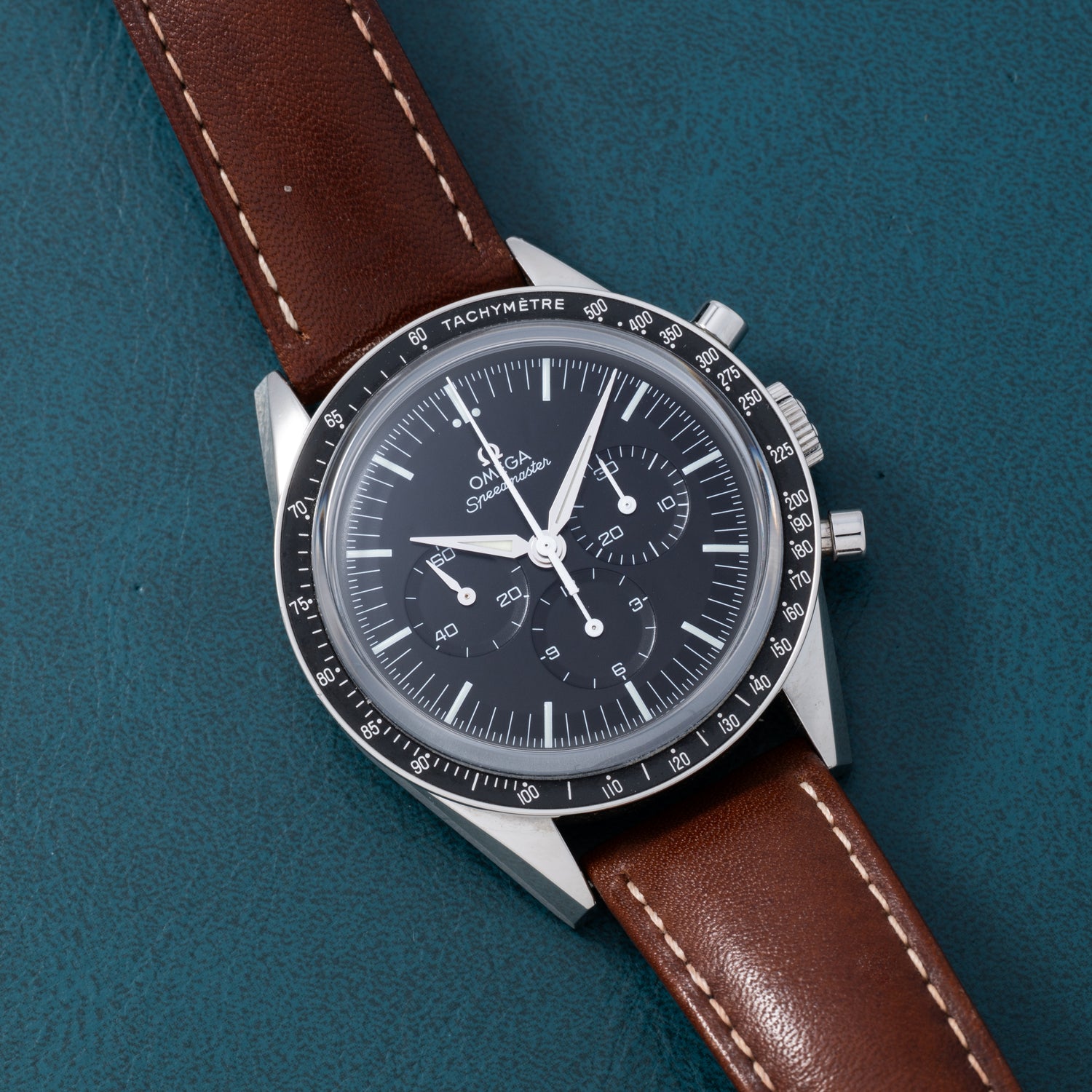 This particular example, a numbered Reference 311.32.40.30.01.001, dates to circa 2010s and was released in 2012 to commemorate the 50th anniversary of the 1962 First Omega in Space. This piece is completed with a variety of details characteristic of early Speedys, including the exposed pump pusher controls, and fixed lugs unlike the twisted lugs of the modern collection.