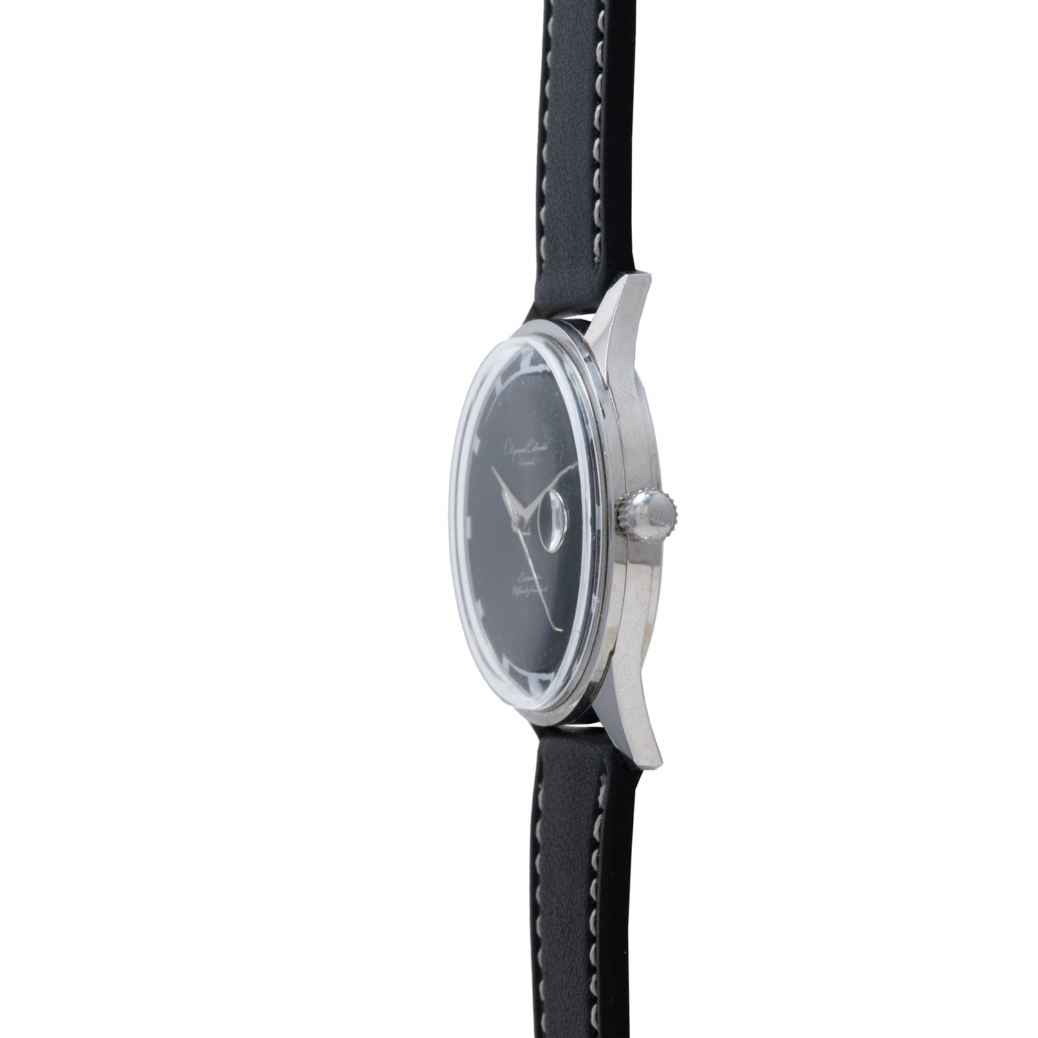 The Olympic Calendar Swimmer we have here is an excellent representation of the model, showcasing the unique floating dial, black subtly sun-rayed finish, and lovely 39mm case that made this piece a fan favorite in the 60s.