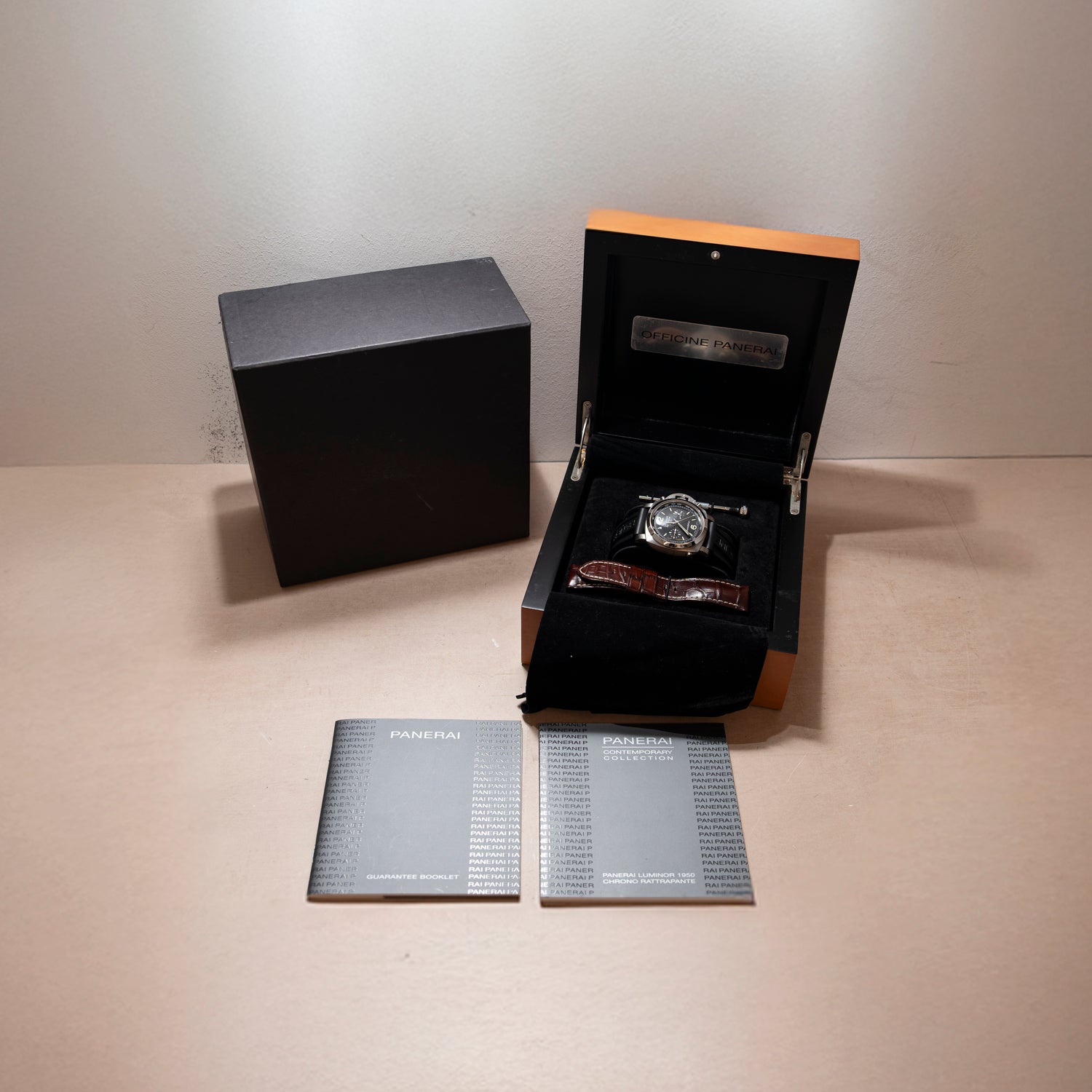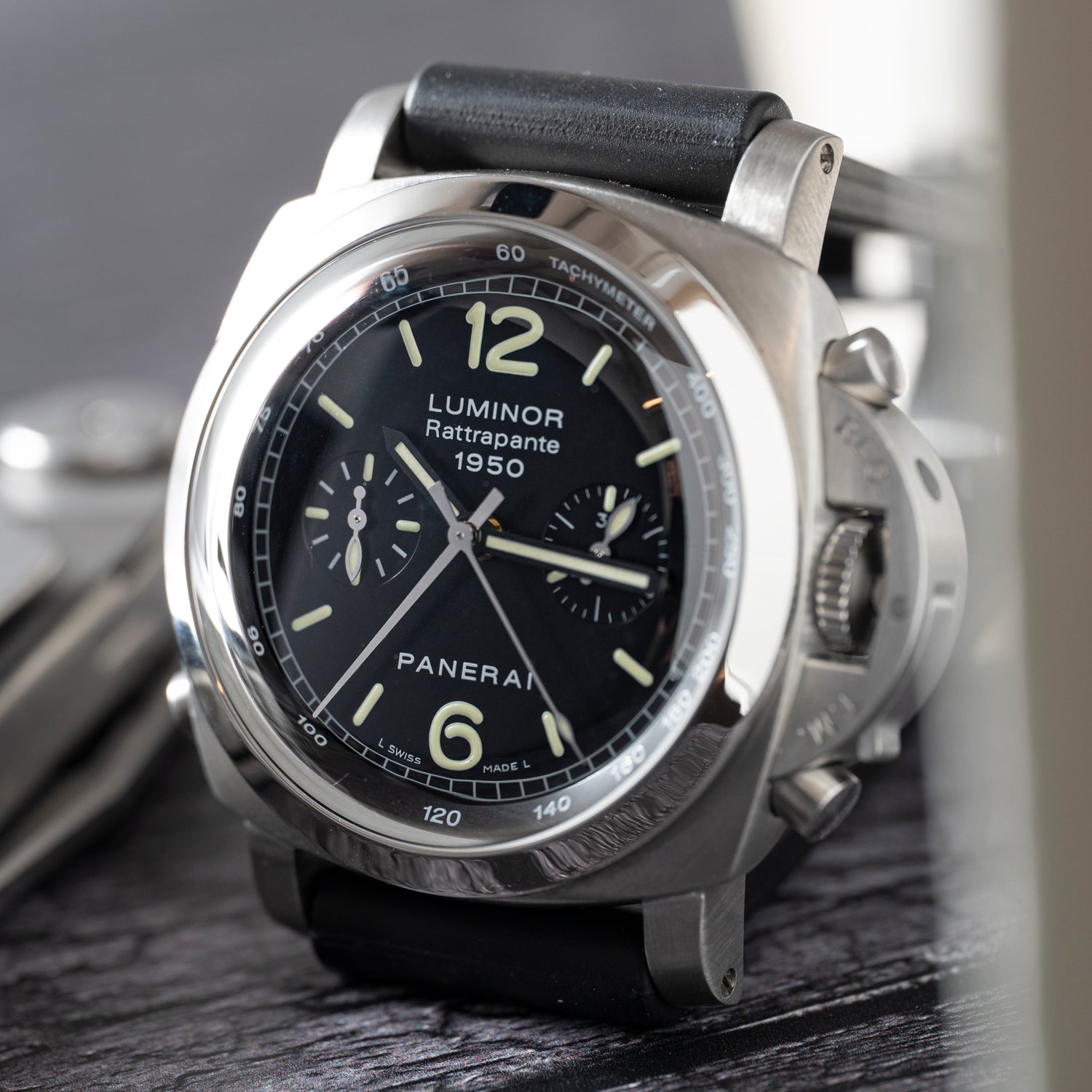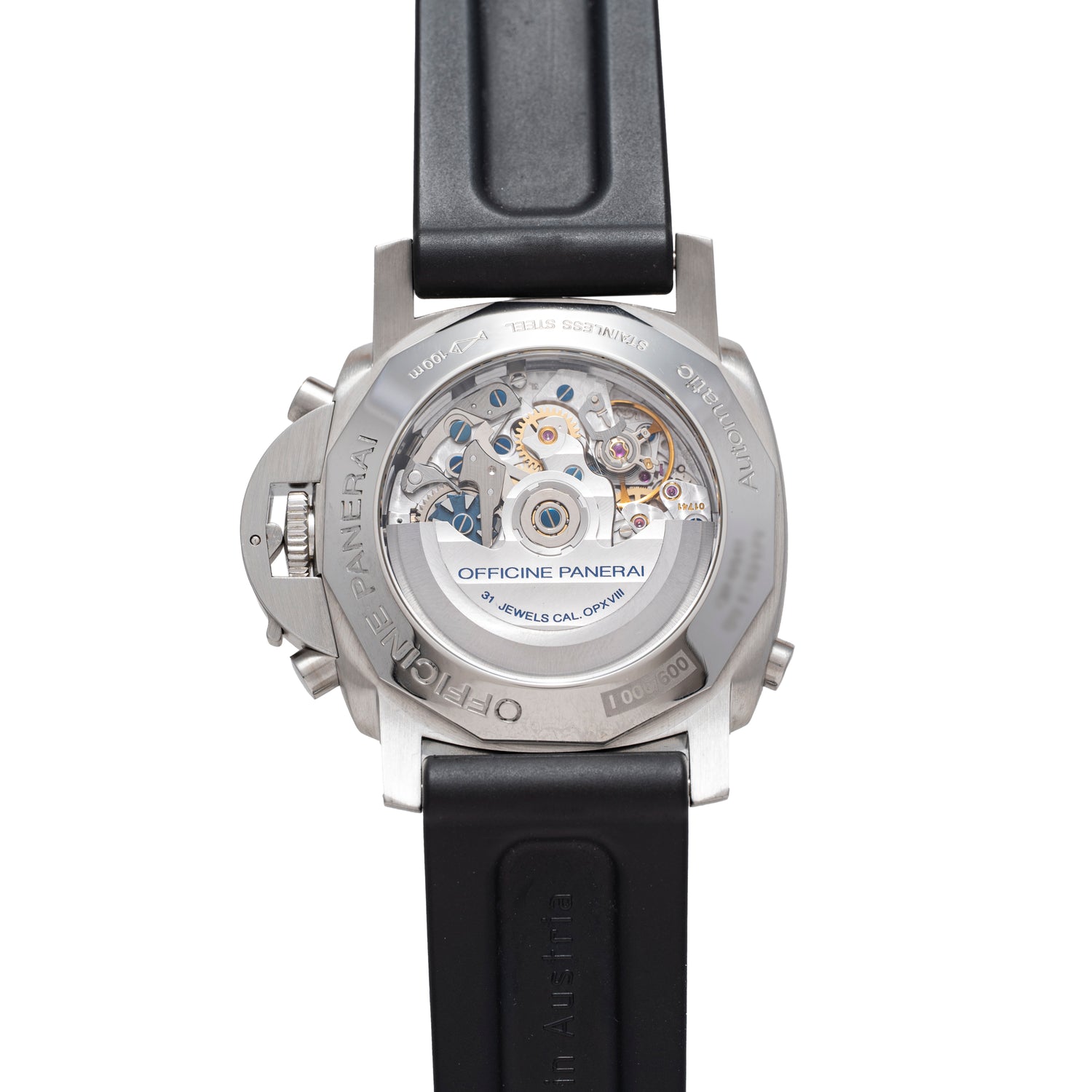 Housed in a 44mm brushed stainless steel Luminor case with a crown protection device, dual pump pushers, a smooth, polished bezel, and a sapphire crystal, it features a luminous black ‘sandwich’ dial with ‘Arabic’ and ‘dash’ indices, a lumed ‘baton’ handset, a running seconds register at 9 o'clock, and a counter at 3 o'clock.