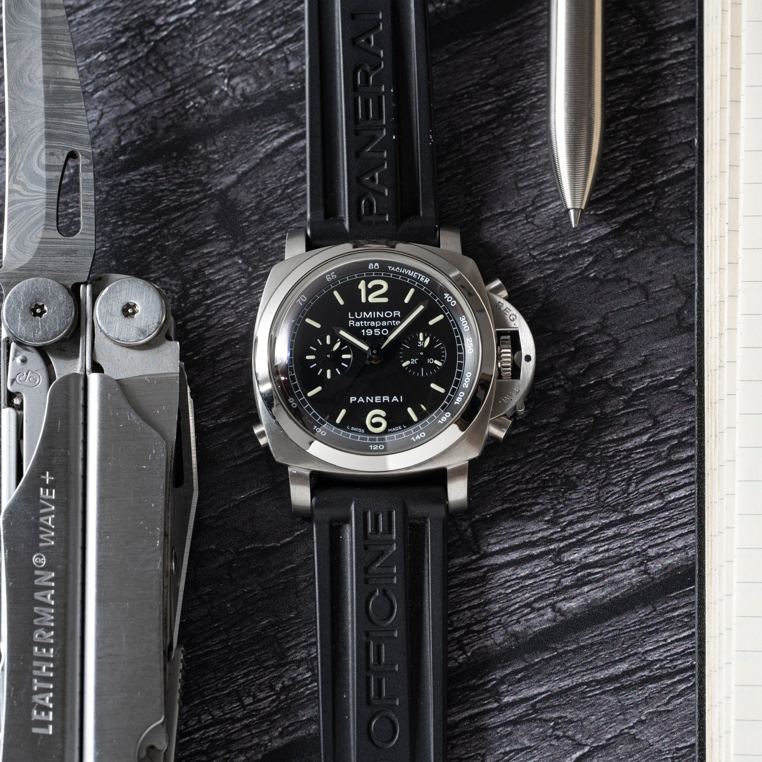 Powering this serious timing instrument is a robust automatic Panerai caliber visible through an exhibition caseback, while a black rubber strap completes the package. Accompanied by its factory goodies, this is a beautiful example of a contemporary Panerai that applies modern horological tech to a vintage-inspired package.