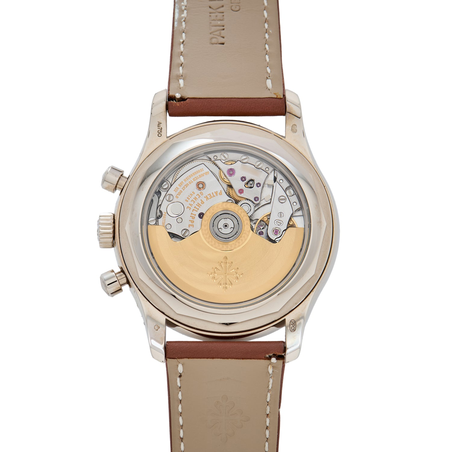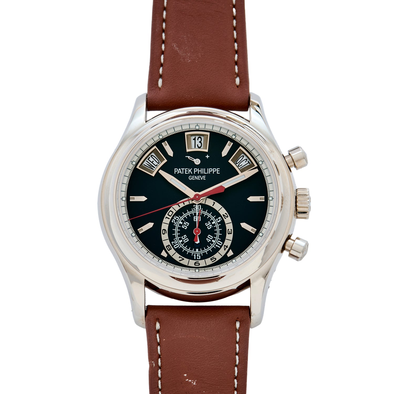 This piece transports us forward to the present day, offering a handsome modern interpretation of the Patek Philippe Complications Annual Calendar, paired with a flyback chronograph function. Designated Reference 5960/01G-001 , this lovely timepiece features an 18K white gold case with sculpted, contoured lugs, a polished bezel, pump pushers, and a signed crown.