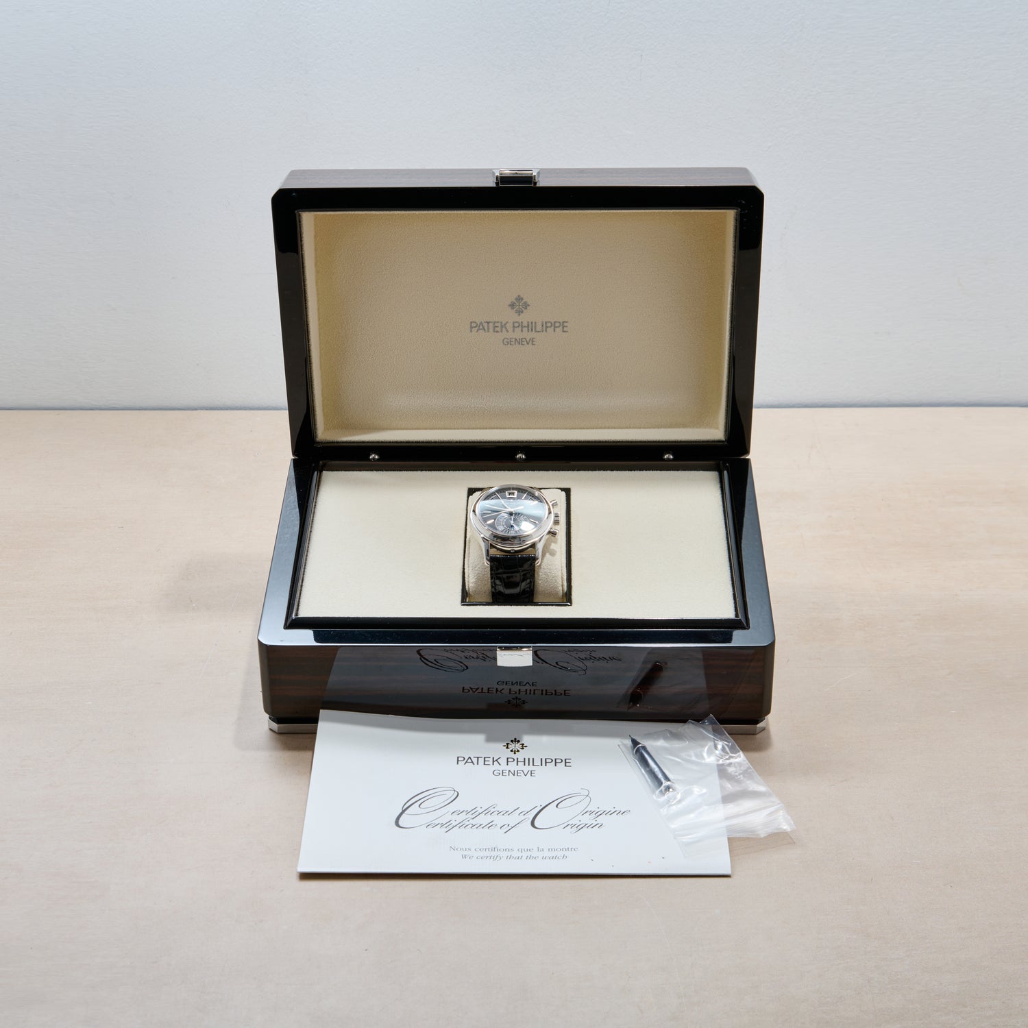 Flip the watch over, and one is greeted — via a sapphire exhibition caseback — with a view of the automatic Patek Philippe Calibre CH 28-520 QA 24H movement. Paired to a 21mm, signed black alligator leather strap with a signed, platinum deployant buckle, this is simply a stunning timepiece in every regard: horologically, aesthetically, and functionally. Moreover, it includes its factory goodies.