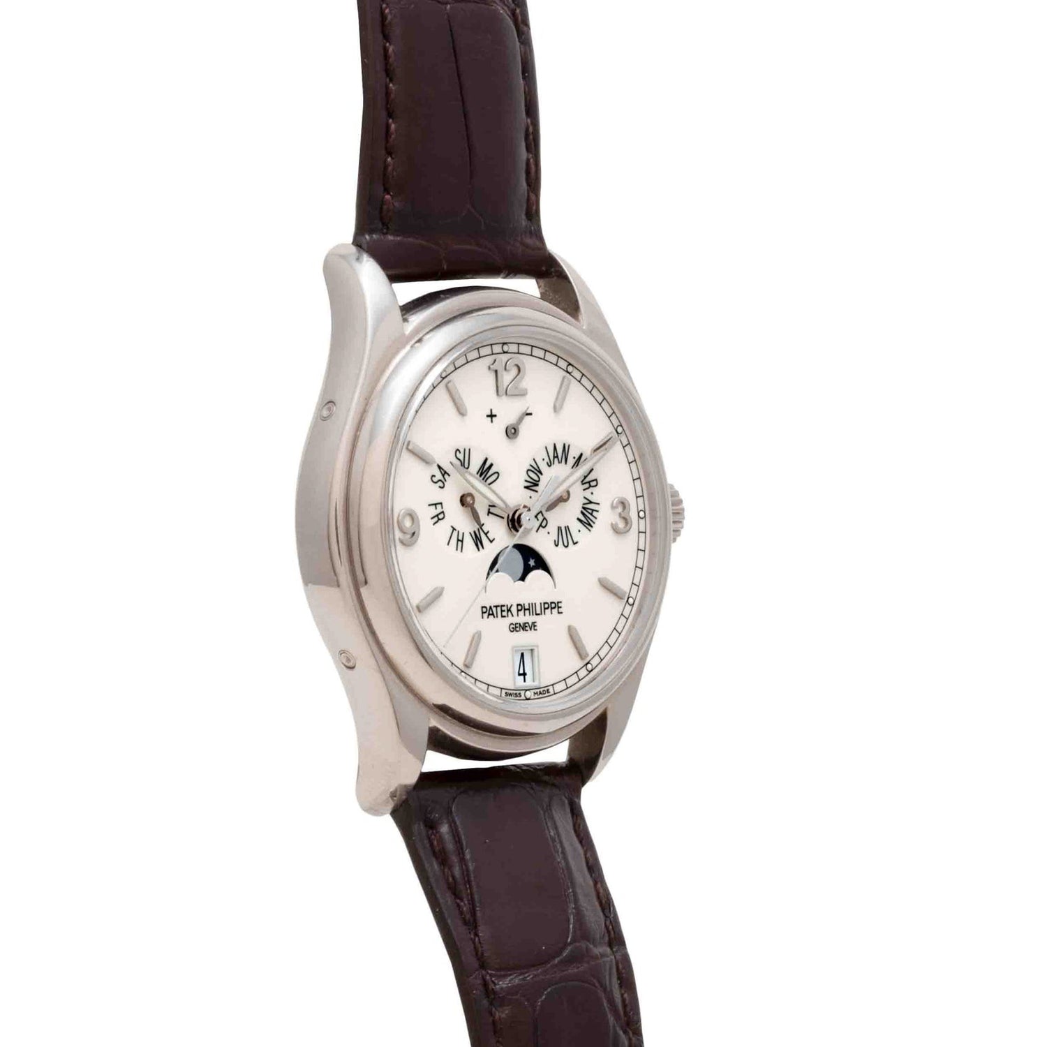 This example, a Reference 5146G-001, is housed in a beautifully proportioned 39mm 18k white gold case with a sapphire crystal, signed crown, and a smooth polished bezel. It features a charming ivory white dial with applied indices, recessed subsidiary registers indicating day and month, a moonphase aperture and date window at 6 o'clock, and a matching luminous 'feuille' handset.