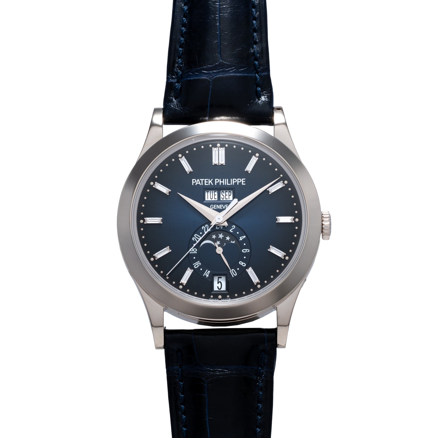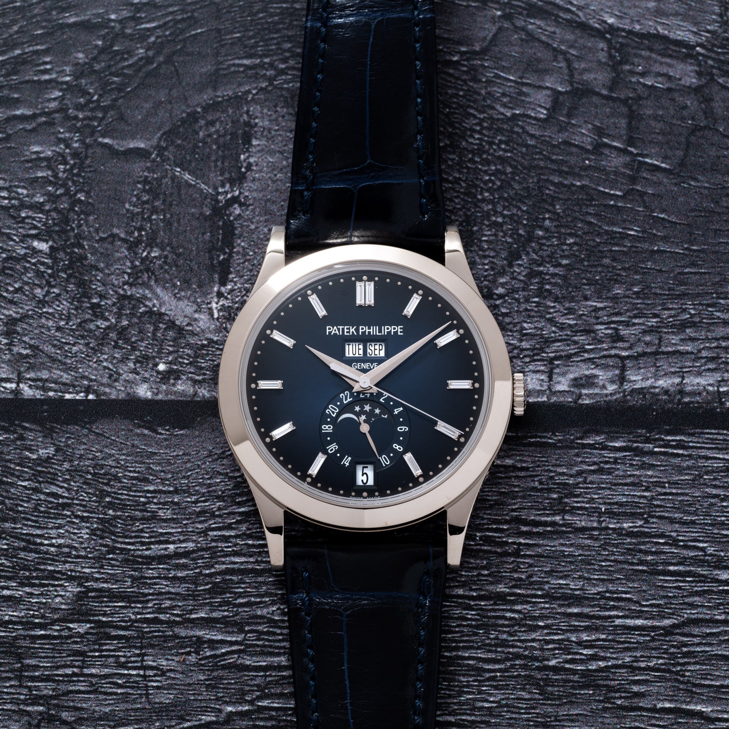 This particular example, a Reference 5396G-017, is housed in a beautifully proportioned 38.5mm white gold case with a sapphire crystal, a signed crown, and a polished bezel. It features an incredible blue sunburst fume dial with applied 'baguette' markers, a matching 'dauphine' handset, date, day of the week, month, and moonphase apertures, and a 24hr indicator at the 6:00 position.