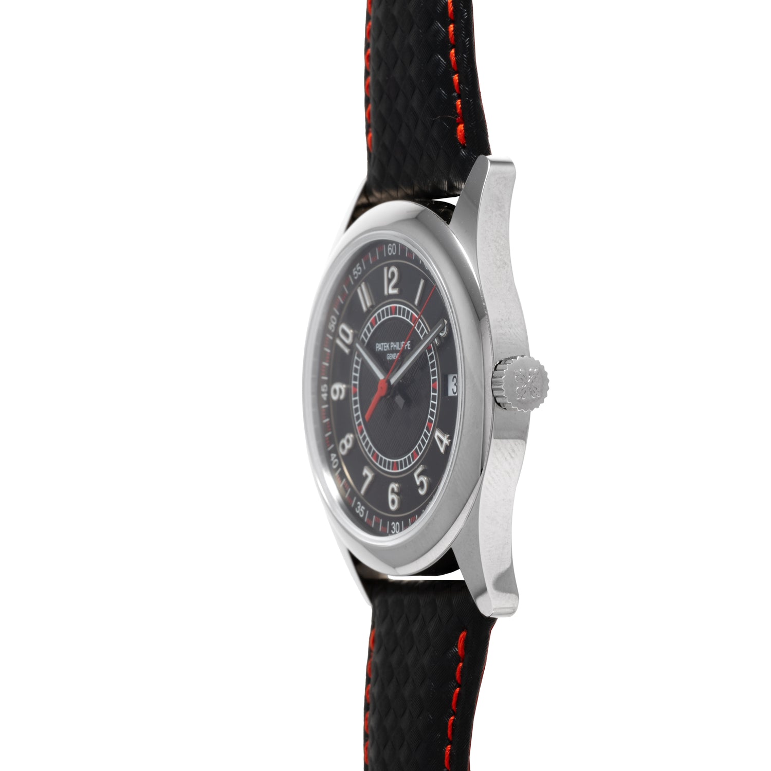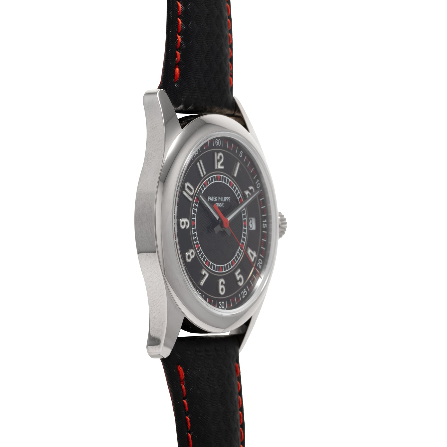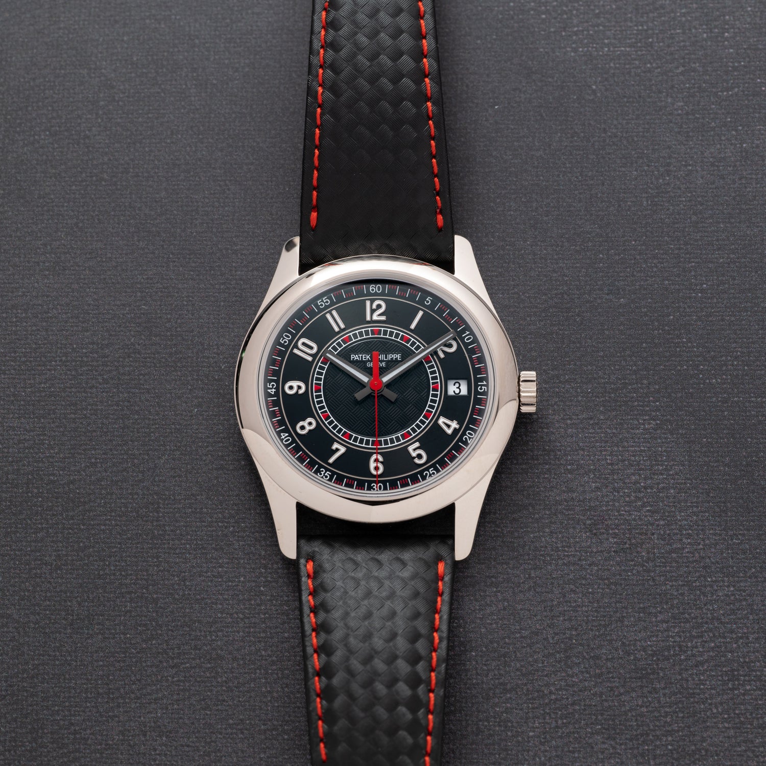 Housed in a 40mm 18K white gold case, this piece features a polished bezel and case complemented by a sapphire crystal and a signed crown. The black luminous dial features a matching white gold handset and radially configured, luminous, white gold Arabic indices. Straying away from the traditional dressier aesthetics of the Calatrava model, the Patek Philippe design team elected to add sportier design notes with its center dial adorned with a 'carbon' finish and a red accented, checker-style, minute track.