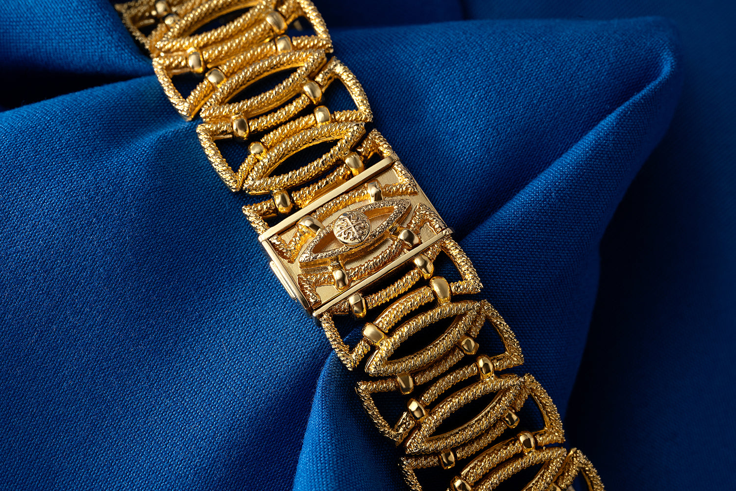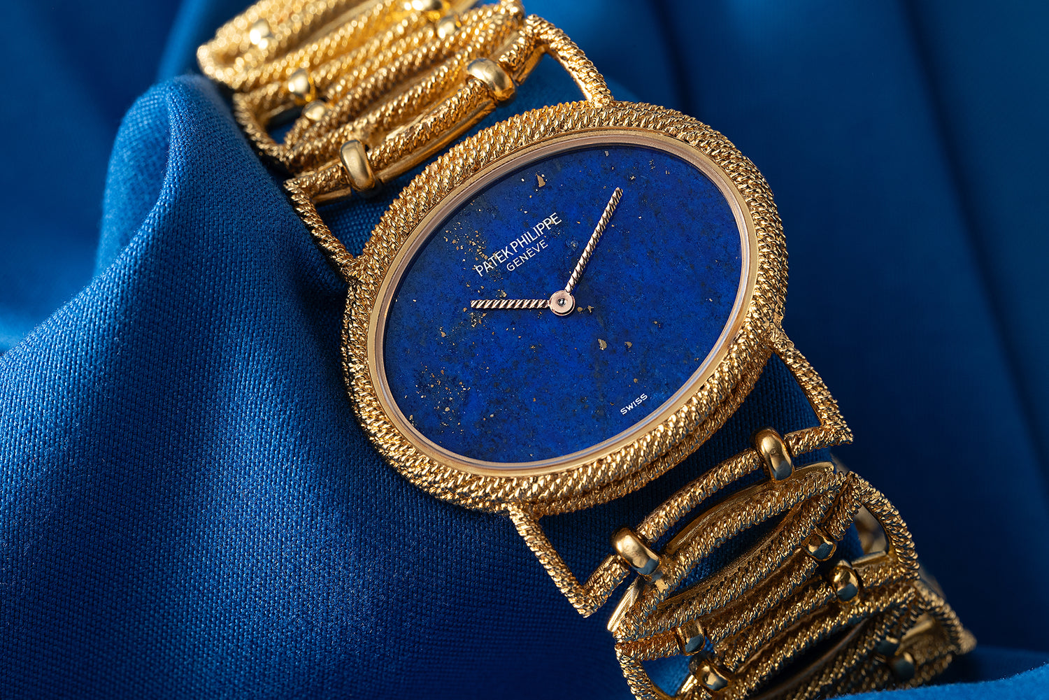 This particular example, a reference 4920-2, is wildly rare. It features a 32mm 18K yellow gold elliptical case with a woven 'rope' finishing and is paired to a matching stylized bracelet with a signed locking clasp. Furthermore, it has an exotic lapis lazuli stone dial with a matching stylized handset, a signed crown, and Pateks Calibre 12-250 manual winding movement within.