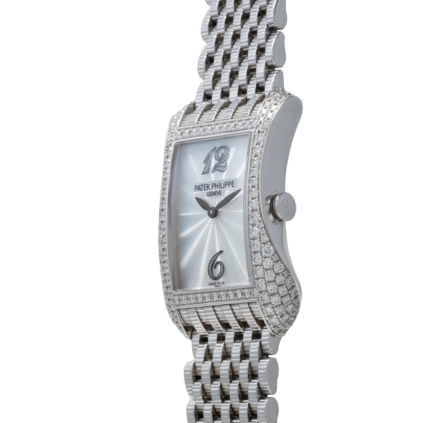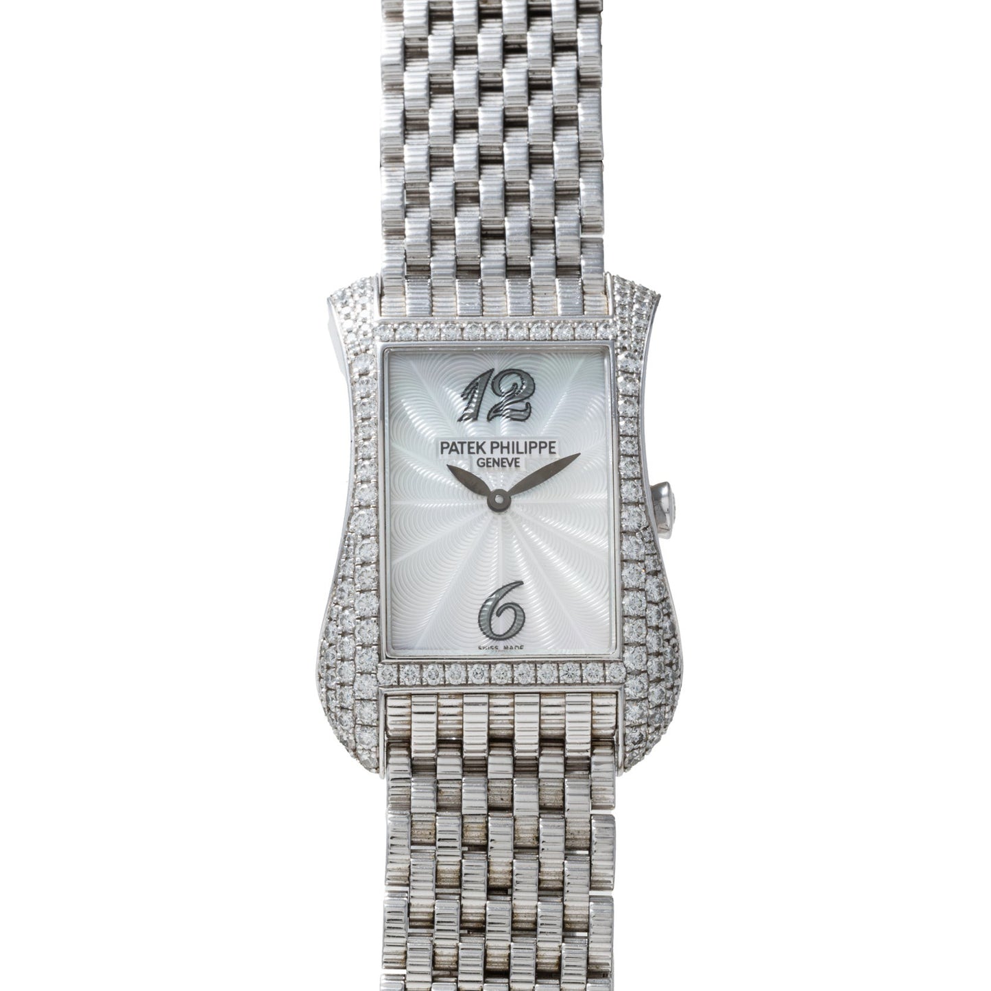 Take this ladies’ Gondolo ref. 4972G for example. It features a gorgeous, diamond encrusted 18K white gold curved case with 'tear-drop' profiles. Its 40mm x 27mm case houses a lovely white guilloche dial with a 'feuille' handset, and a reliable quartz movement within. To top it all off, this Gondolo is fitted to a stunning 'coin-edge' finish white gold multi-link bracelet.