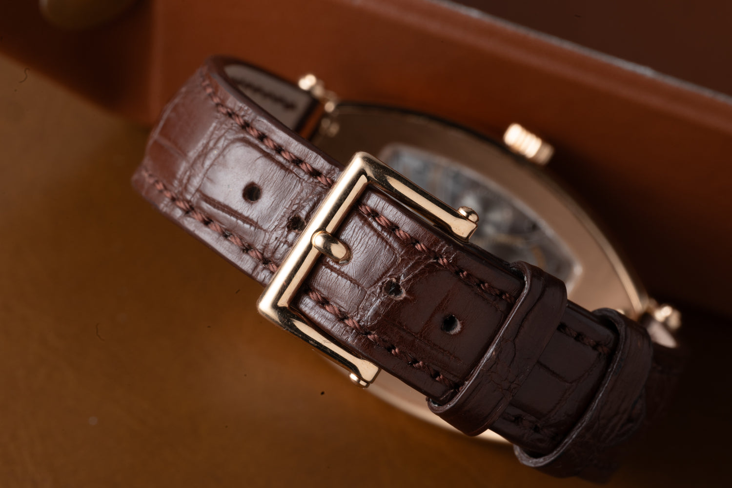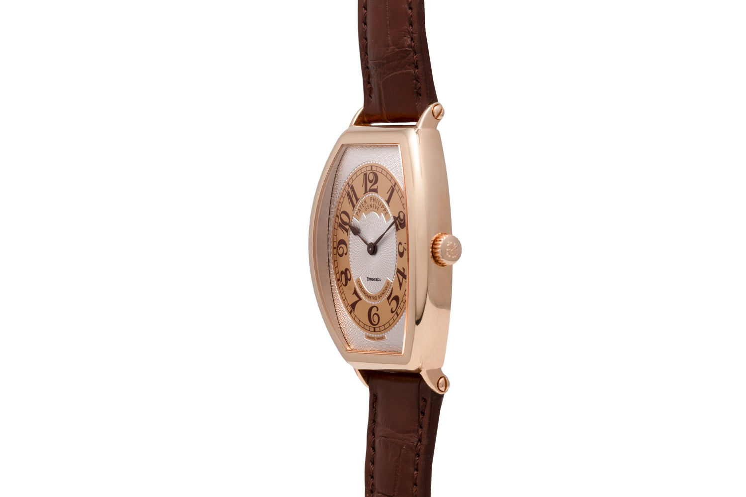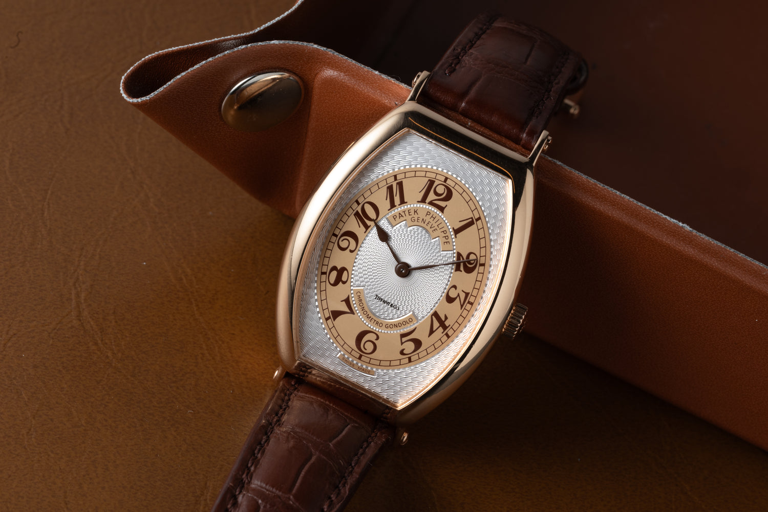 This particular Tiffany-signed Gondolo watch, a Reference 5098R, dates to the 2010s and features an 18k rose gold tonneau case with screw-set lugs, a curved sapphire crystal, a signed crown, and an exhibition caseback showcasing Patek’s manual-winding Calibre 25-21/176 movement. Its silver dial features a mesmerizing guilloché finish, a gold chapter ring housing stylized 'Arabic' indices printed in a brown tone, a nickel-blackened, white gold ‘spade’ handset, and a ‘Tiffany & Co.’ signature connecting the paralleled history of these two storied retailers.