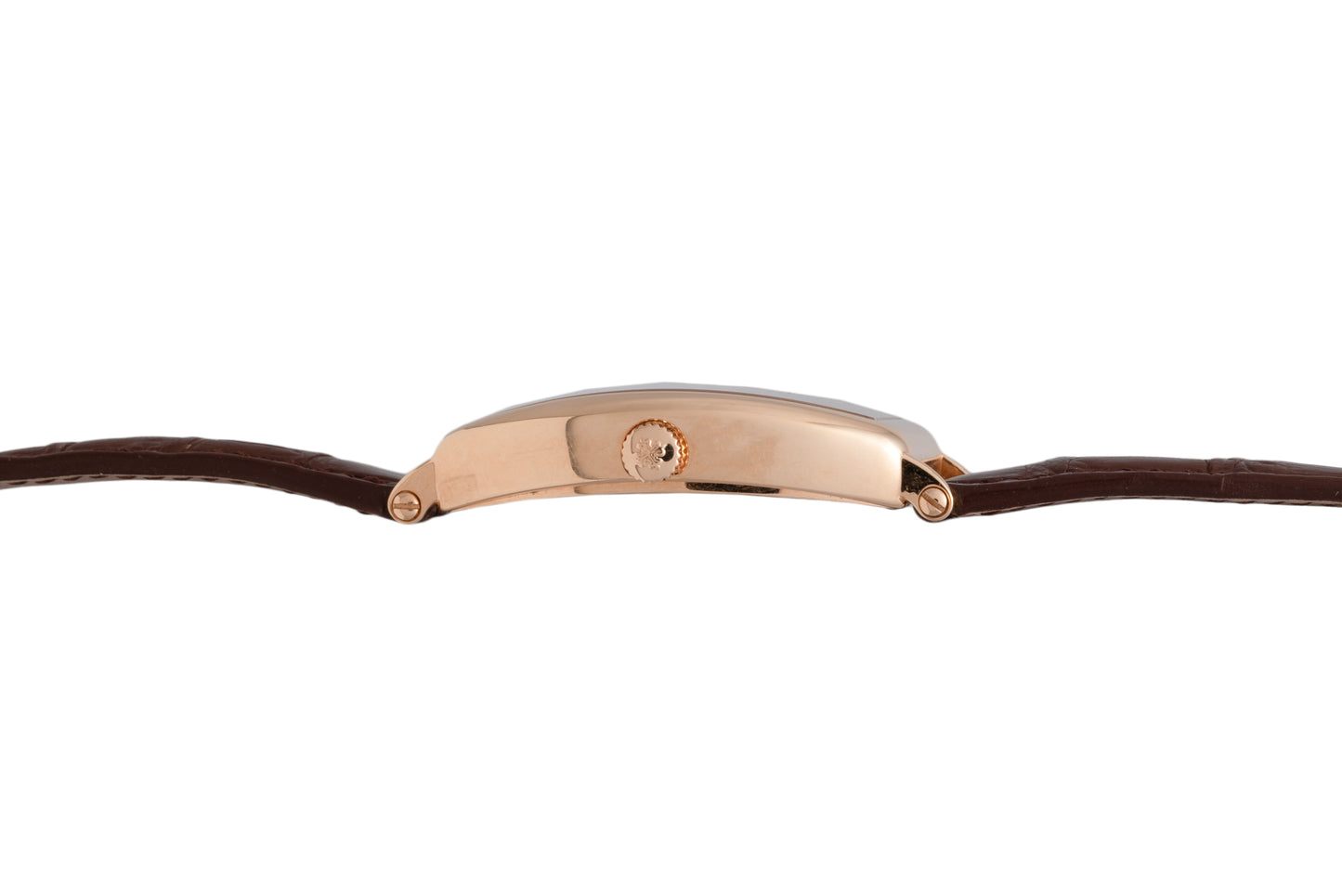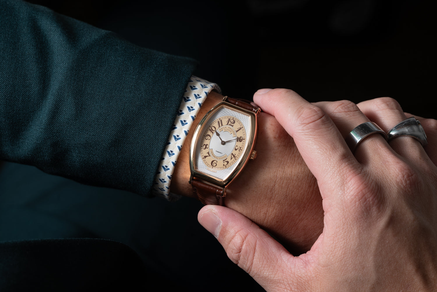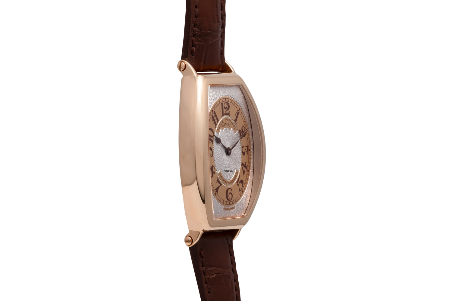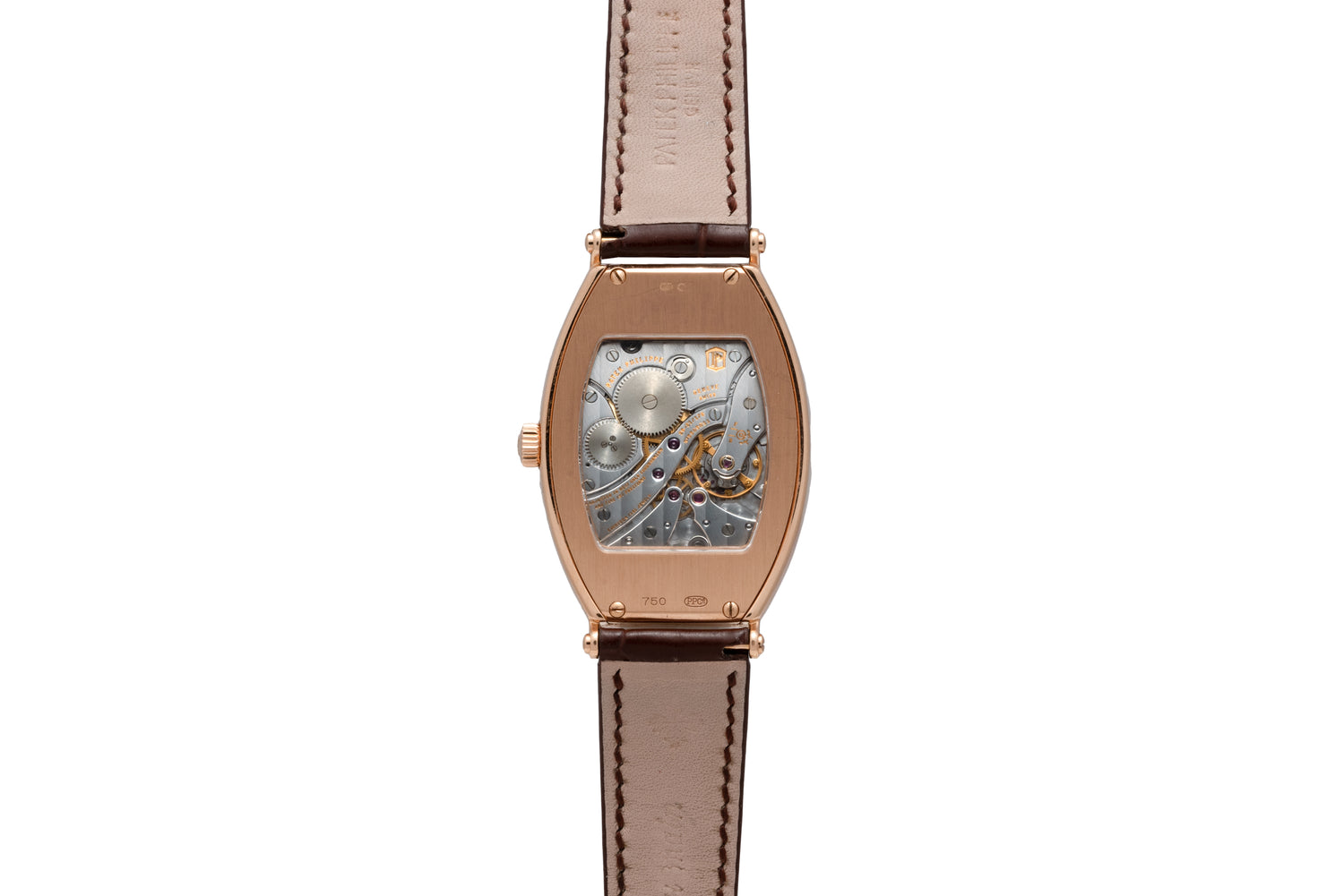 This particular Tiffany-signed Gondolo watch, a Reference 5098R, dates to the 2010s and features an 18k rose gold tonneau case with screw-set lugs, a curved sapphire crystal, a signed crown, and an exhibition caseback showcasing Patek’s manual-winding Calibre 25-21/176 movement. Its silver dial features a mesmerizing guilloché finish, a gold chapter ring housing stylized 'Arabic' indices printed in a brown tone, a nickel-blackened, white gold ‘spade’ handset, and a ‘Tiffany & Co.’ signature connecting the paralleled history of these two storied retailers.