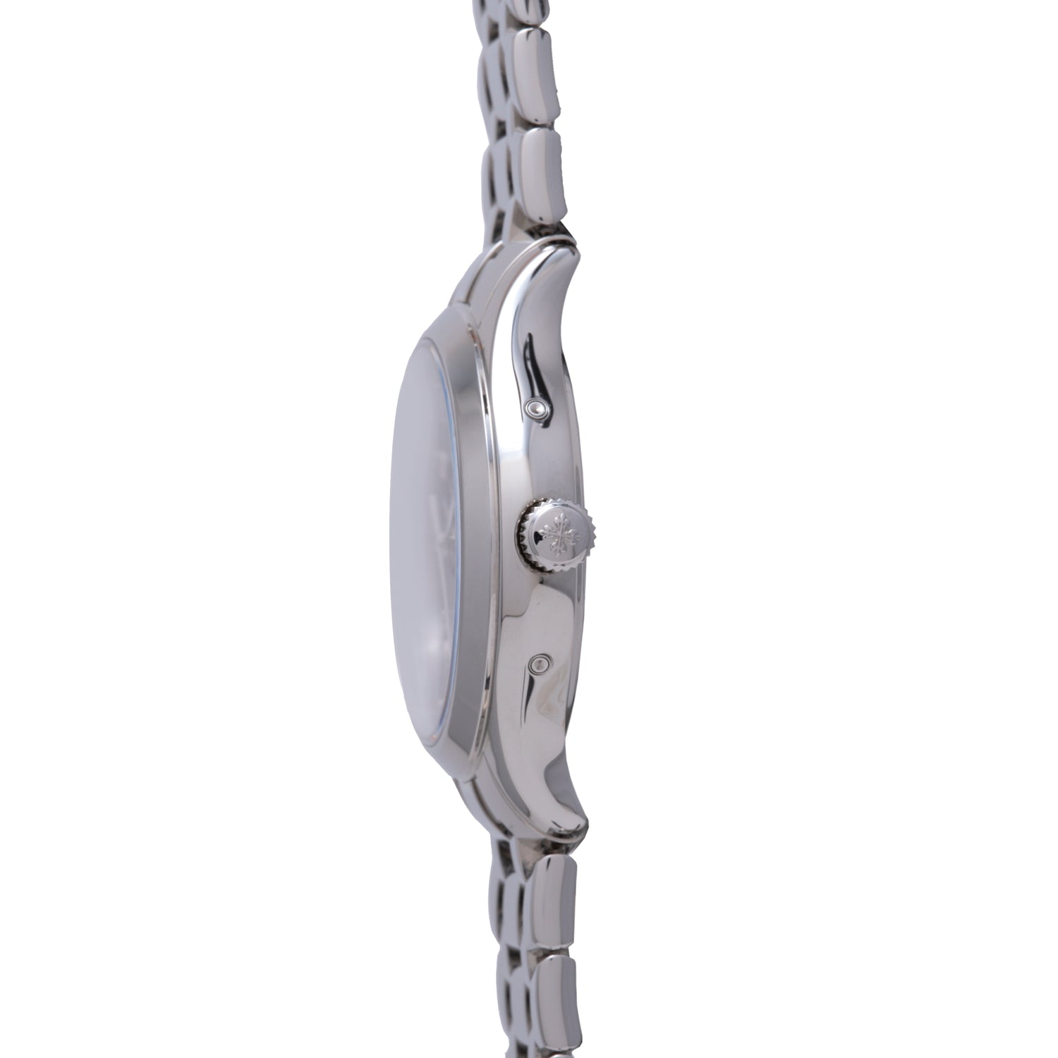 The reverse of the case features a a sapphire exhibition caseback providing a window through which you can admire the beautiful automatic-winding Patek movement and its yellow gold winding rotor adorned with the hallmark Patek Philippe seal. What's more, it comes fitted to a Patek Philippe multi-link bracelet with a hidden folding clasp, and includes its box, books, and Certificate of Origin.