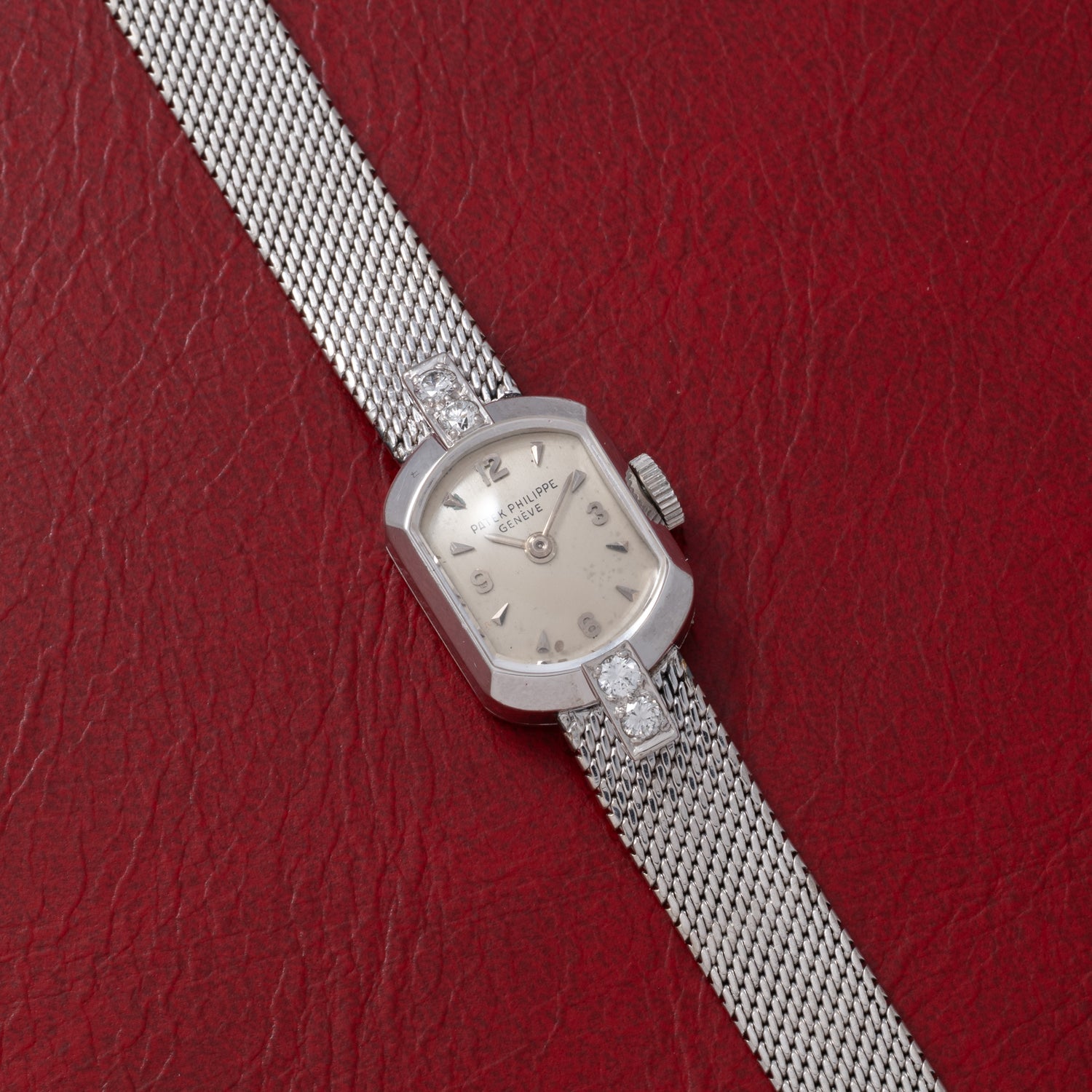 This particular timepiece is a Reference 3076 ladies' cocktail watch from the 1950s — a time when these thin, often diamond-encrusted pieces were still highly in vogue. Measuring approximately 14mm wide in a barrel-shaped white gold case, it features a smooth high polish bezel, an unsigned crown, and an acrylic crystal. Its simple silvered dial with applied 'Arabic' and 'dart' indices is joined by a matching 'pencil' handset, while a spectacular integrated bracelet is joined to the case with diamond-set lugs.