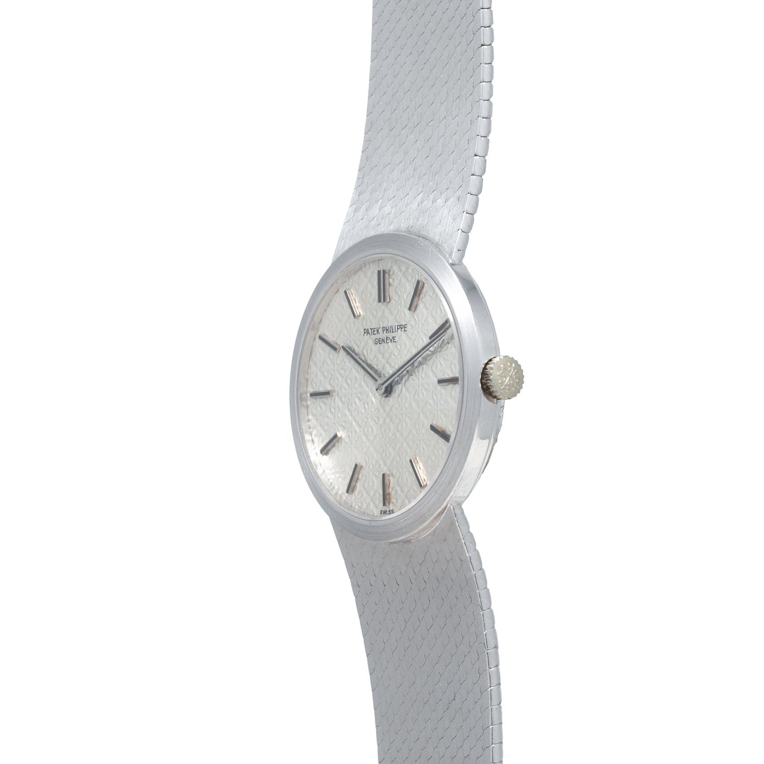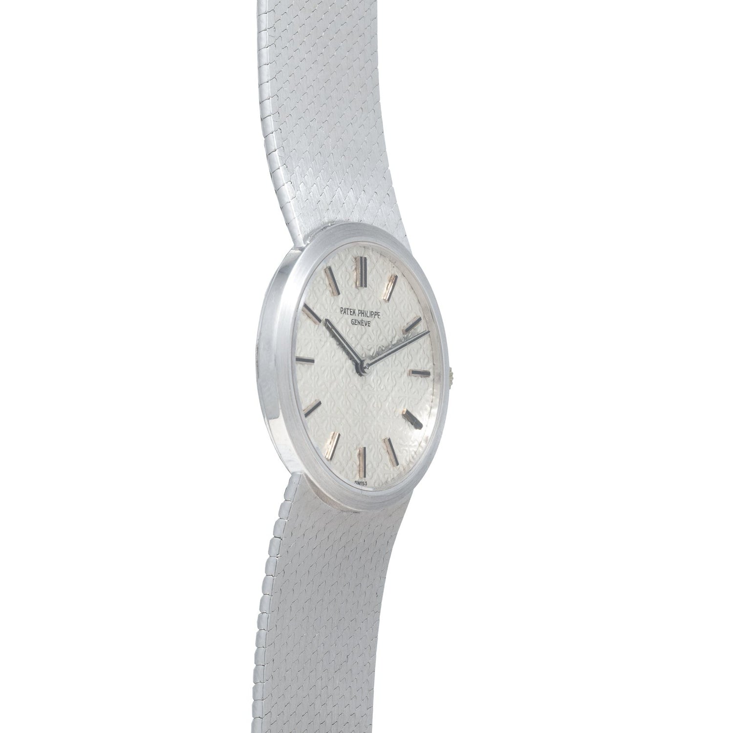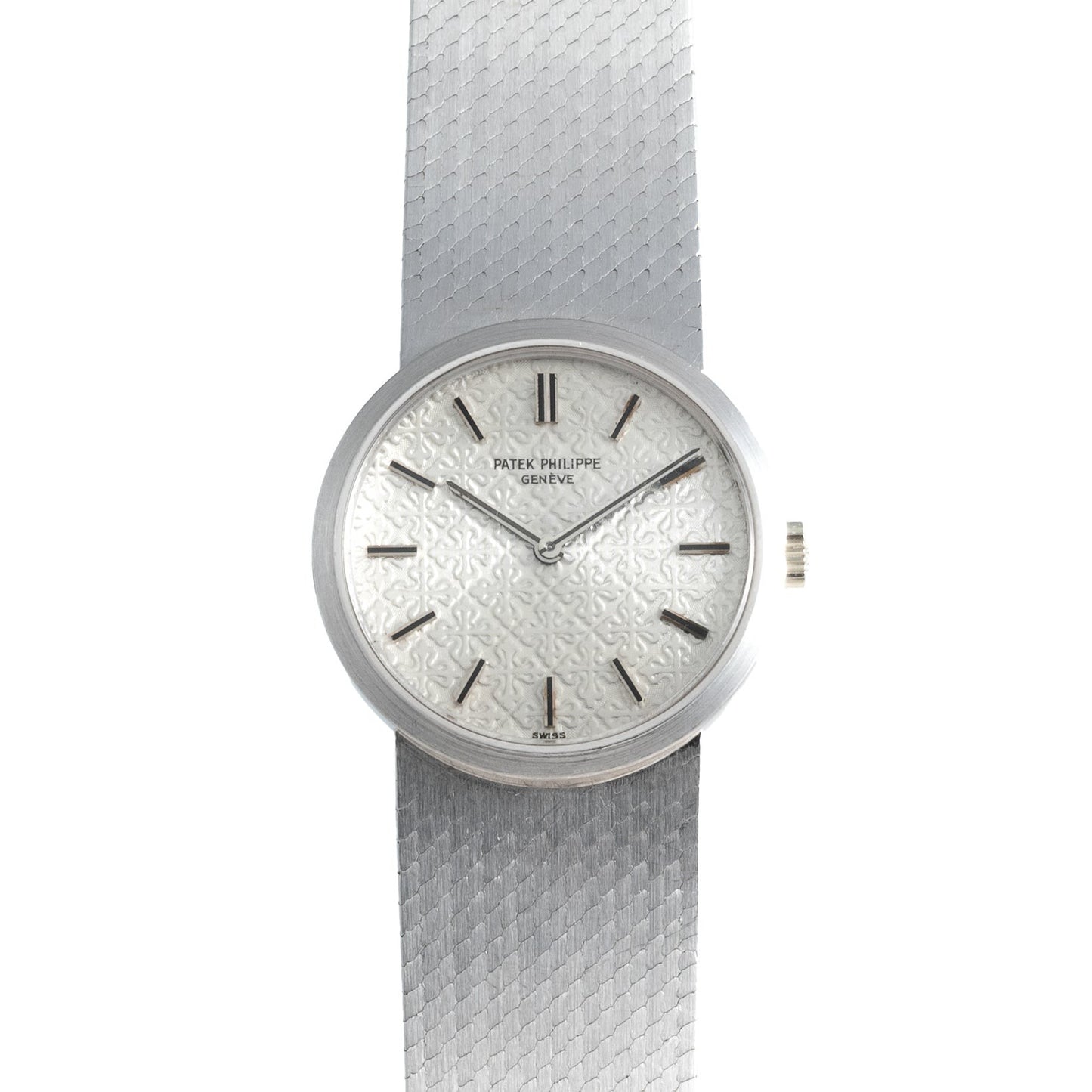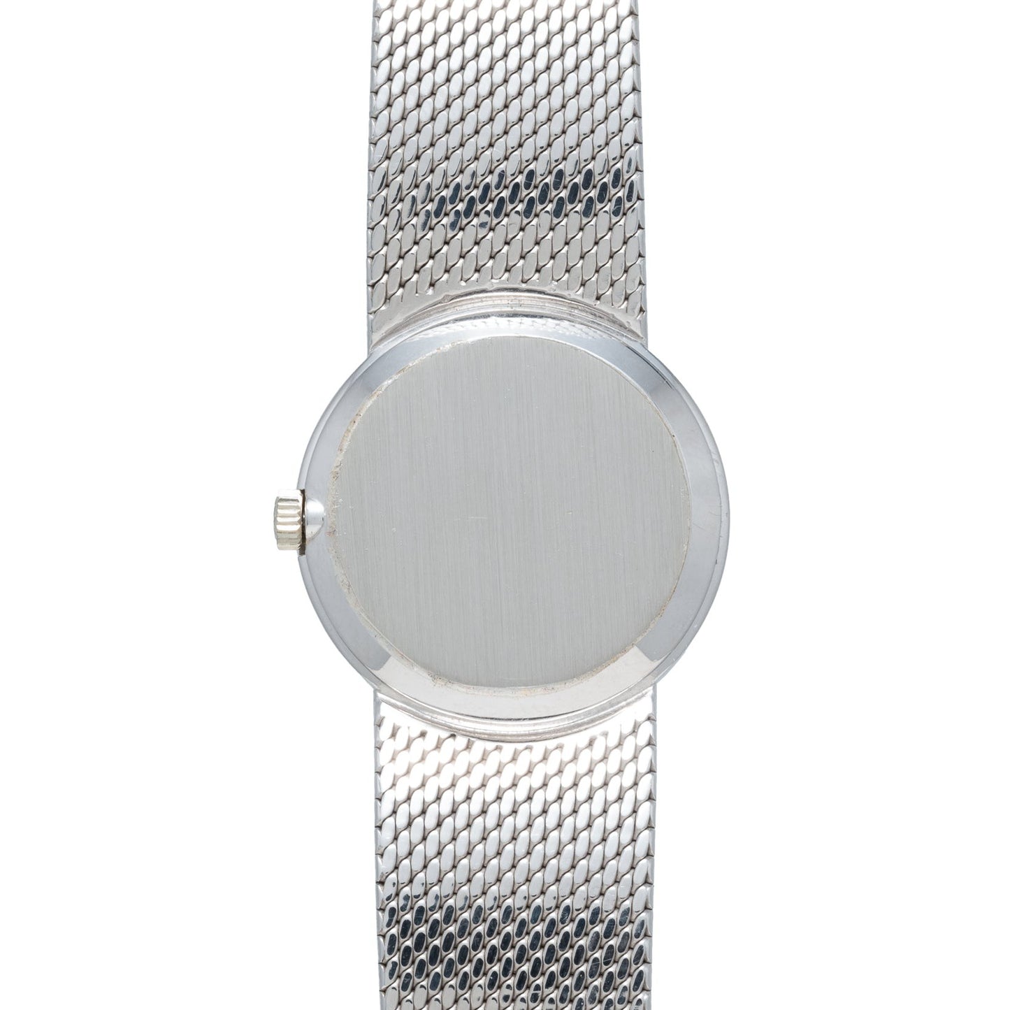 This piece, a Reference 4114/1G, dates back to the 1970s and features a round 25mm 18K white gold case with a satin brushed bezel, an acrylic crystal, a signed crown and a fantastic matching white gold integrated bracelet with a signed hook and lock clasp.