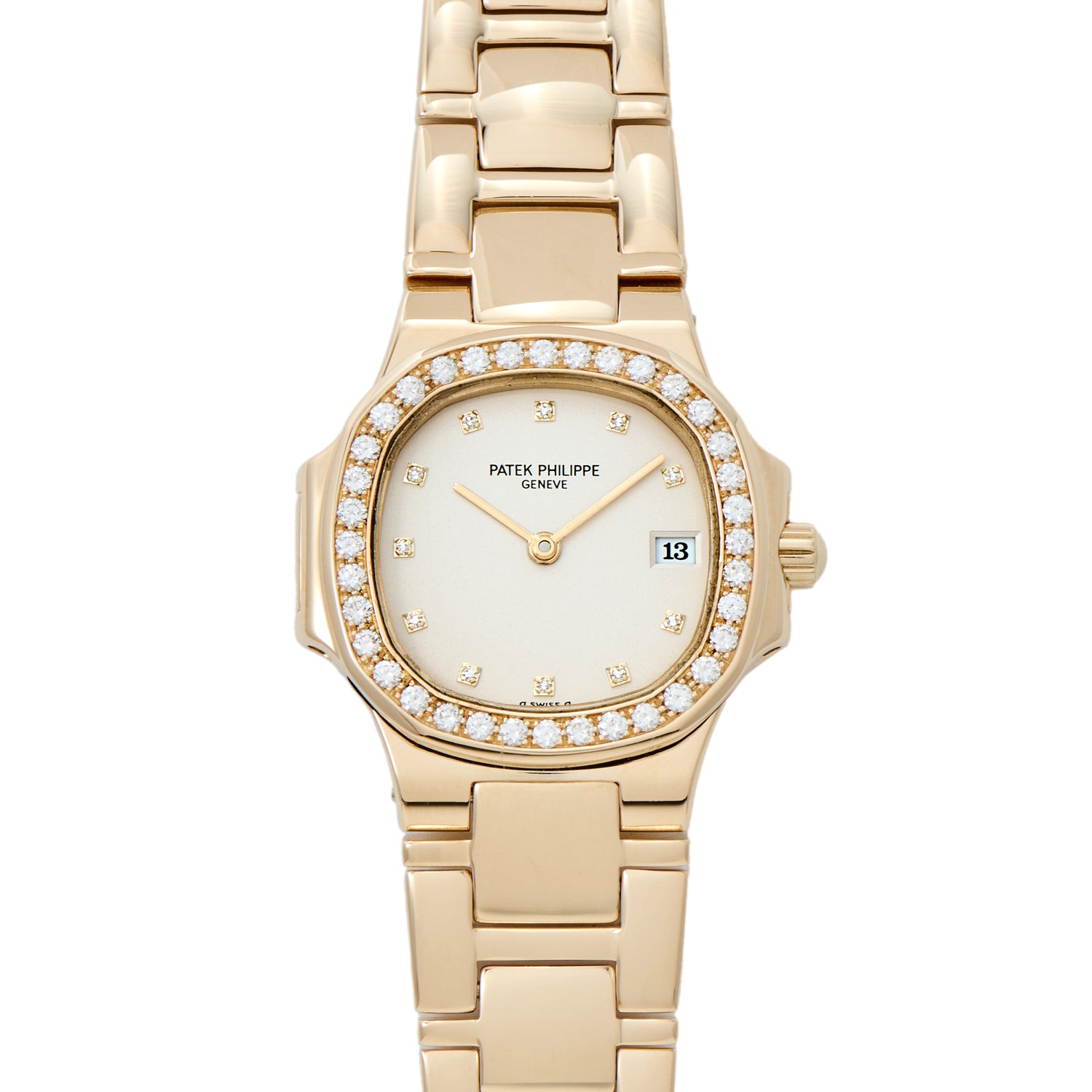 Housed in a 27mm yellow gold case, this example features a gold tone champagne dial with applied, diamond indices, a matching ‘pencil’ handset, and the aforementioned white date wheel. The bezel is set with a row of diamonds, framing this beautiful piece. Powered by a Patek Philippe quartz movement and paired to an integrated, yellow gold bracelet, it’s every bit as iconic as its larger, mechanical siblings.