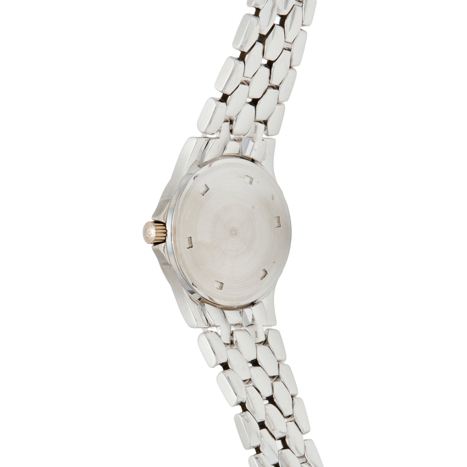 Inside a quartz movement keeps this piece running in time. Completing the look is the Neptune’s signature integrated bracelet — a multi-link, articulated design instantly recognizable to those who know.