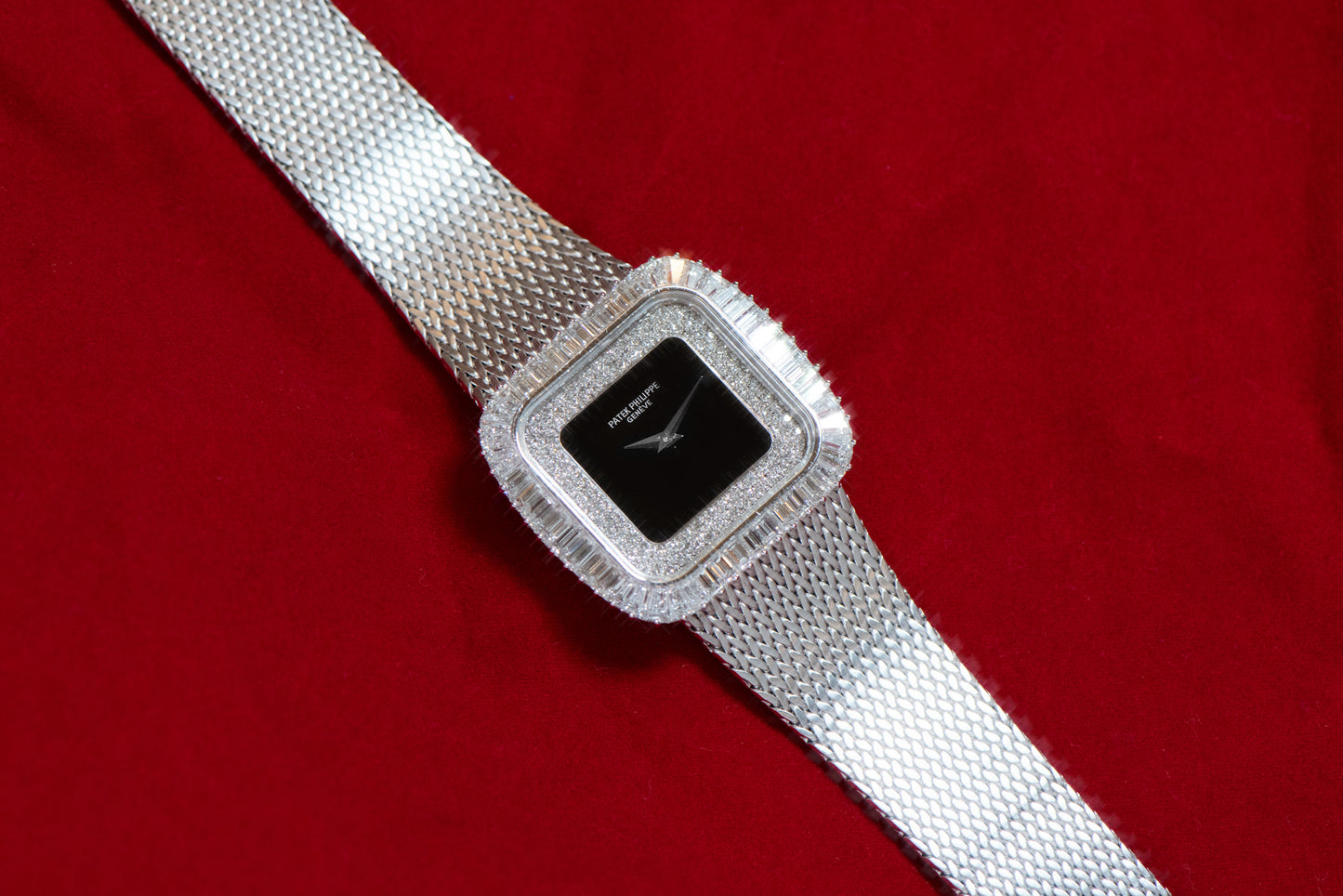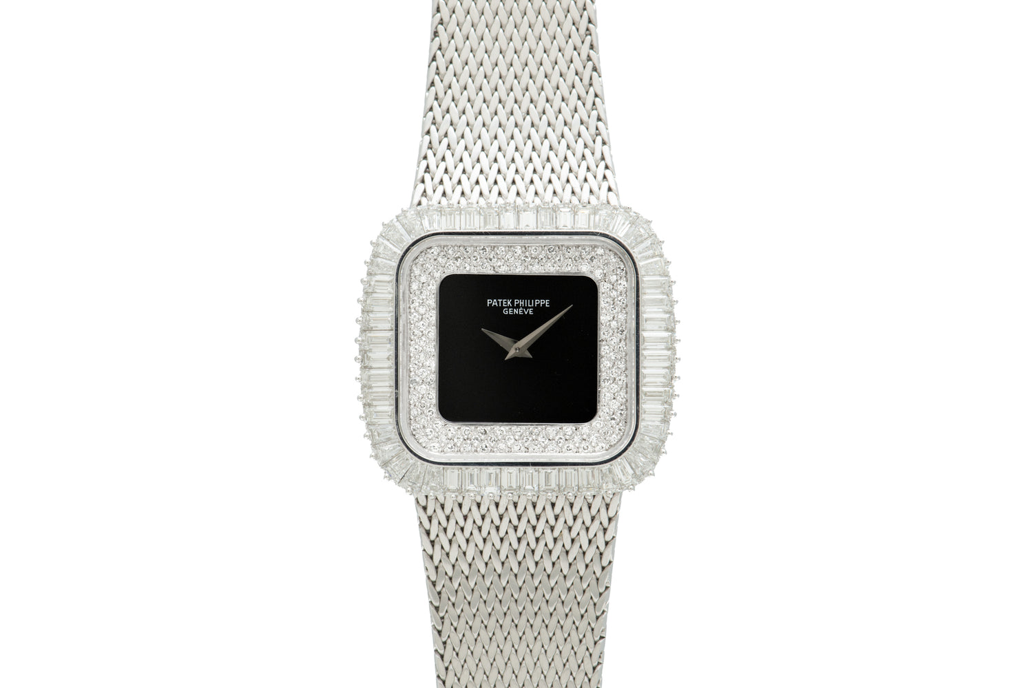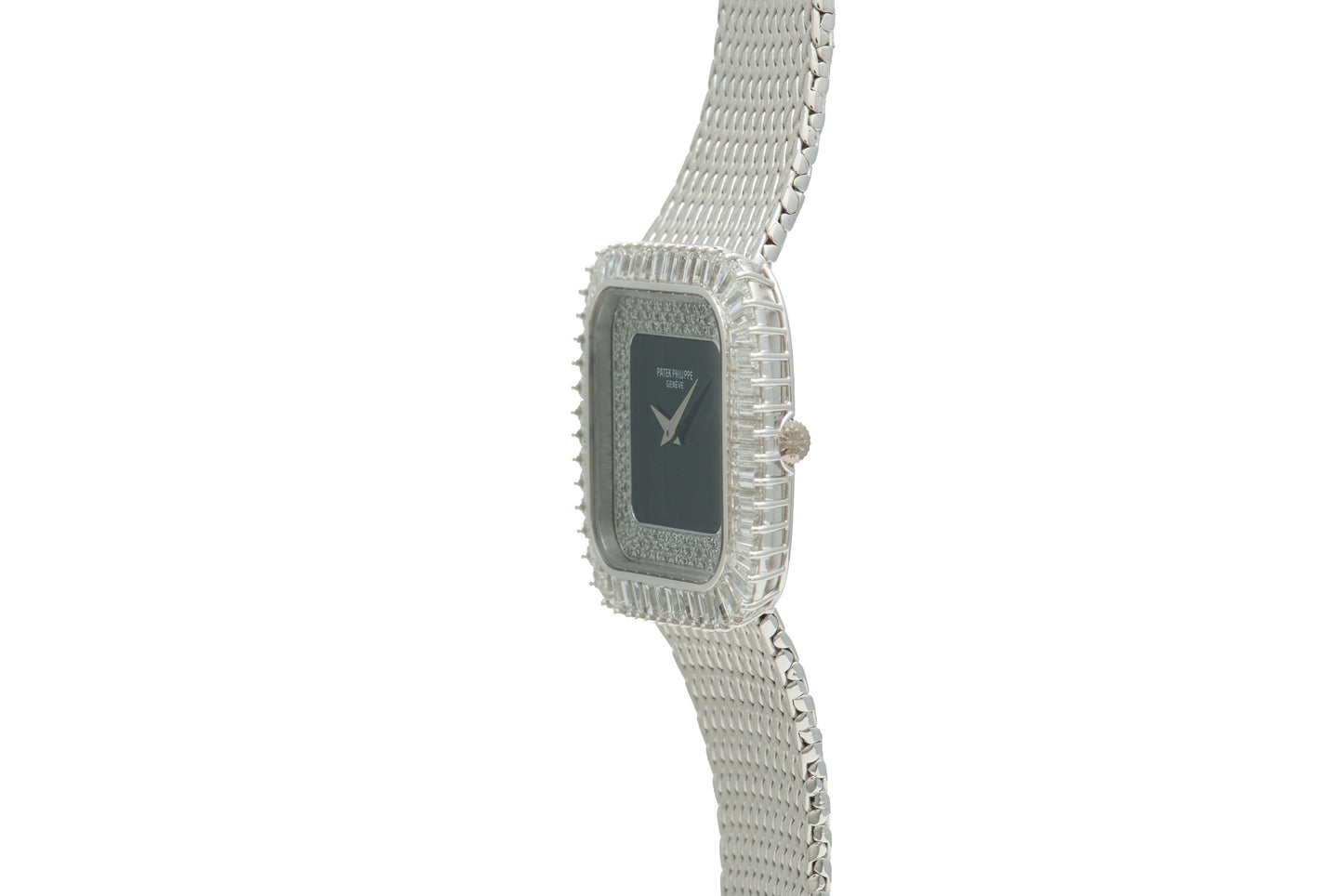 Constructed out of solid 18k white gold with a matching woven bracelet, this 32mm x 30mm 'TV' case piece features a sapphire crystal, a pave-diamond dial with a deep black Onyx stone center, a white gold 'dauphine' handset, and an absolutely gorgeous, baguette diamond-set bezel framing it all up. Inside, Patek Philippe's Calibre 16-250 movement is manually wound via a signed, shrouded crown.