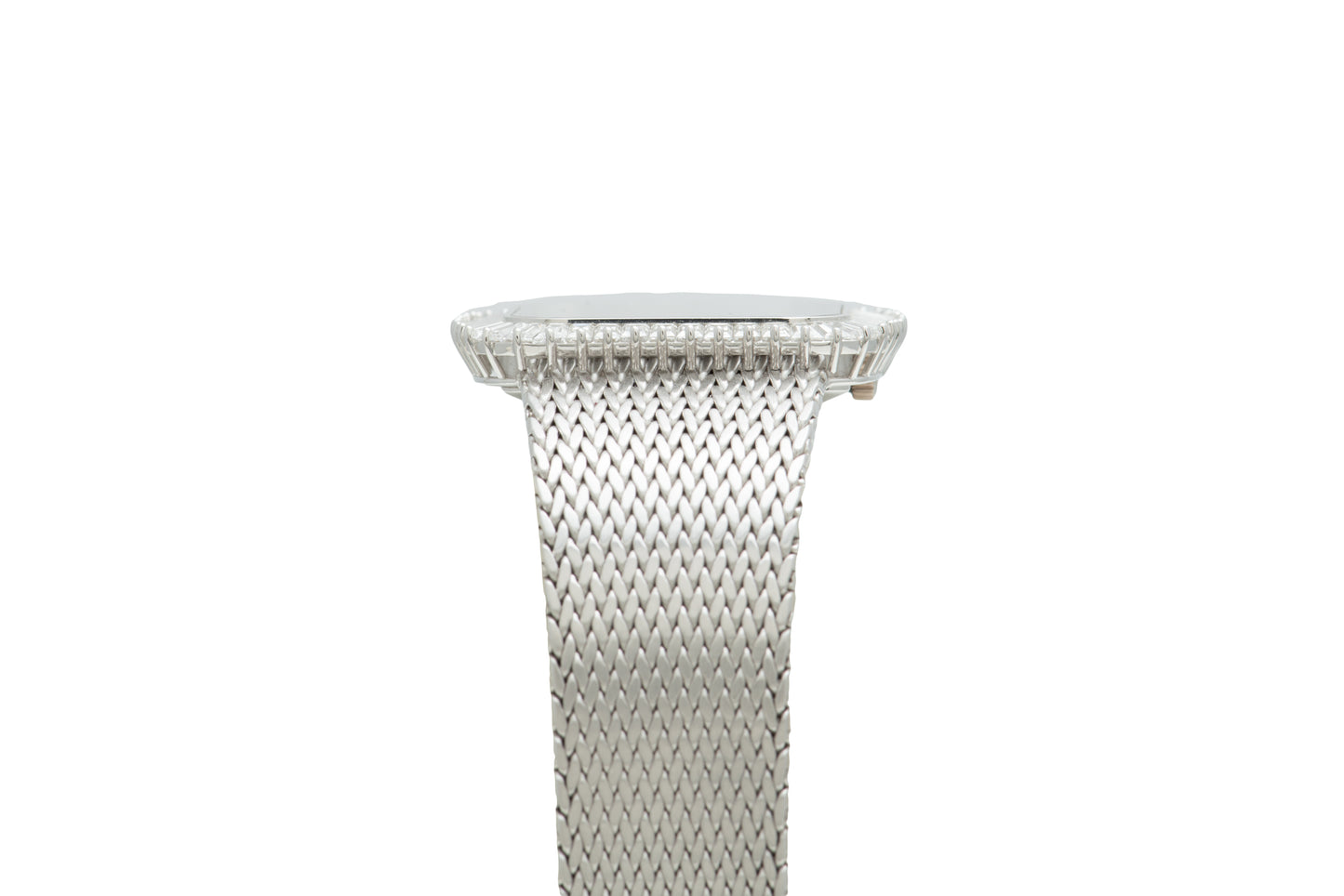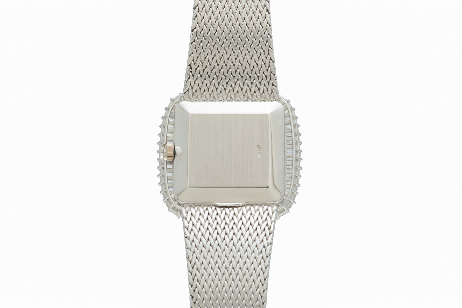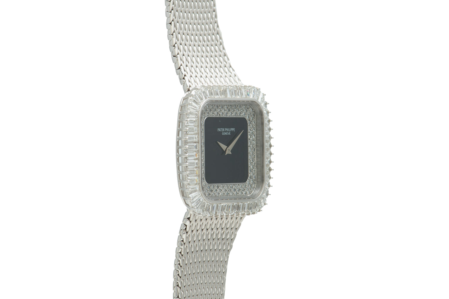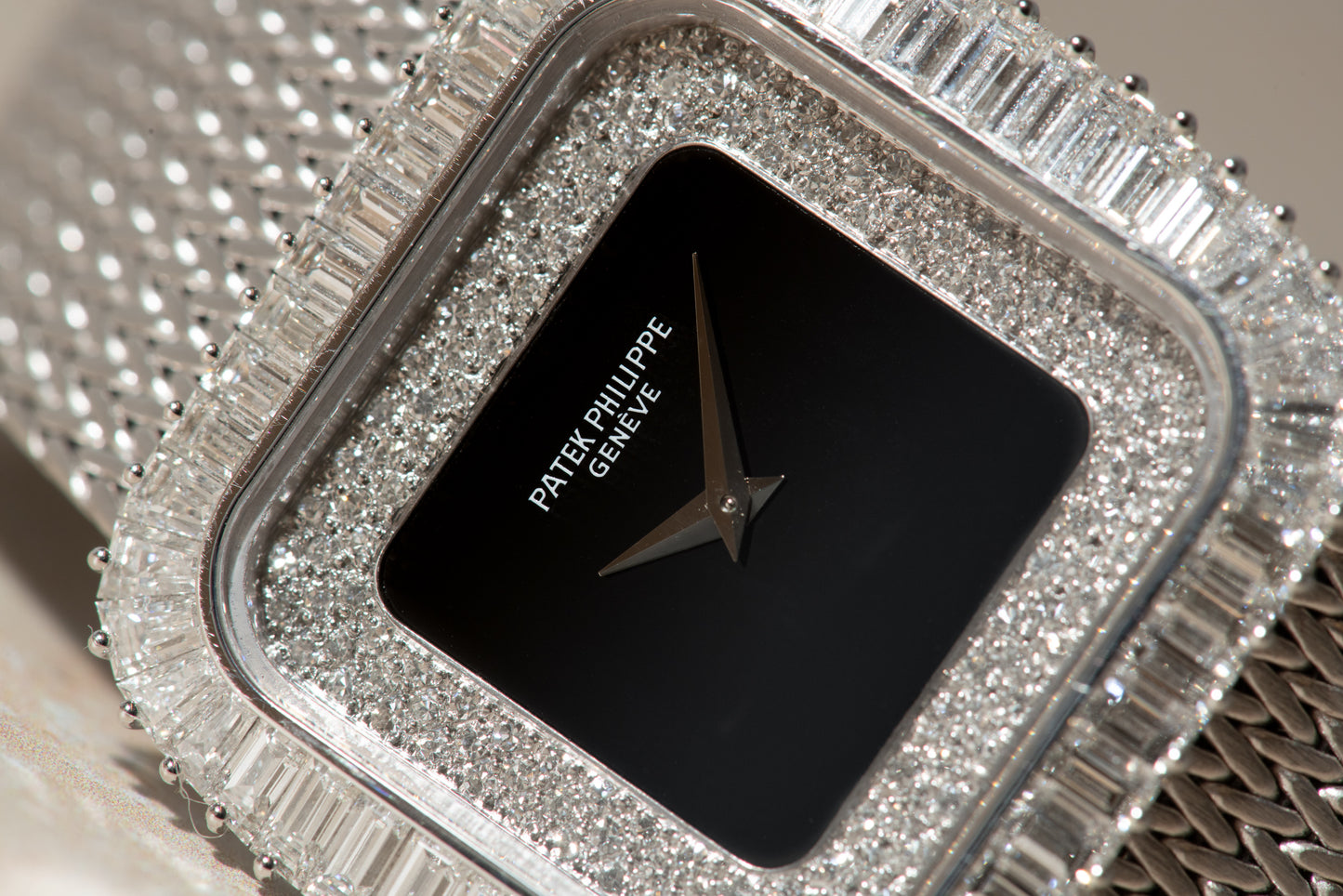 Constructed out of solid 18k white gold with a matching woven bracelet, this 32mm x 30mm 'TV' case piece features a sapphire crystal, a pave-diamond dial with a deep black Onyx stone center, a white gold 'dauphine' handset, and an absolutely gorgeous, baguette diamond-set bezel framing it all up. Inside, Patek Philippe's Calibre 16-250 movement is manually wound via a signed, shrouded crown.