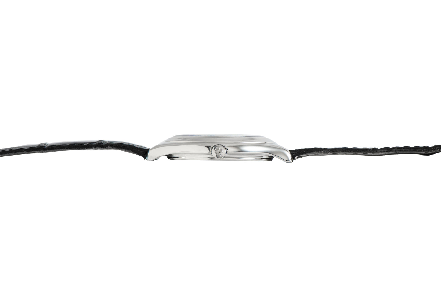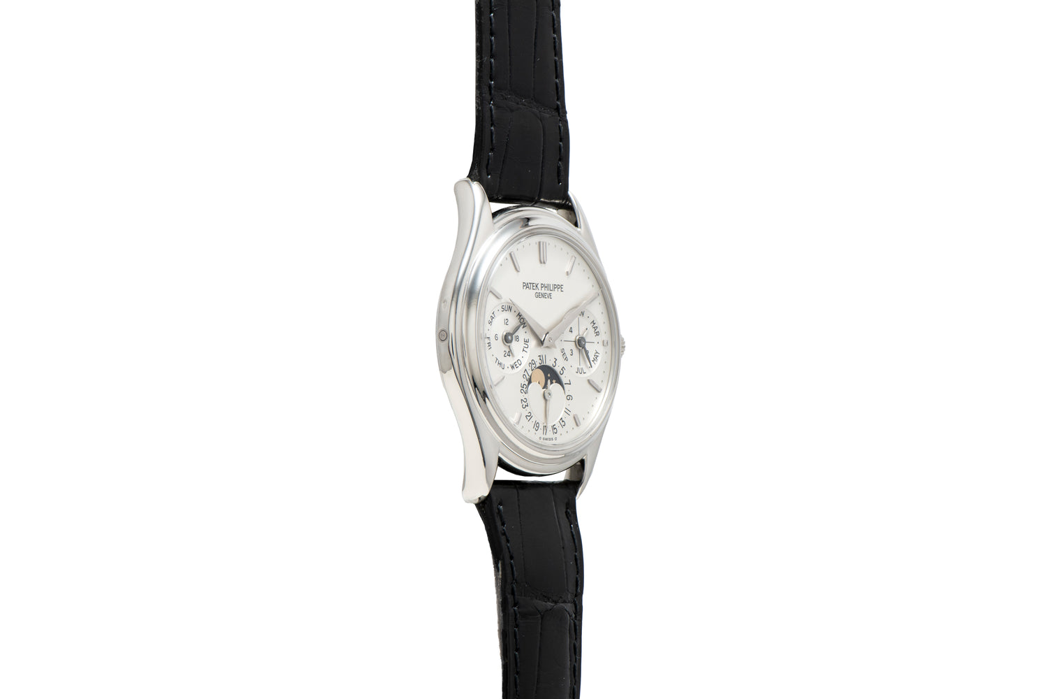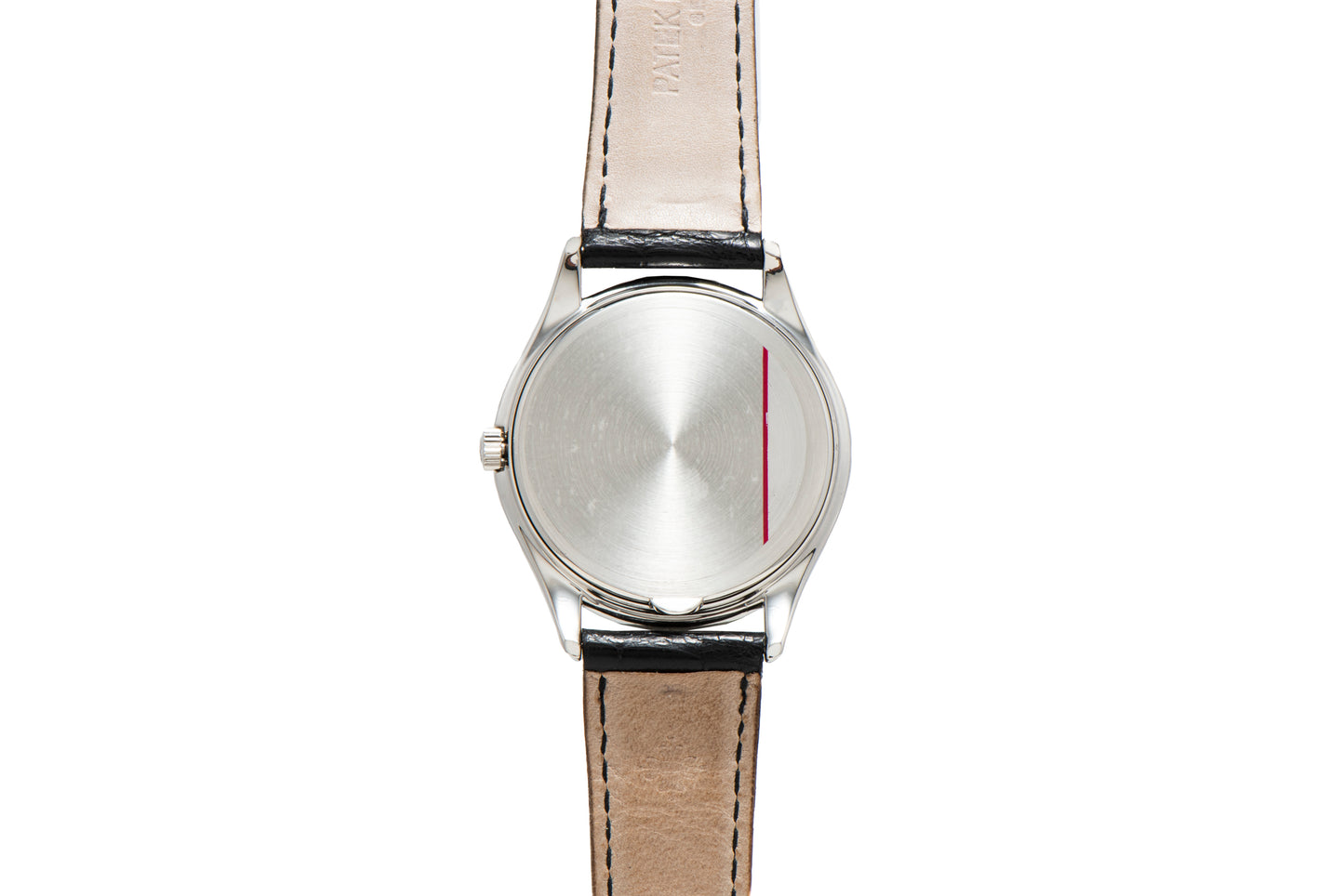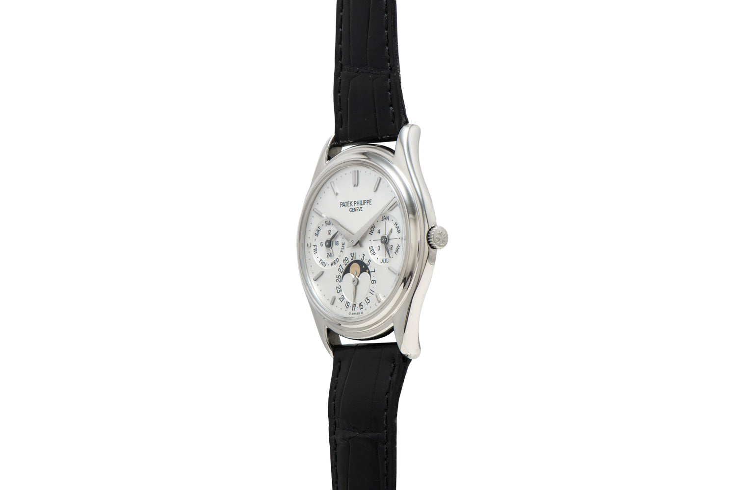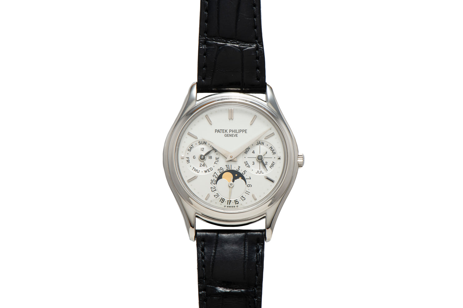 Made in several series and different metals, the watch we have here is a 3940P. Housed in a 36mm platinum case, it features a sapphire crystal, signed crown, a polished bezel, and one hell of a dial: Silver with white gold dauphine hands, it has a combination month/leap year indicator at 3 o’clock; a moon phase/date wheel at 6 o’clock; and a day/24-hour indicator at 9 o’clock. Simple, elegant and refined, it’s a design that was positively revolutionary in the 1980s, and still looks stunning today.